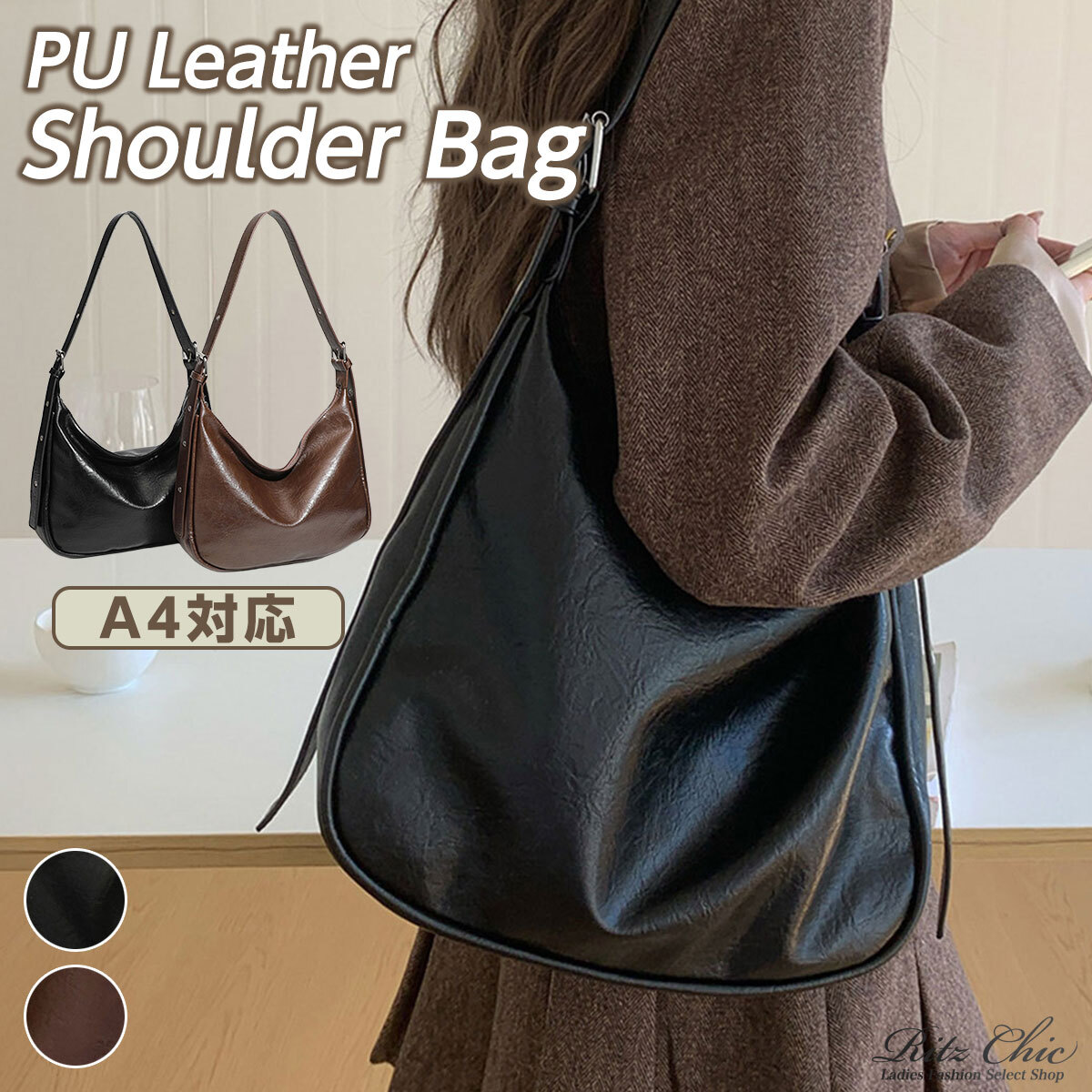 柔らかく上品な風合いのPUレザーで仕上げ、シンプルながらトレンド感のあるフォルムで、デイリースタイルに映えてくれるワンショルダーバッグです。