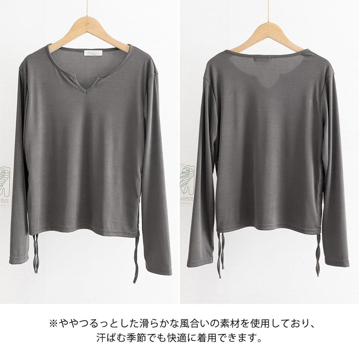 サイドドロスト Tシャツ 長袖 レディース 韓国 春秋 おしゃれ 大人 かわいい ガーリー フェミニン ショート丈 リボン ドローストリング キーネック 薄手 大人可愛い 大人女子