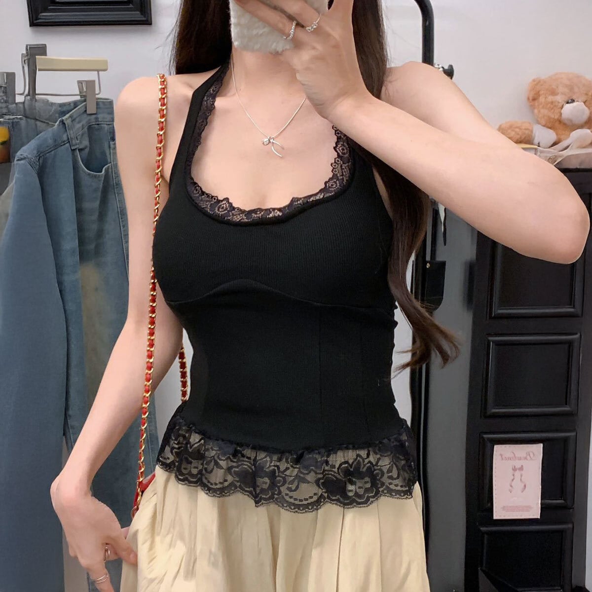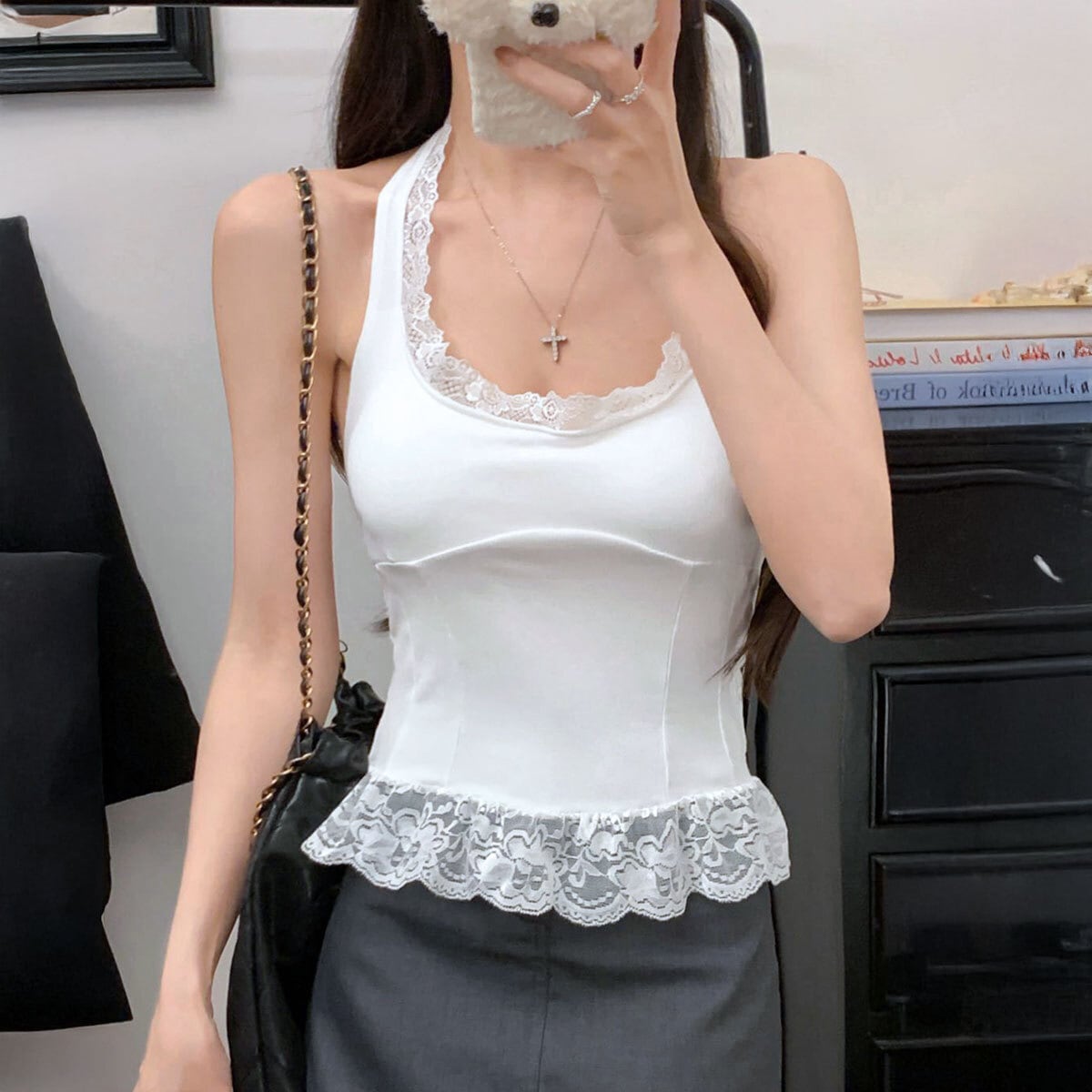 ◇裾に繊細なフリルレースを施したタンクトップ。
