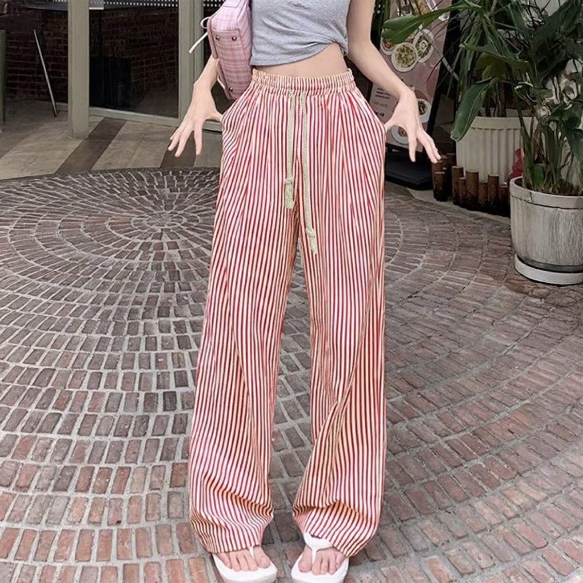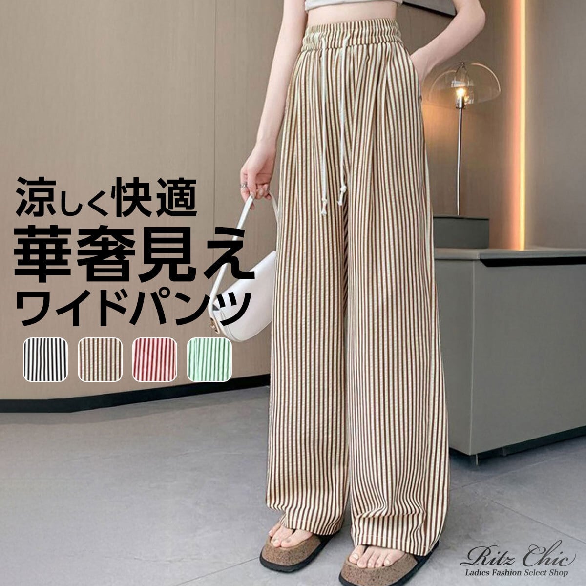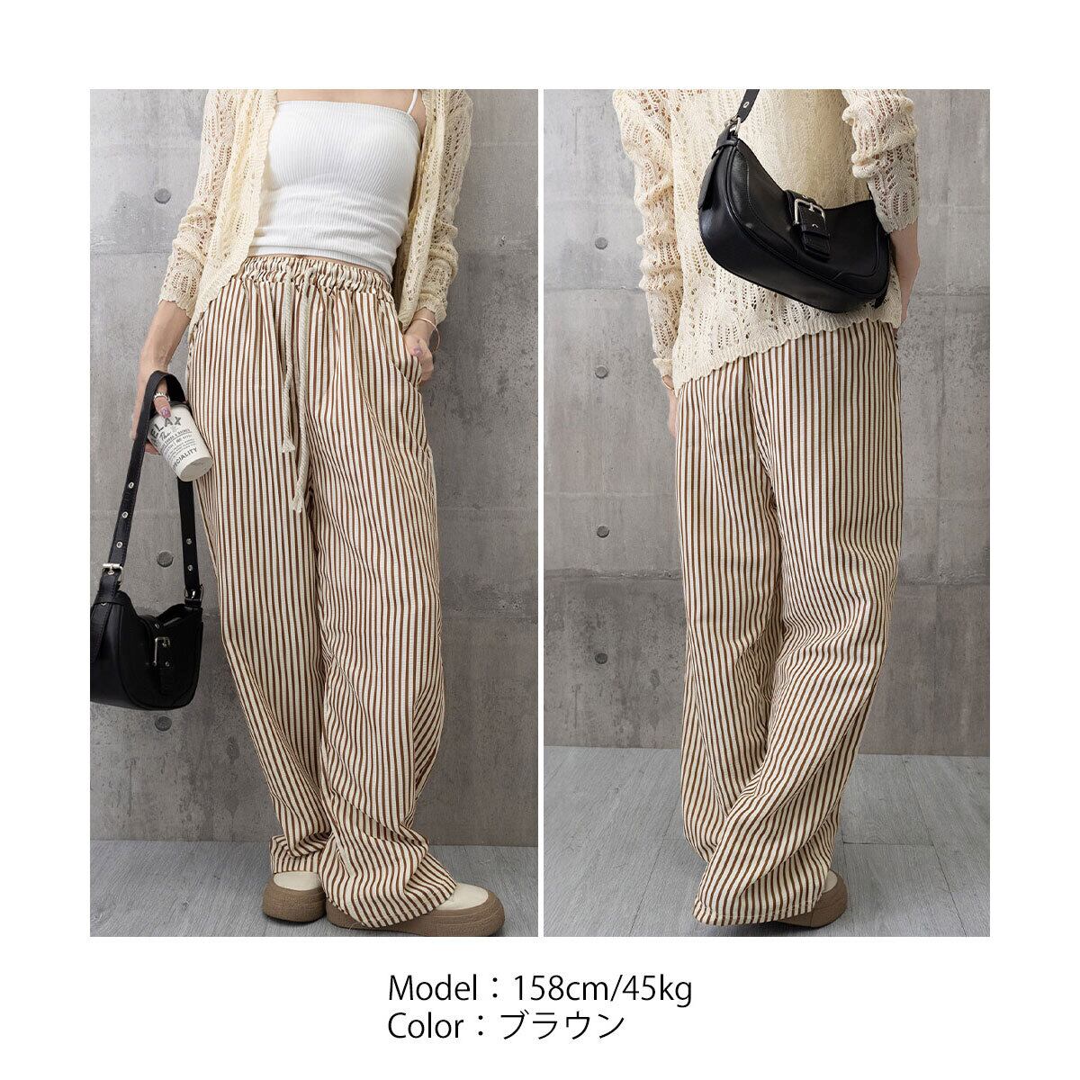 ワイドパンツ ストライプ レディース 春夏 韓国 涼しい 薄手 ルームウェア 大人 カジュアル おしゃれ かわいい ゆったり リラックス ウエストゴム 大人可愛い 大人女子
