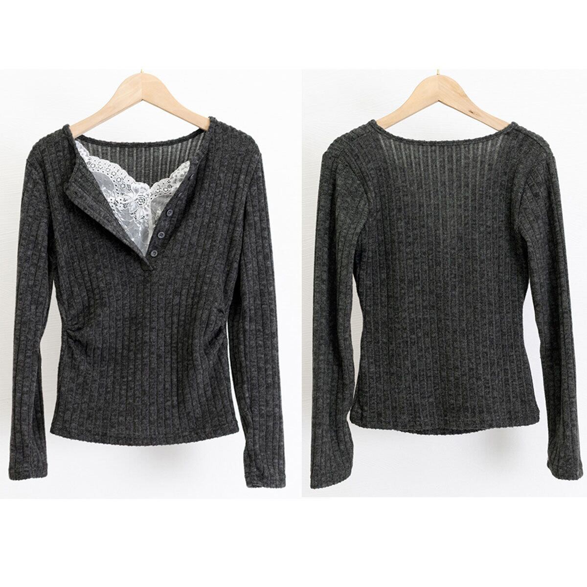 女性らしさを引き立てるレースのディテールが、シンプルながらもアクセントになって、女性らしさを引き立ててくれるリブニットの長袖トップスです。