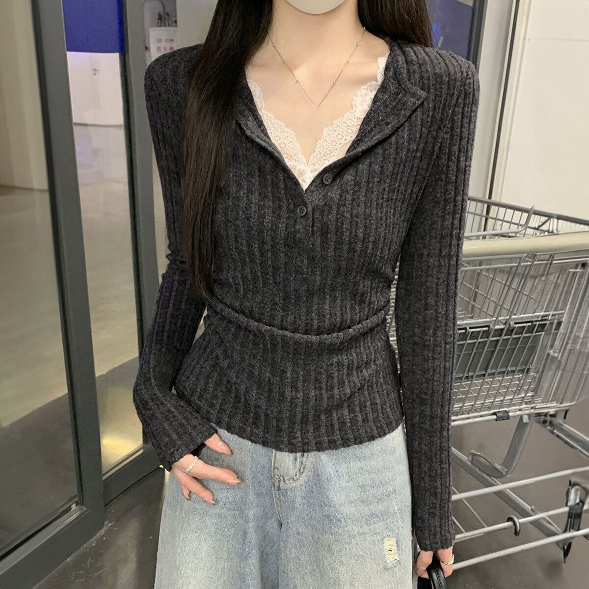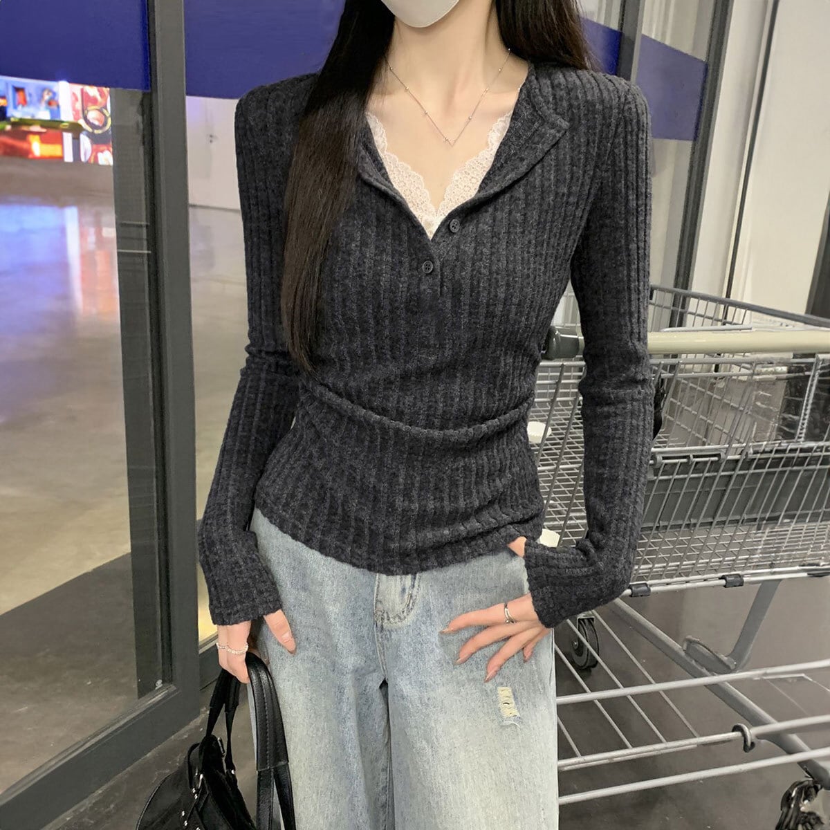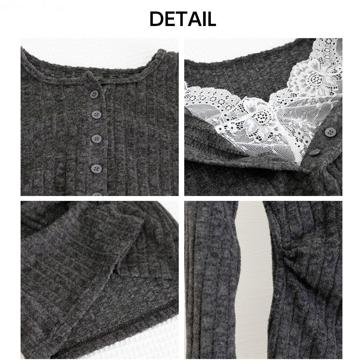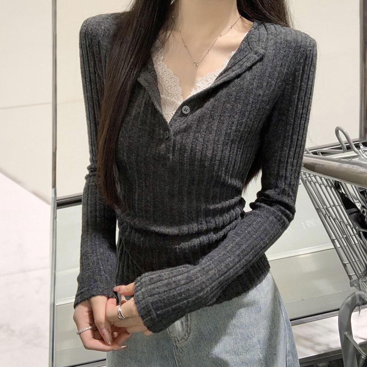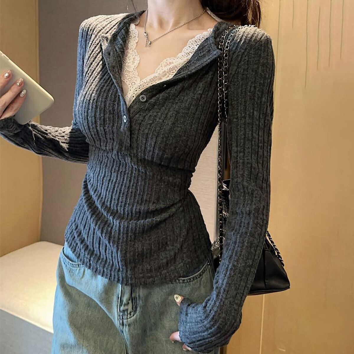 レース付き リブニット 長袖 レディース 春秋 トップス 韓国 大人 きれいめ シンプル タイト Tシャツ 薄手 細身 伸縮性 フィット感 カジュアル 大人可愛い 大人女子