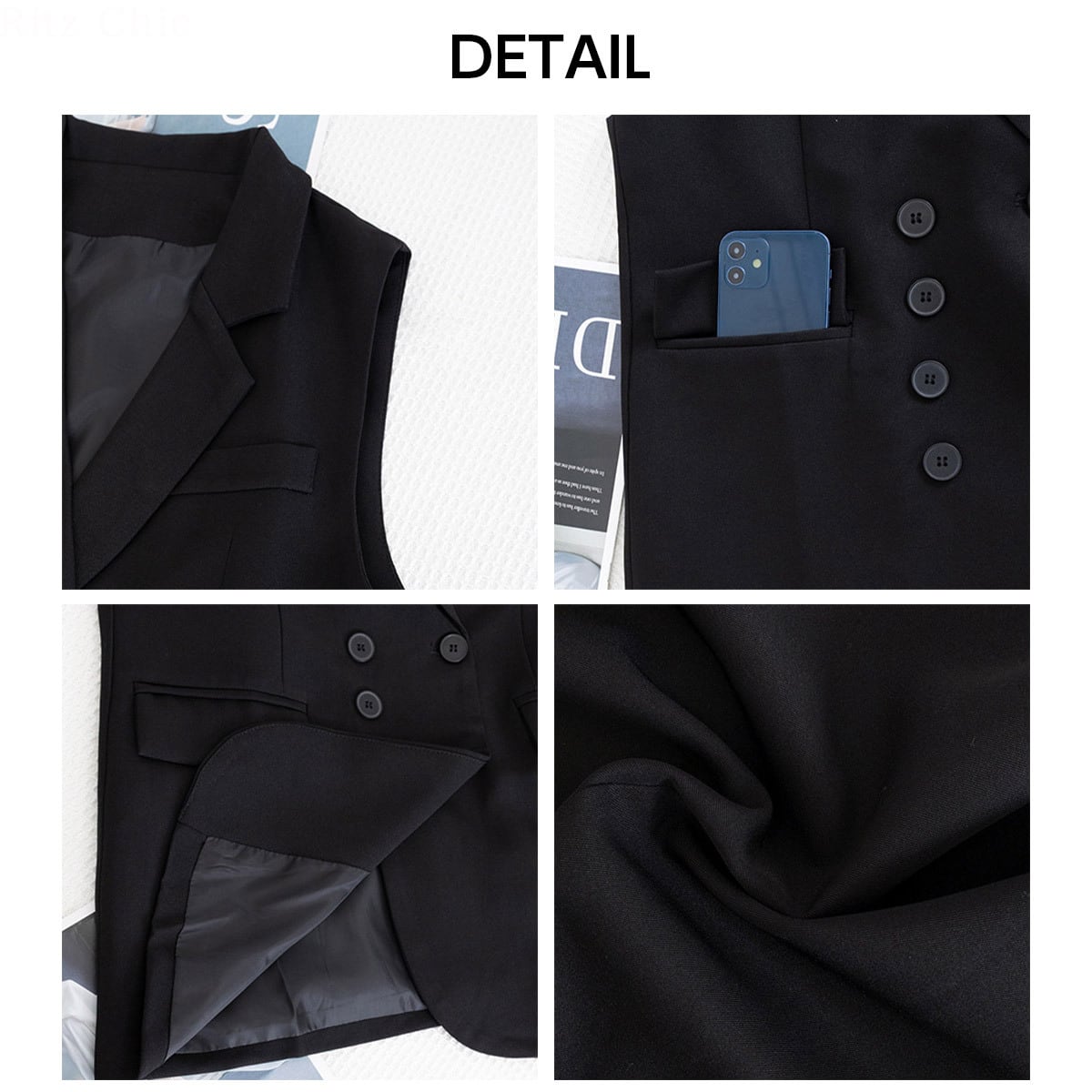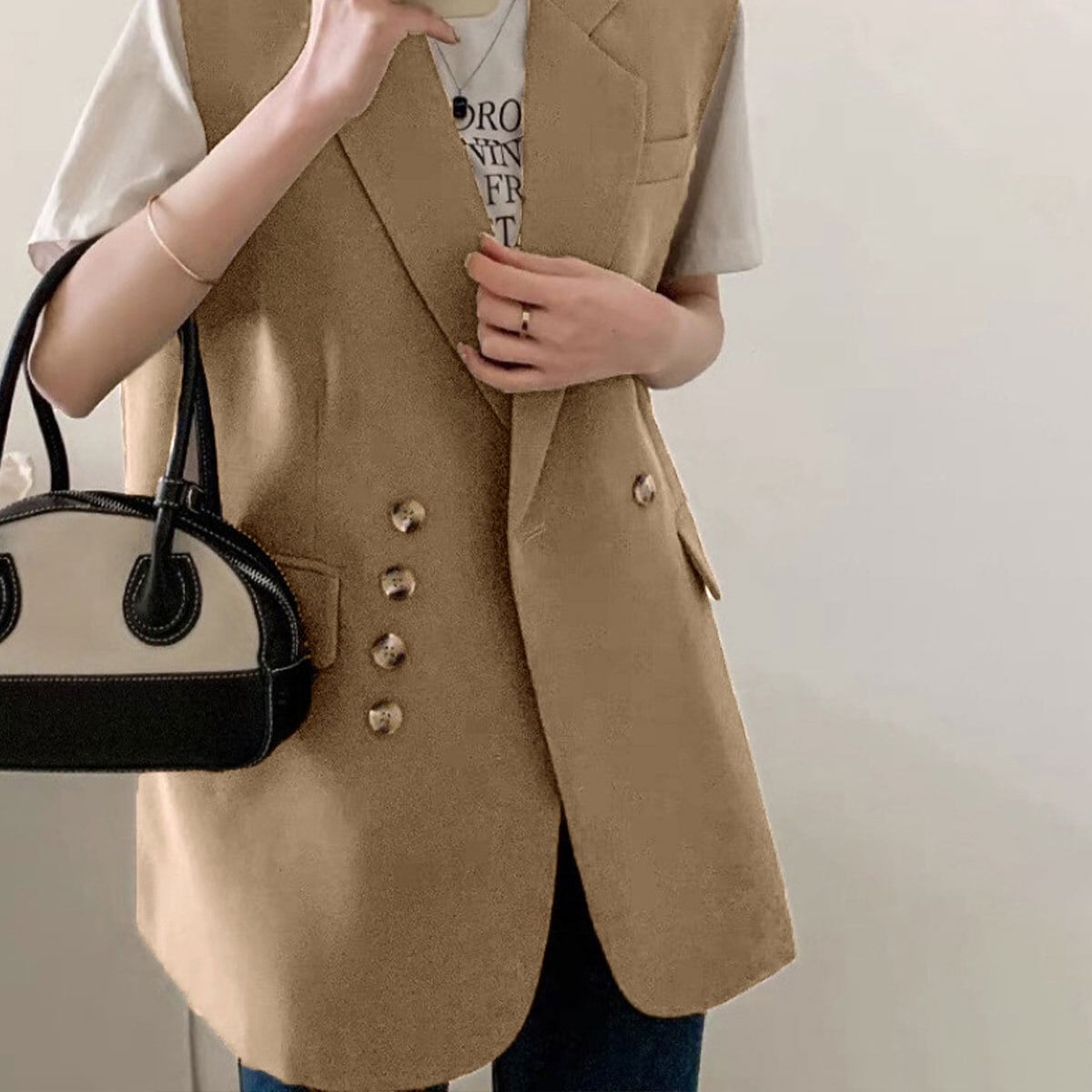 トレンド感あふれるダブルブレストで、シンプルで洗練されたデザインが周りの目を惹くテーラードジレです。