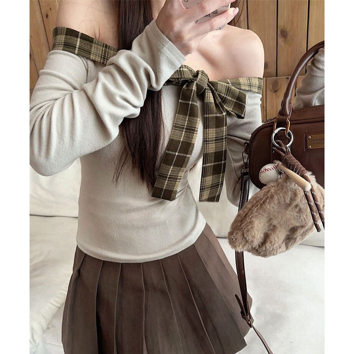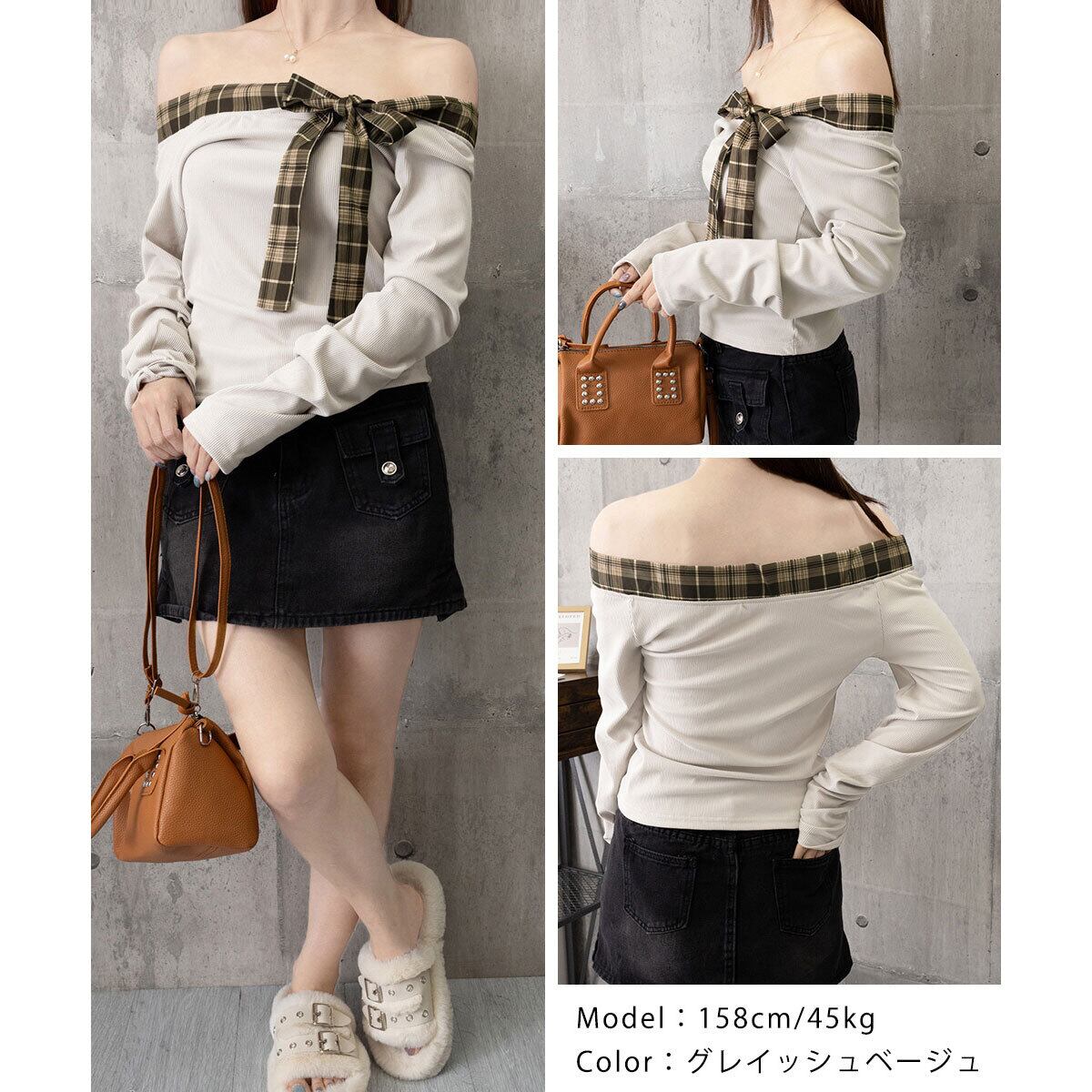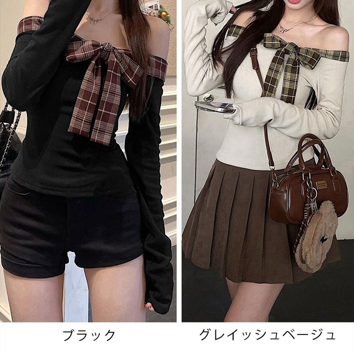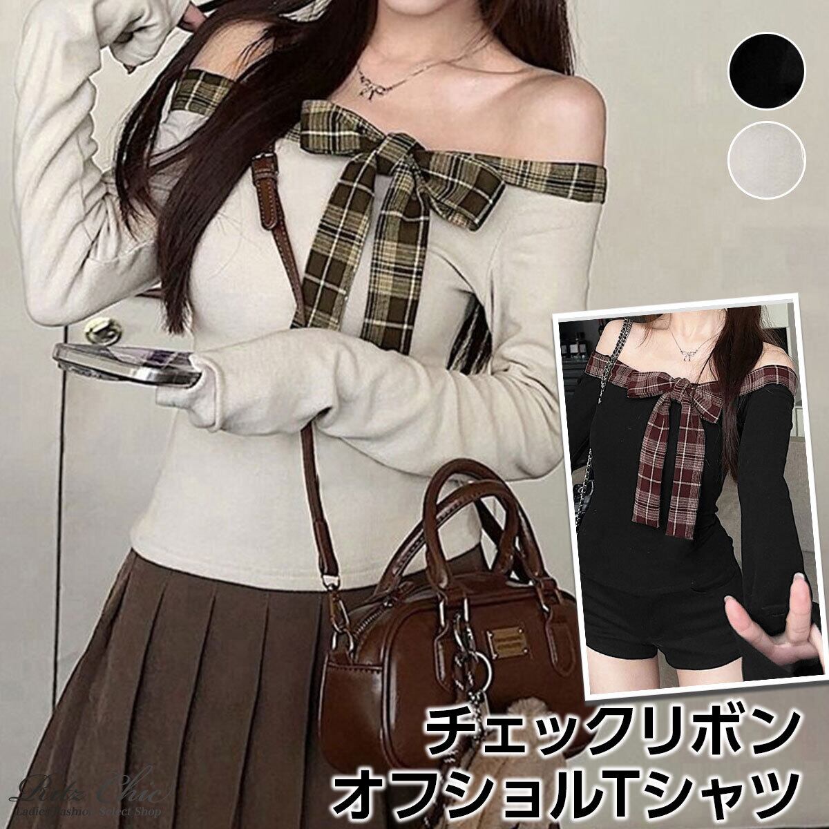 オフショルダー 長袖 Tシャツ レディース 春秋 韓国 チェック リボン おしゃれ 大人 かわいい フェミニン ガーリー 肩見せ 肩出し トップス 大人可愛い 大人女子
