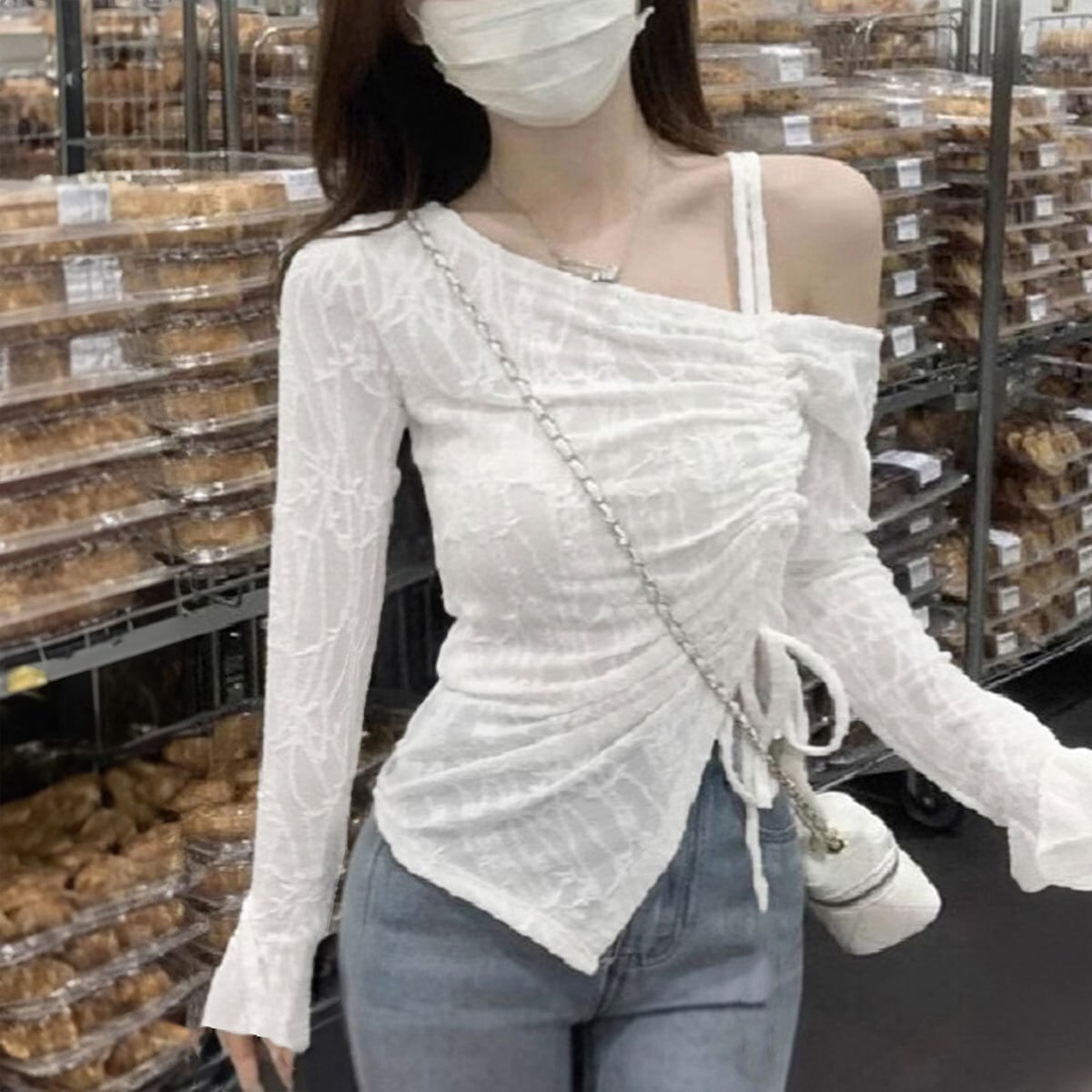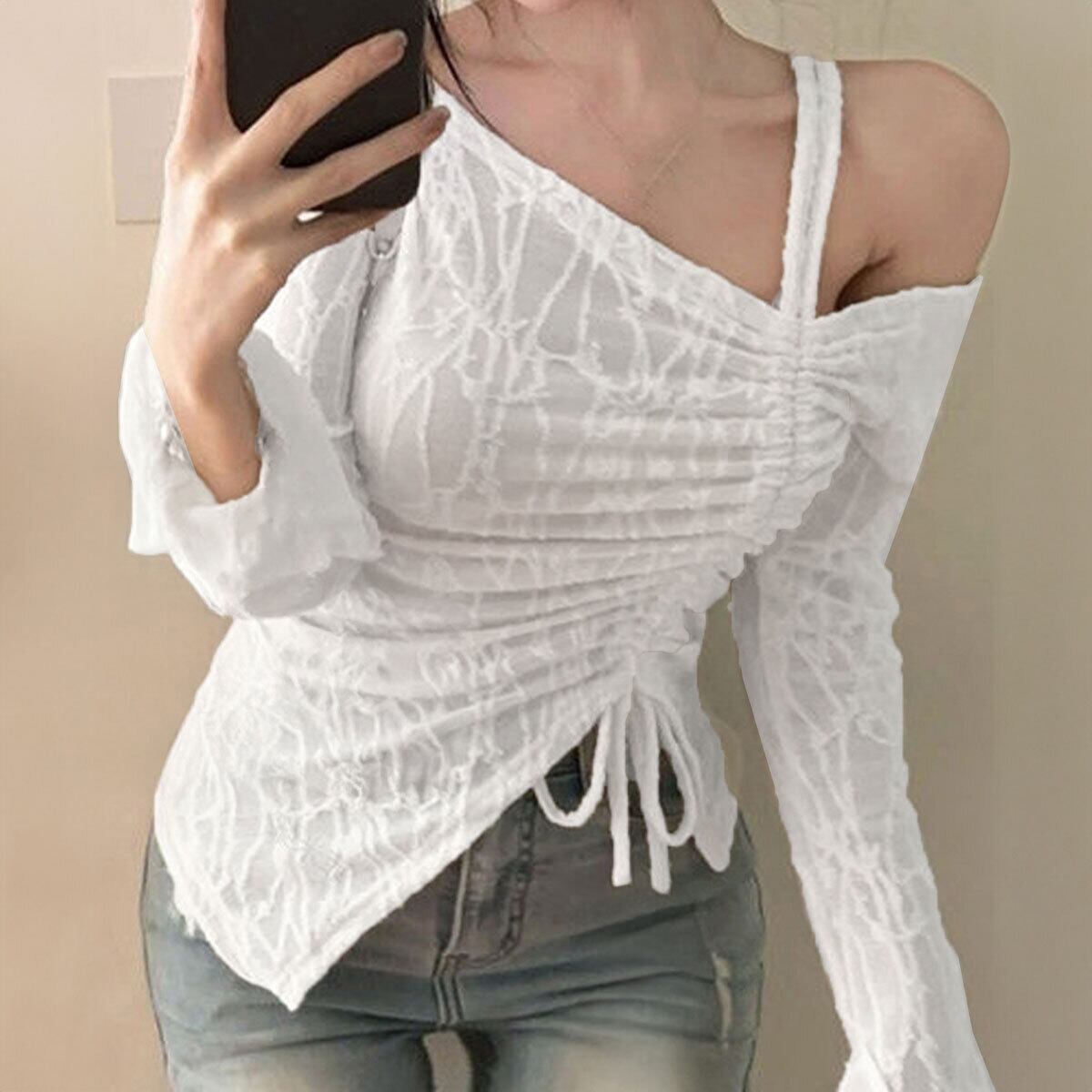 ワンショルダー Tシャツ 長袖 レディース 春秋 トップス 韓国 透け感 レース おしゃれ きれいめ 大人 かわいい カジュアル ギャザー アシンメトリー シースルー 肩出し 薄手 大人可愛い 大人女子