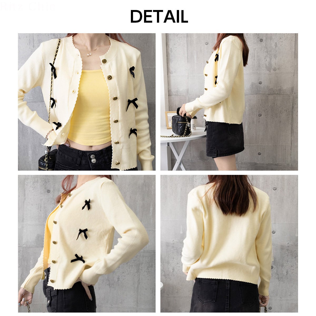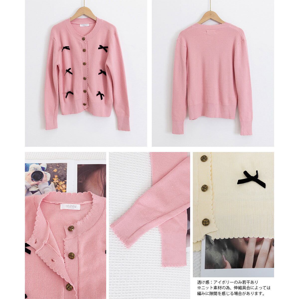 胸元に散りばめられた立体的なリボンが、上品で女性らしい雰囲気を添え、大人可愛い印象を与えてくれるニットカーディガンです。