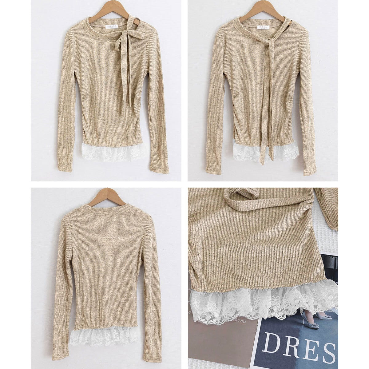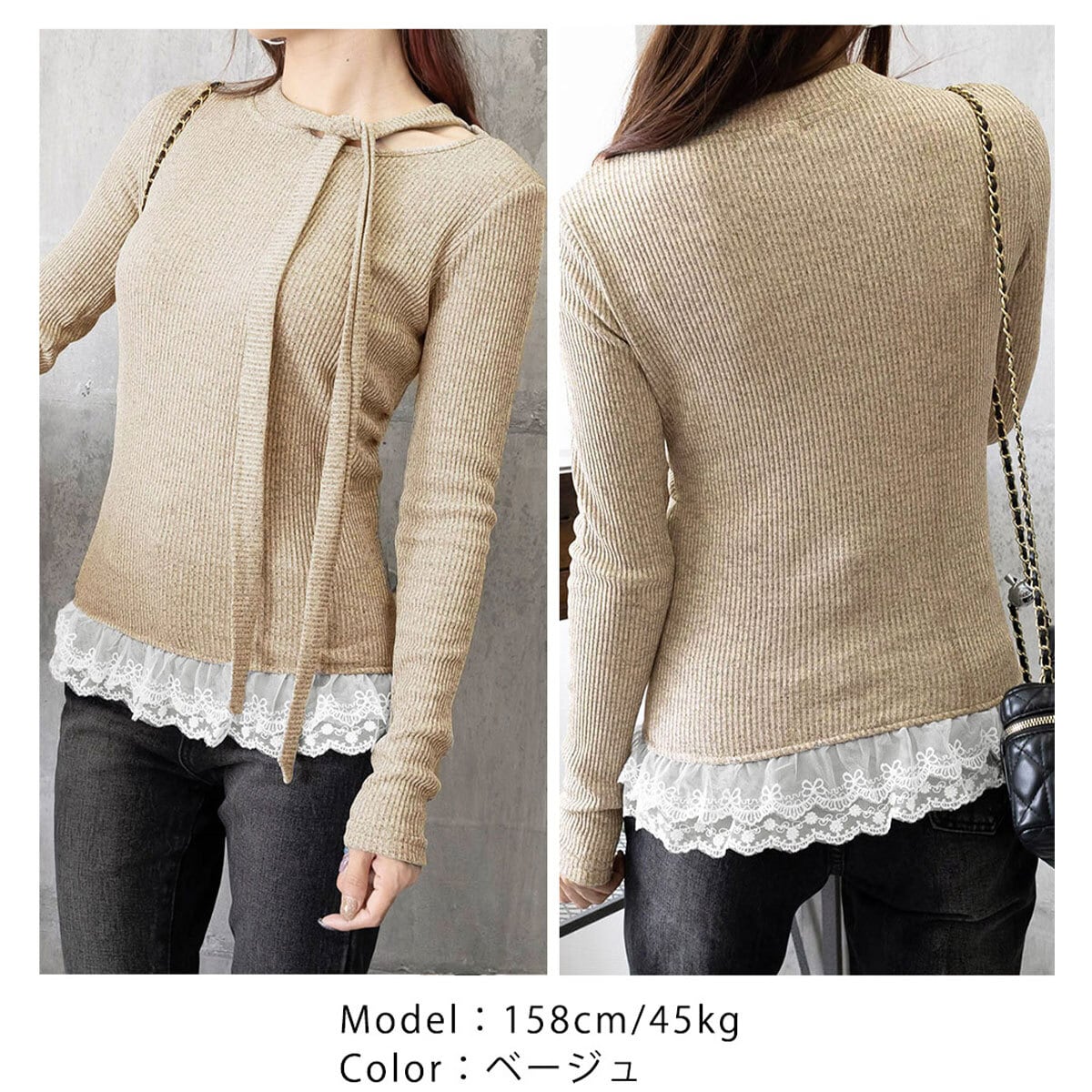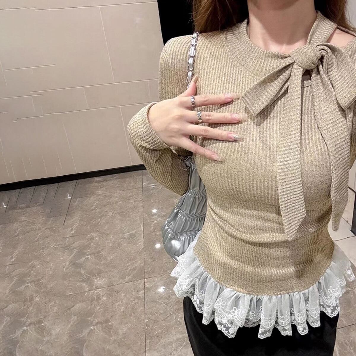 裾レース ニット 長袖 リボンネック レディース 春秋 韓国 リブニット おしゃれ 大人 かわいい フェミニン レイヤード 重ね着風 ボウタイニット 大人可愛い 大人女子
