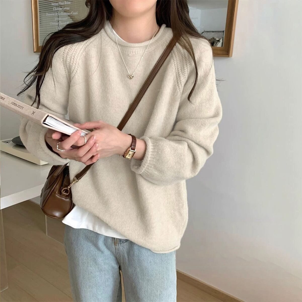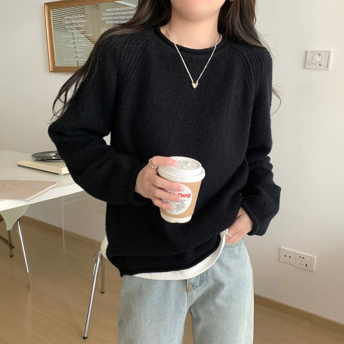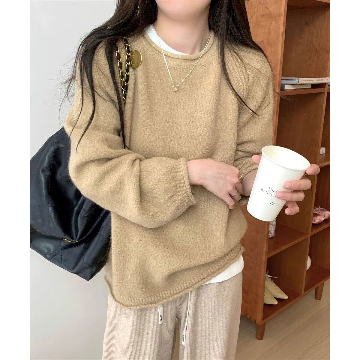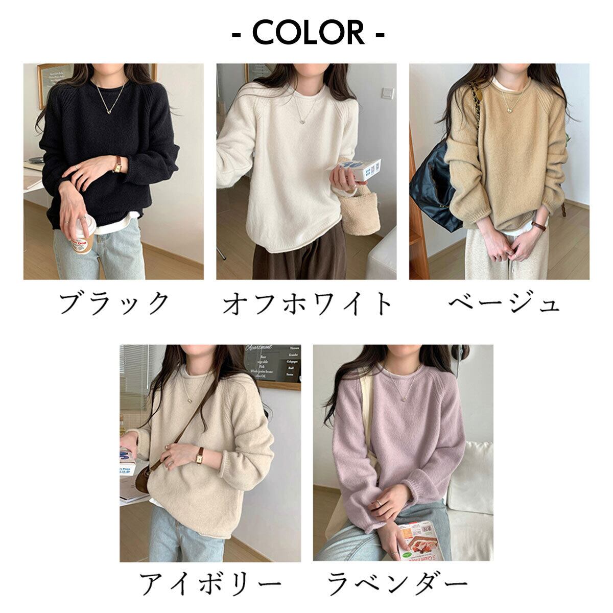 シンプルながらもラグランスリーブの編み地ディテールが、さりげないアクセントになって、秋冬シーズンのカジュアルコーデにぴったりな1枚です。