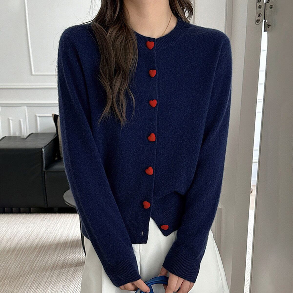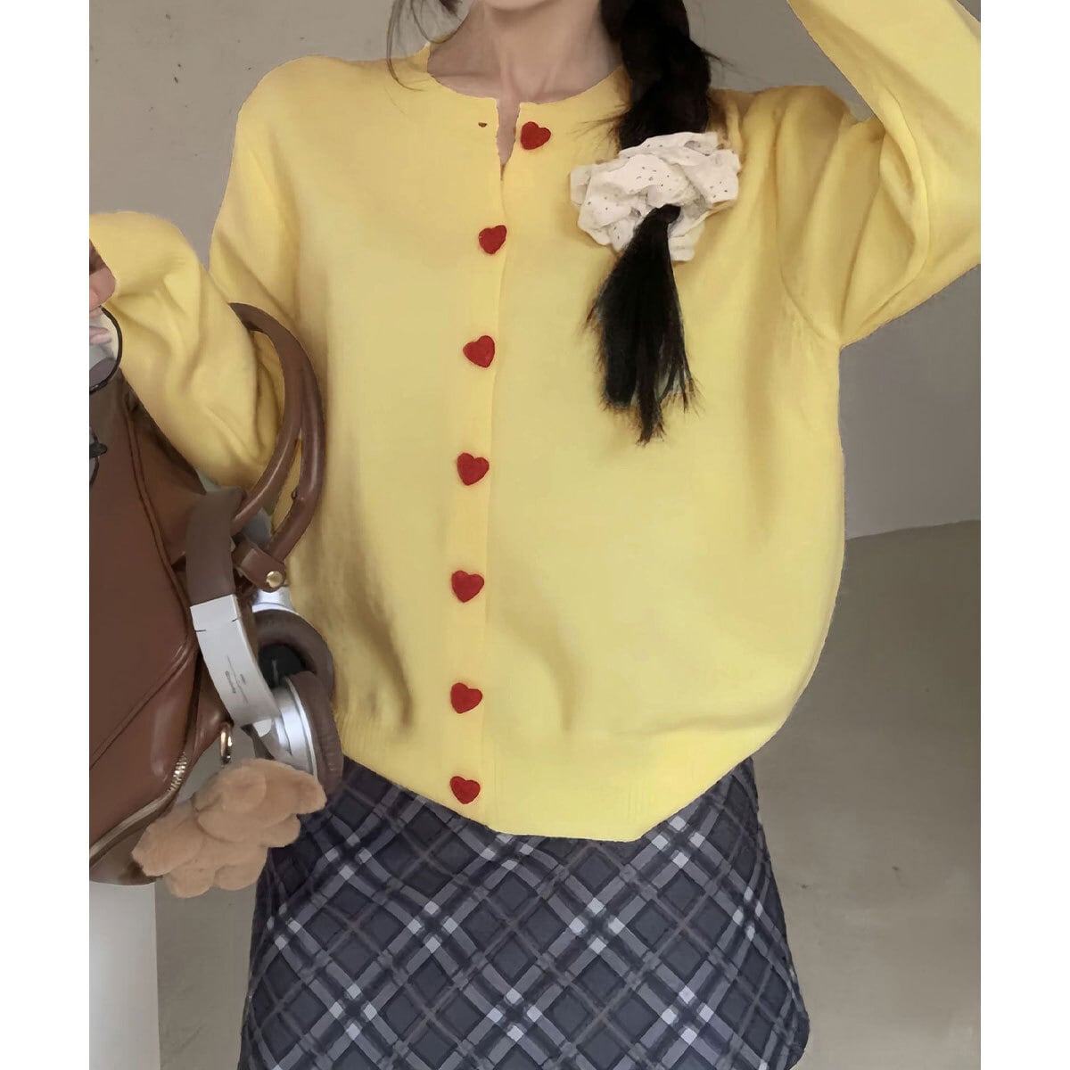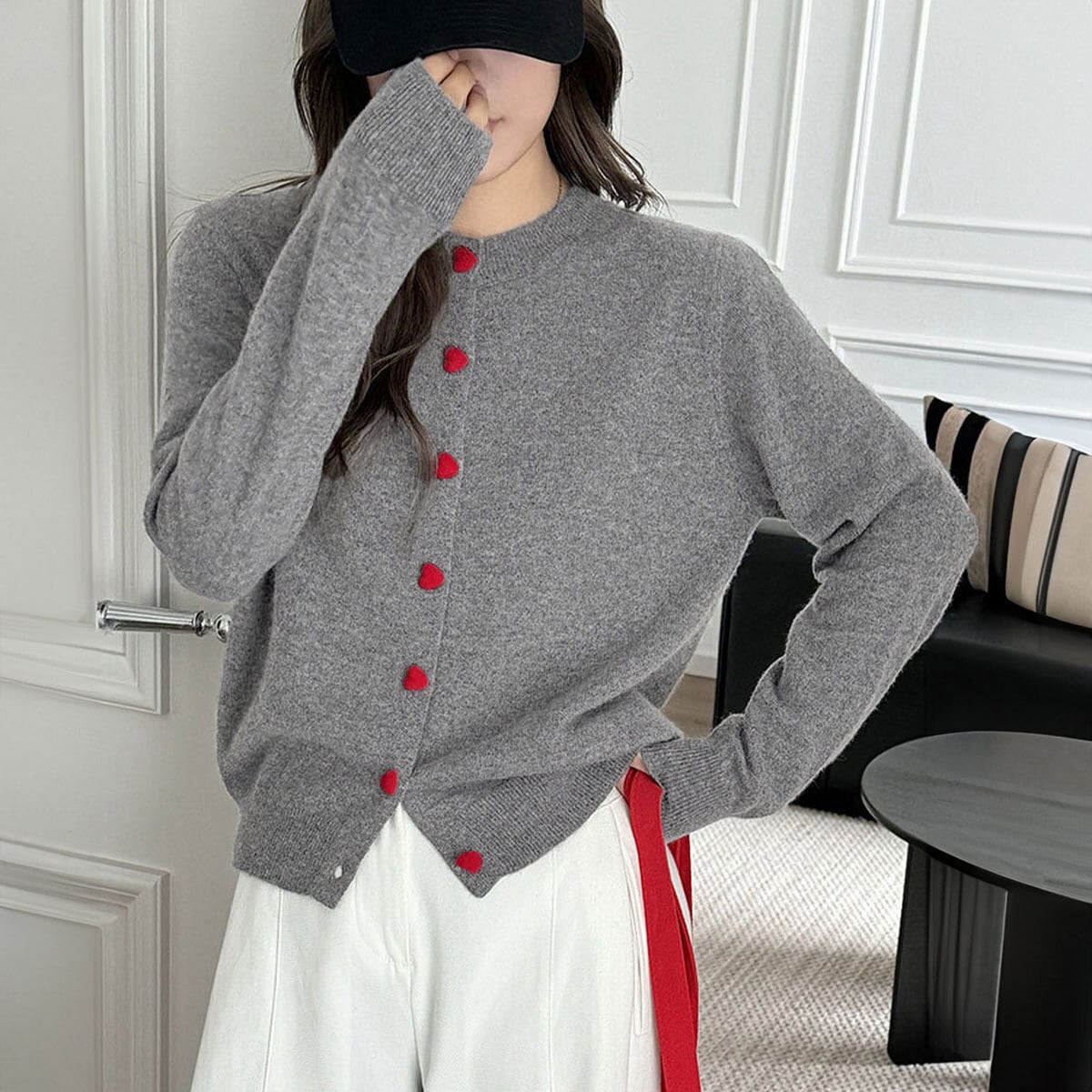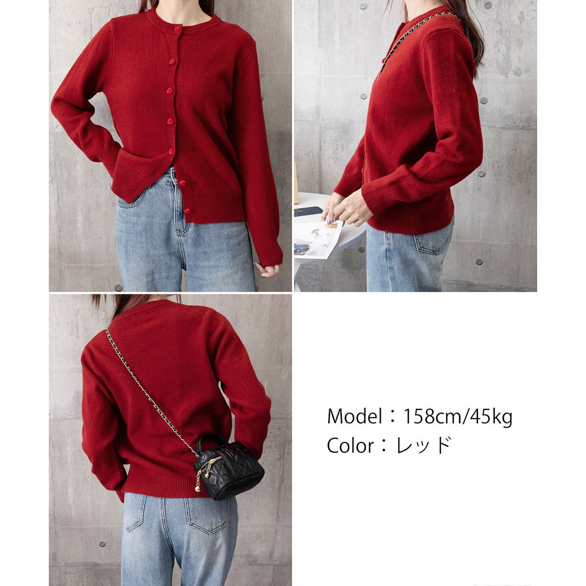 フロントのレッドハートボタンが愛らしい、ガーリー感たっぷりのニットカーディガンです。