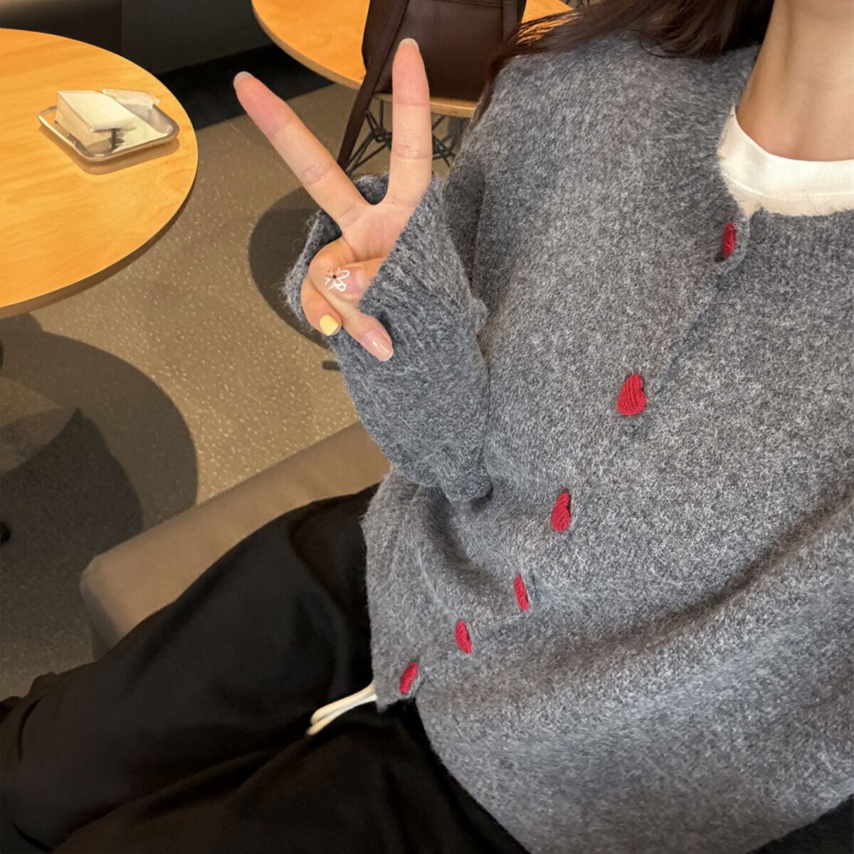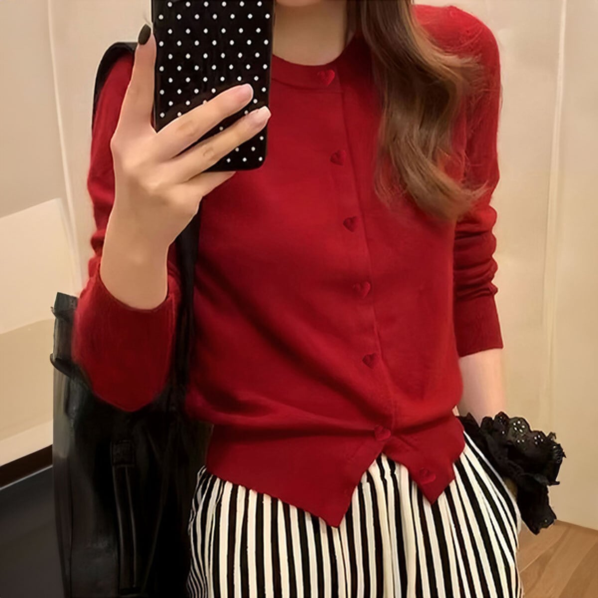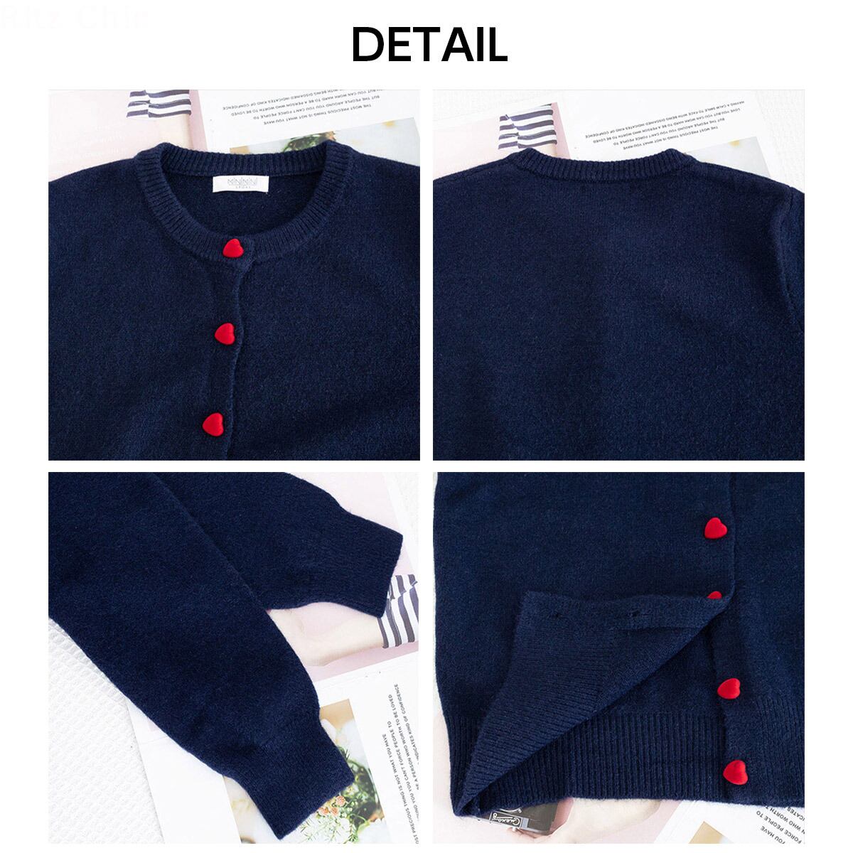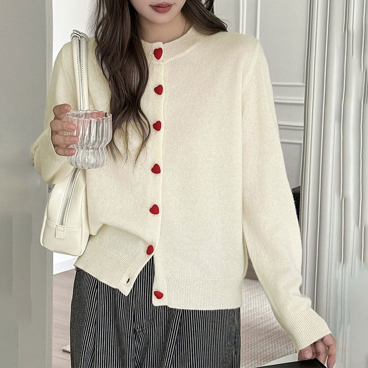 フロントのレッドハートボタンが愛らしい、ガーリー感たっぷりのニットカーディガンです。