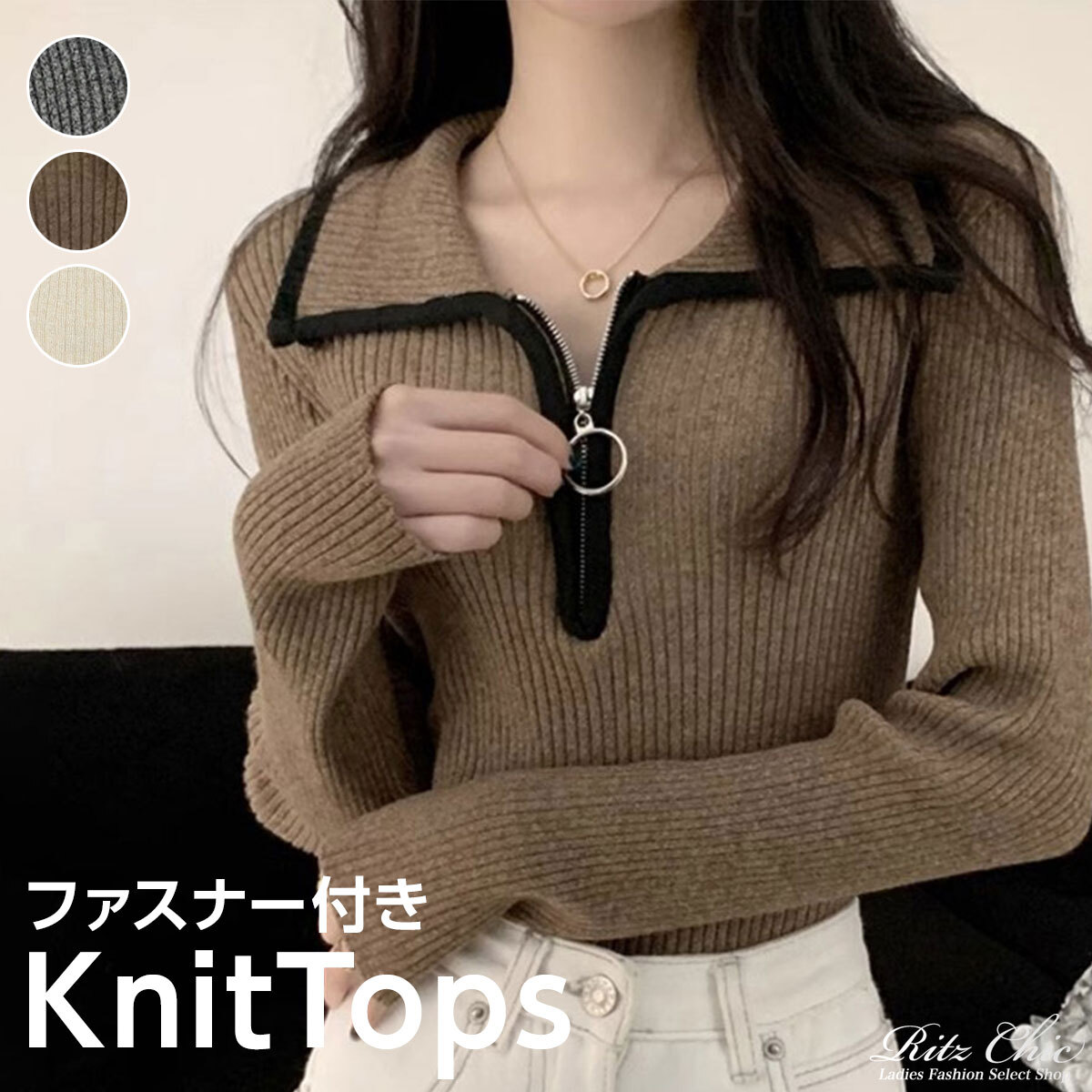 ファスナー付き ニット セーター 長袖 レディース 秋冬 韓国 おしゃれ 大人 カジュアル ハーフジップ リブニット きれいめ トップス インナー 大人可愛い 大人女子