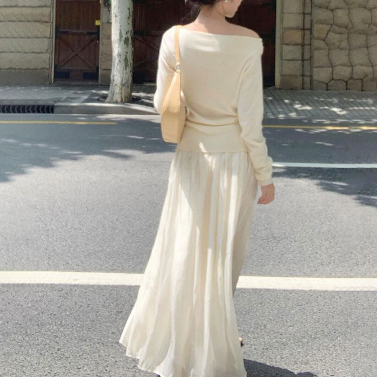 伸縮性抜群のなめらかなニット生地で、ボディラインを美しく演出してくれる韓国風デザインのオフショルダートップスです。