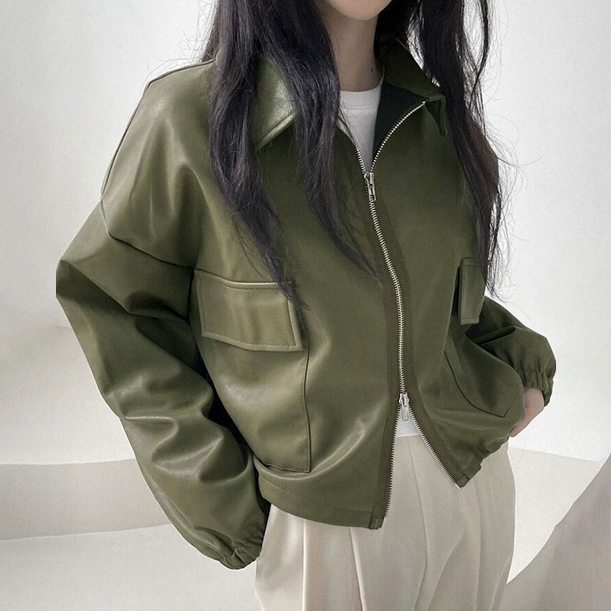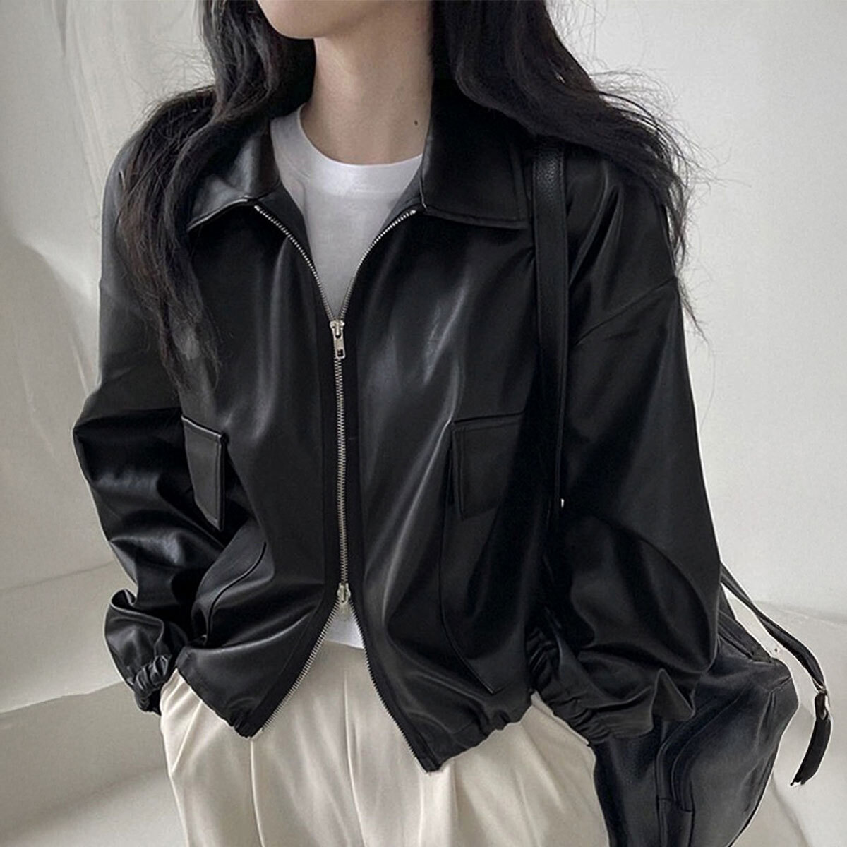 秋冬にぴったりな高級感を纏うPUレザー素材で、折り襟の付いたレトロなデザインが、スタイリッシュな大人の女性らしい雰囲気を演出してくれるライダースジャケットです。