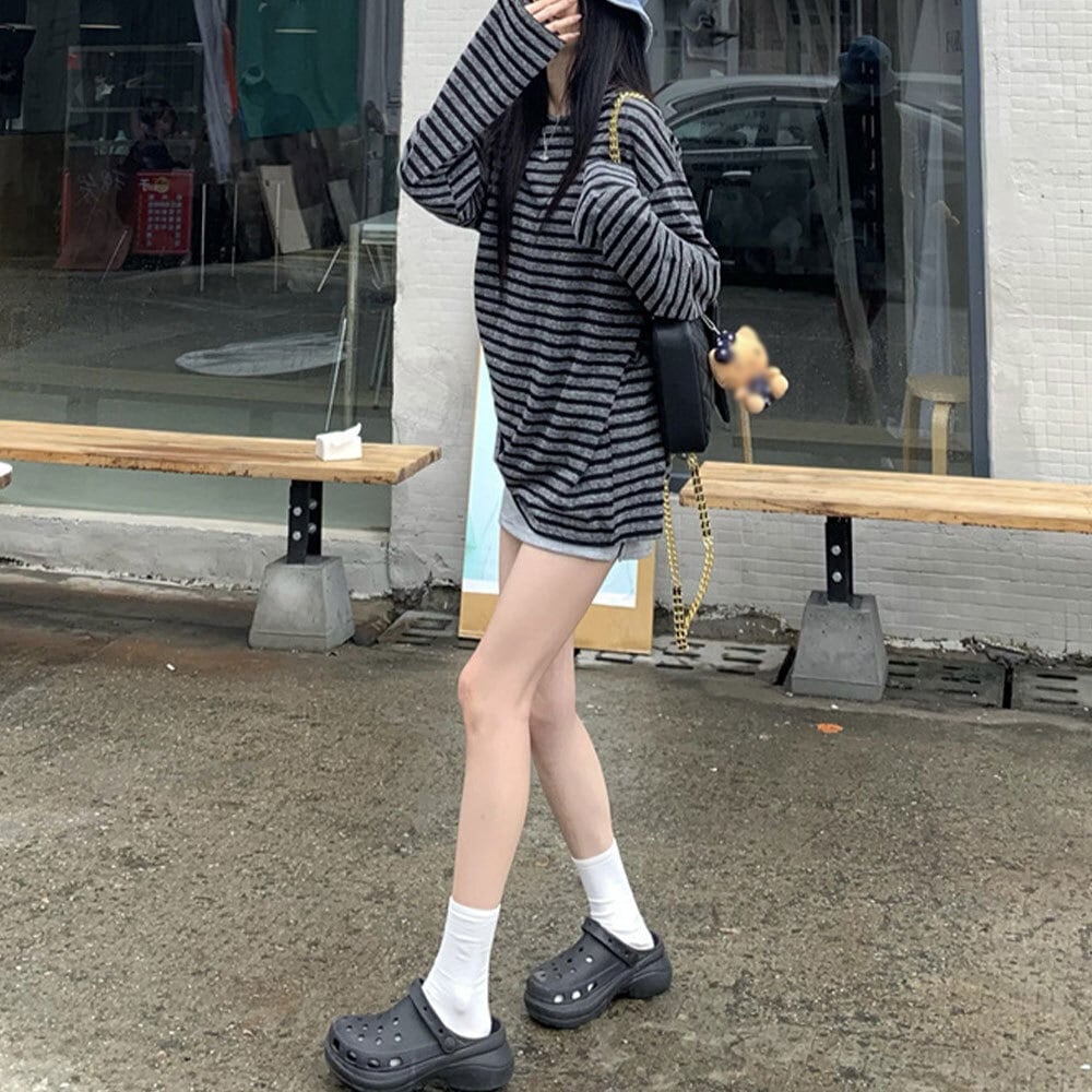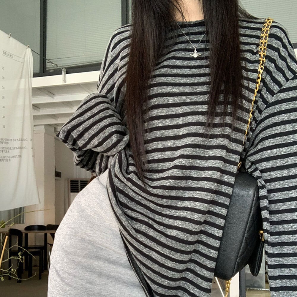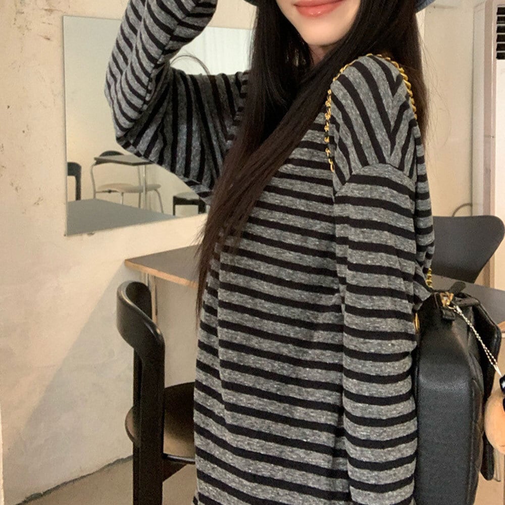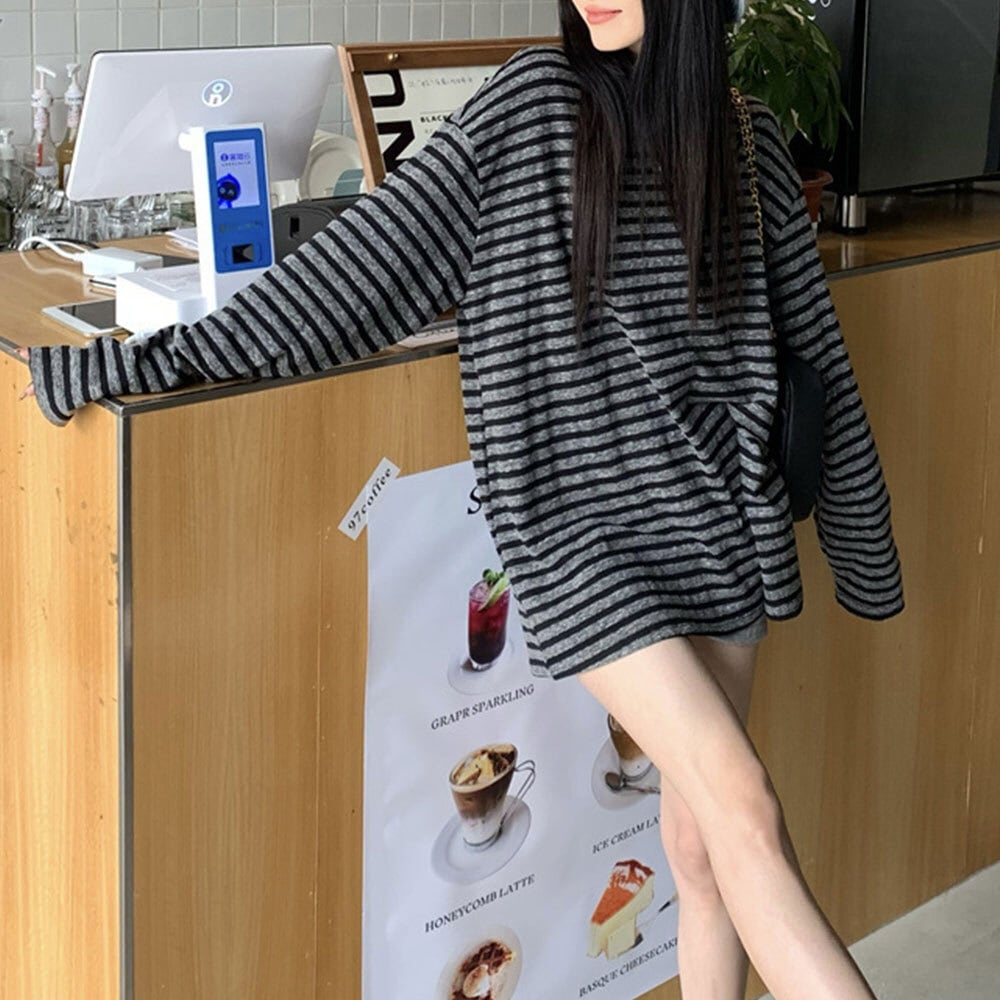 ゆったりとしたルーズなシルエットに、カジュアルなボーダー柄が印象的な長袖Tシャツです。