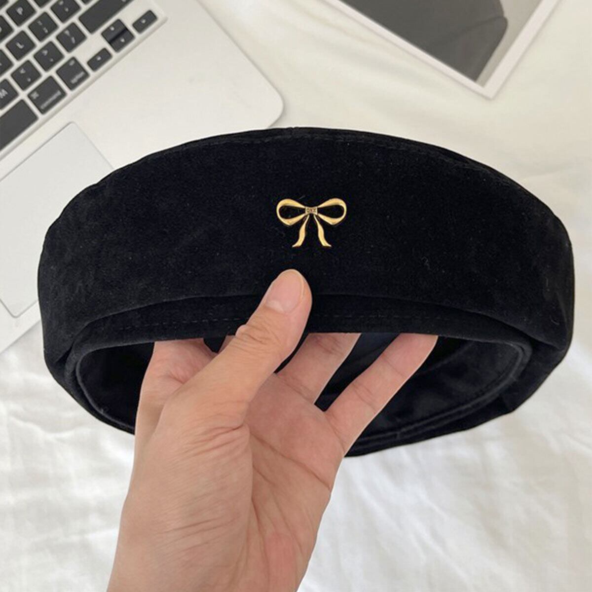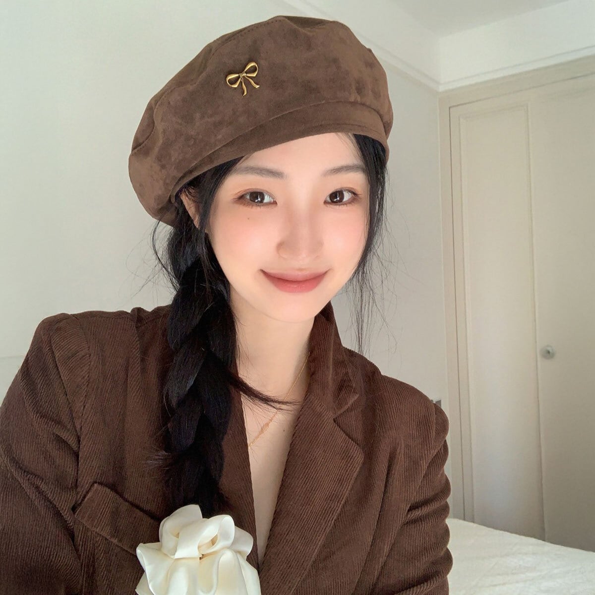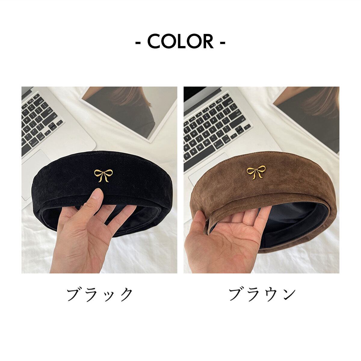 スエード調の柔らかな素材がクラシックな雰囲気を演出し、フロントに施された小さなリボン飾りが上品な印象を与えてくれるベレー帽です。