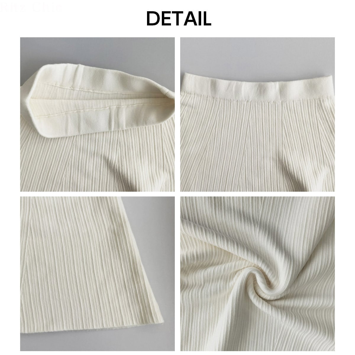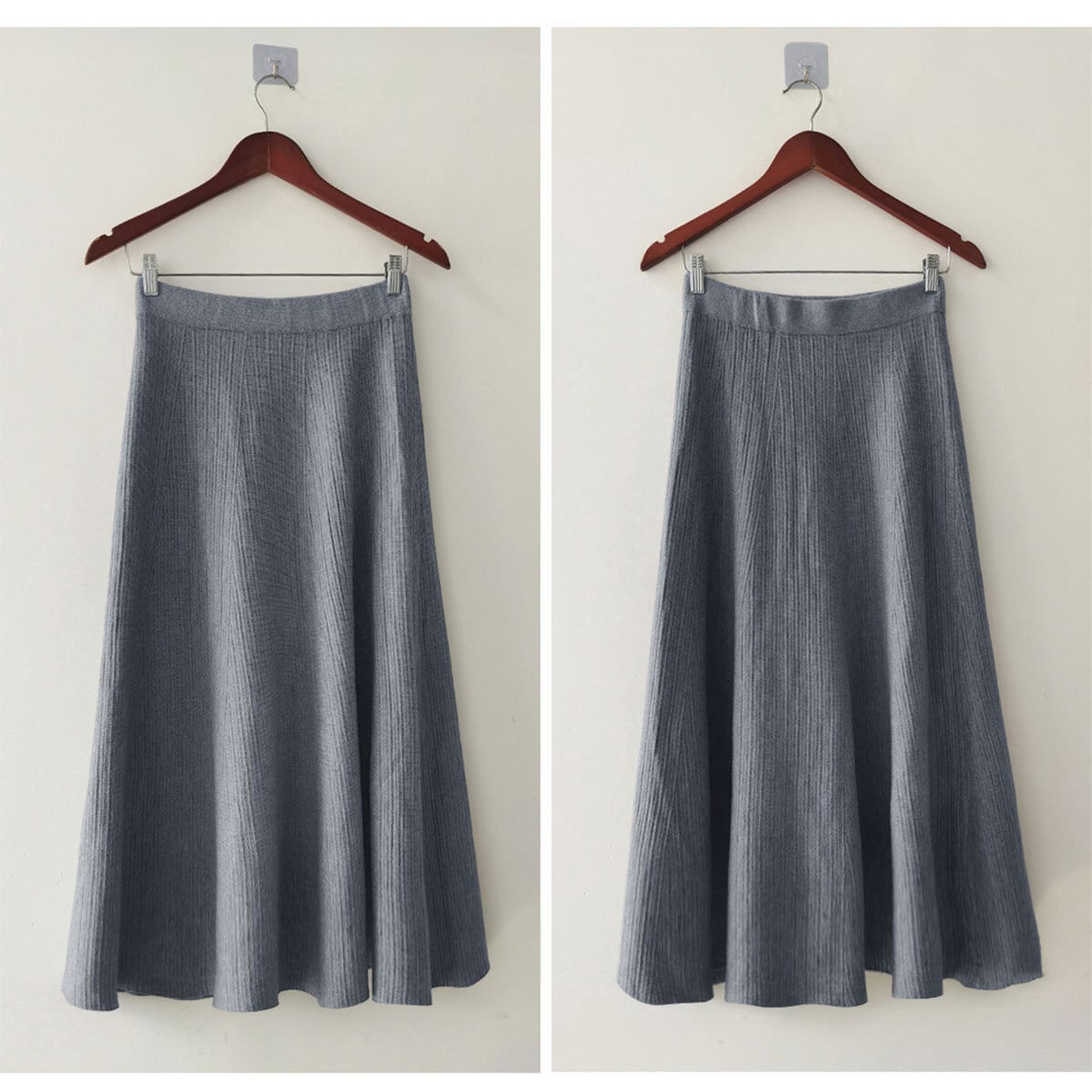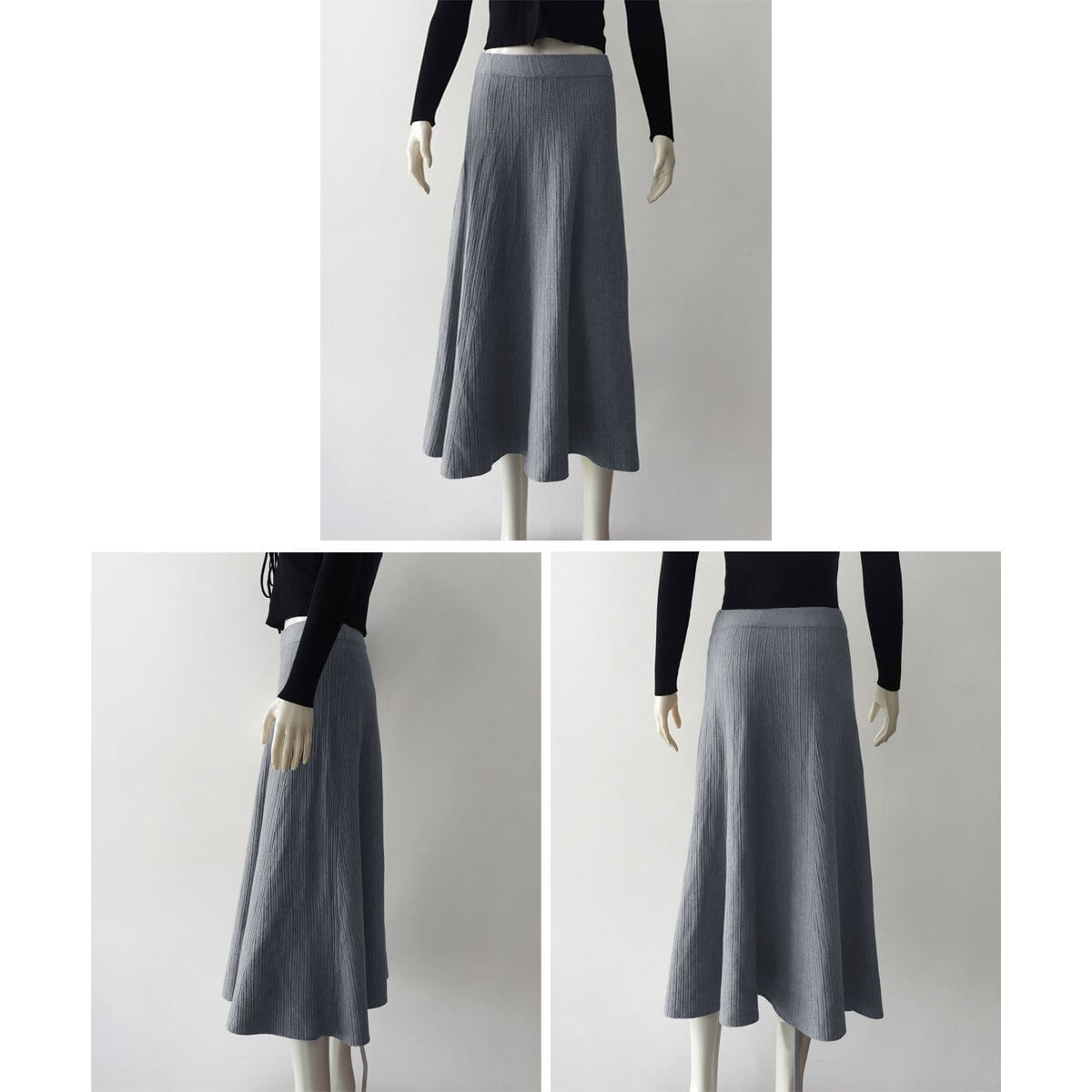 裾に向かって優雅に広がるフレアなシルエットが女性らしさを引き立て、季節感あふれるニット生地が秋冬のコーディネートにぴったりなロングスカートです。