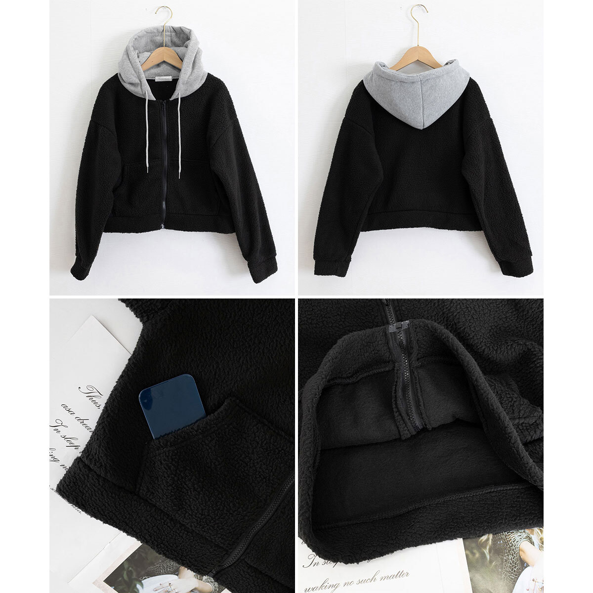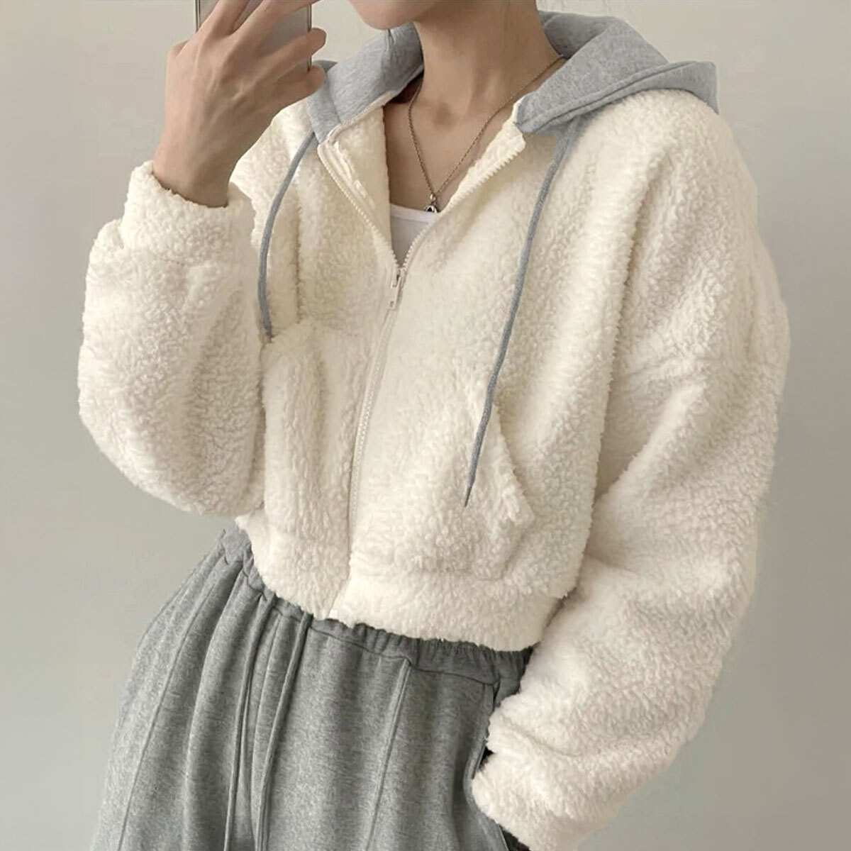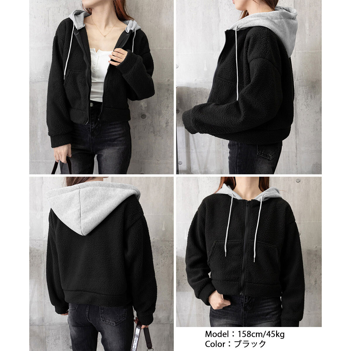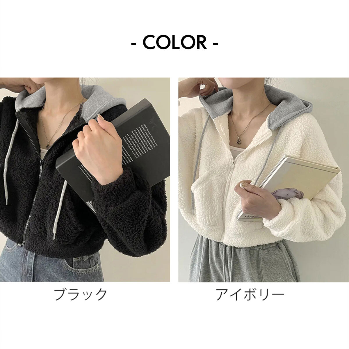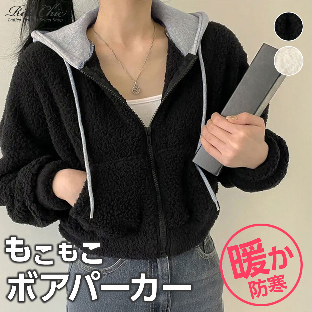 もこもこのボア素材で暖かく、防寒性とお洒落を両立させたショート丈のジップアップパーカーです。