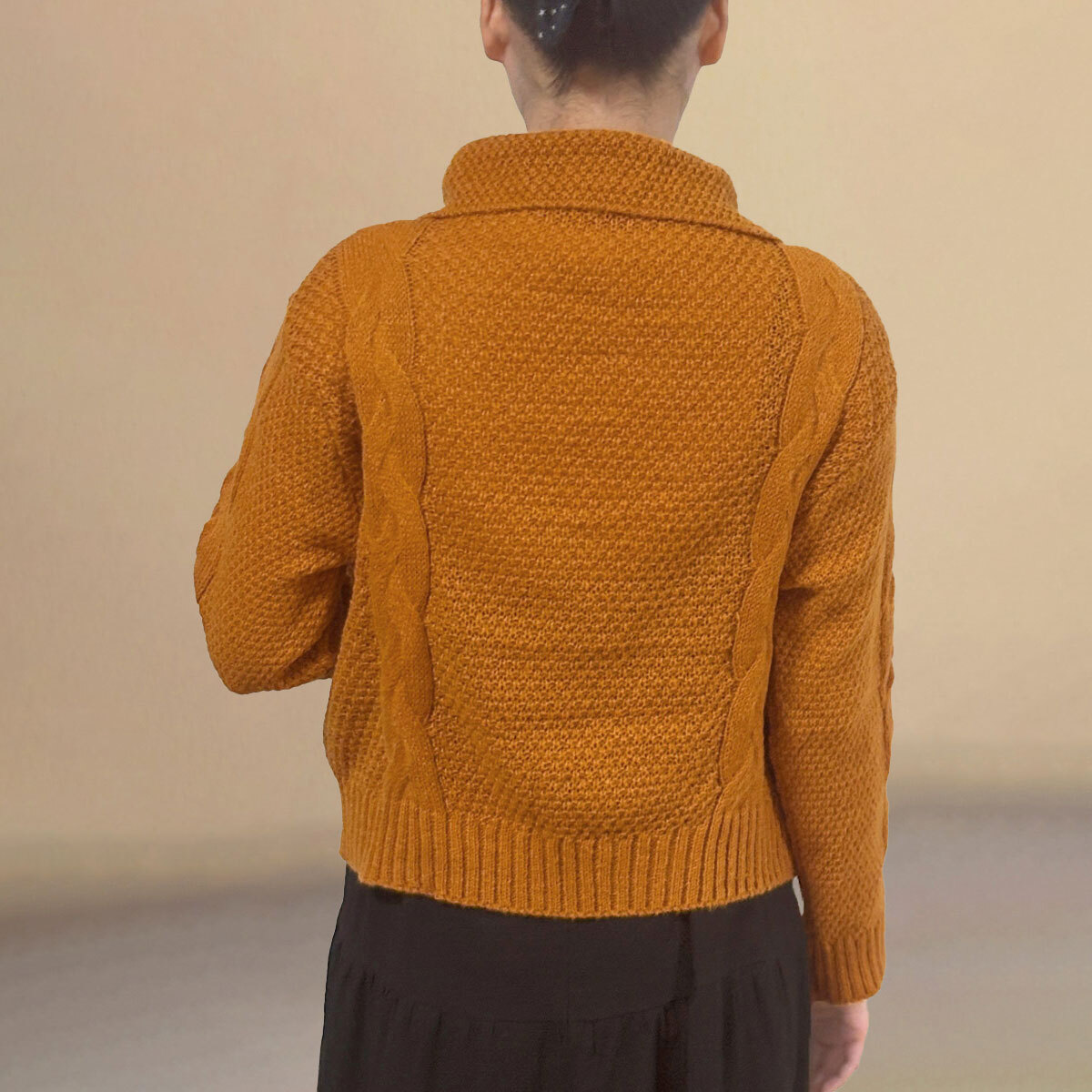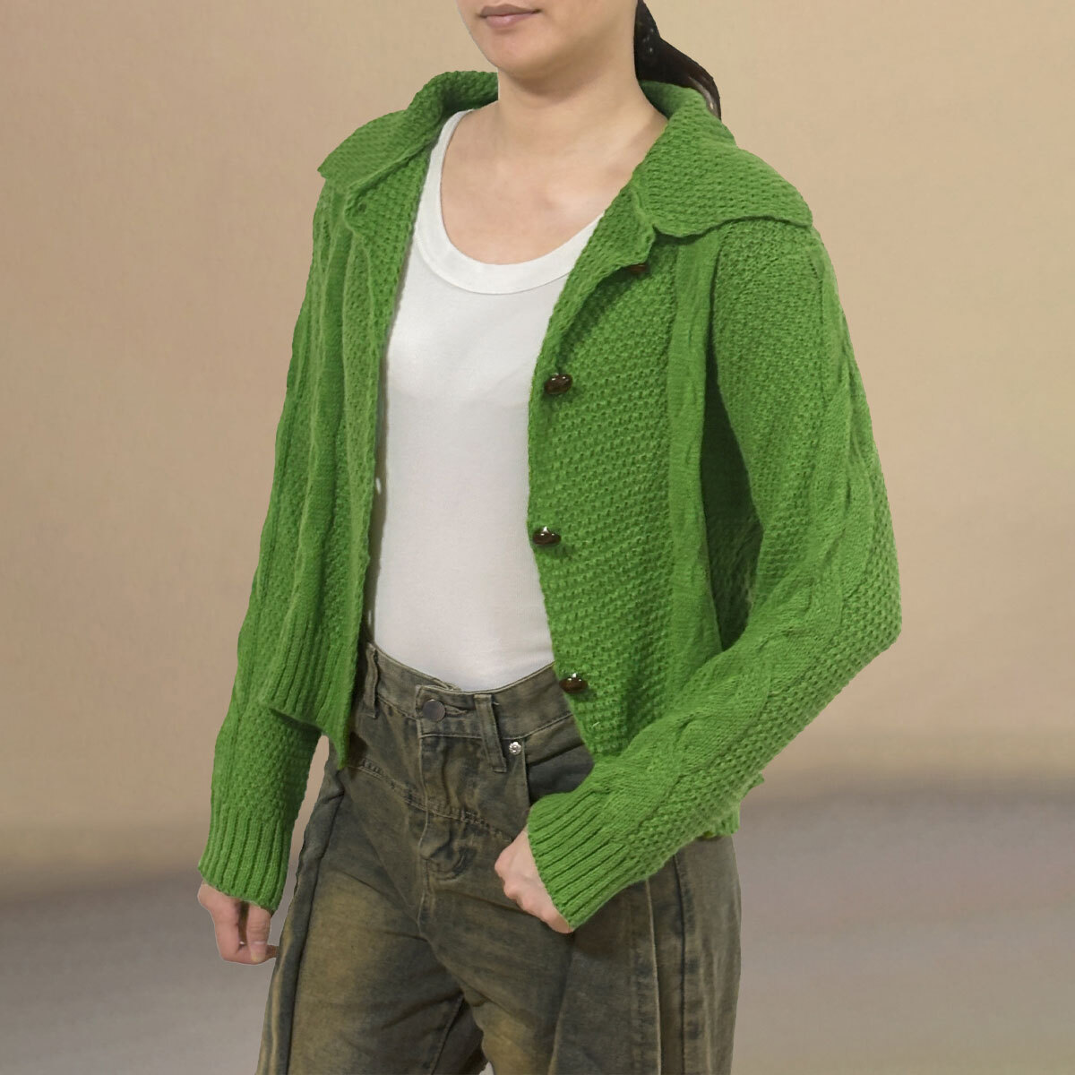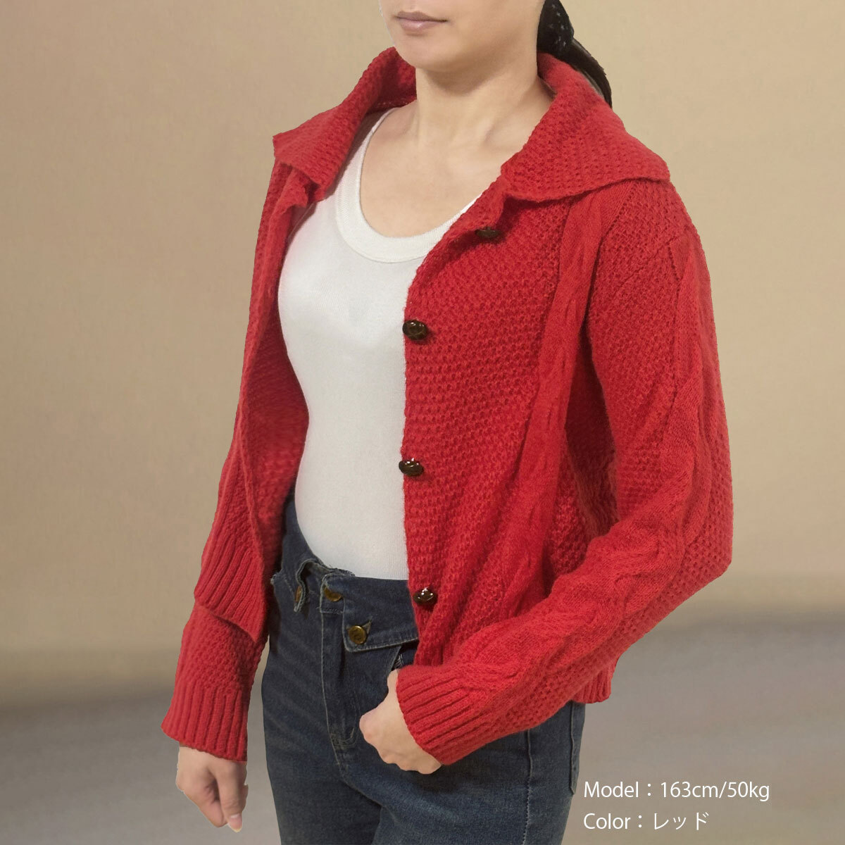ざっくりとしたケーブル編みと、立体感のある大きな襟が、きれいめで華やかな印象を演出してくれるショート丈のニットカーディガンです。