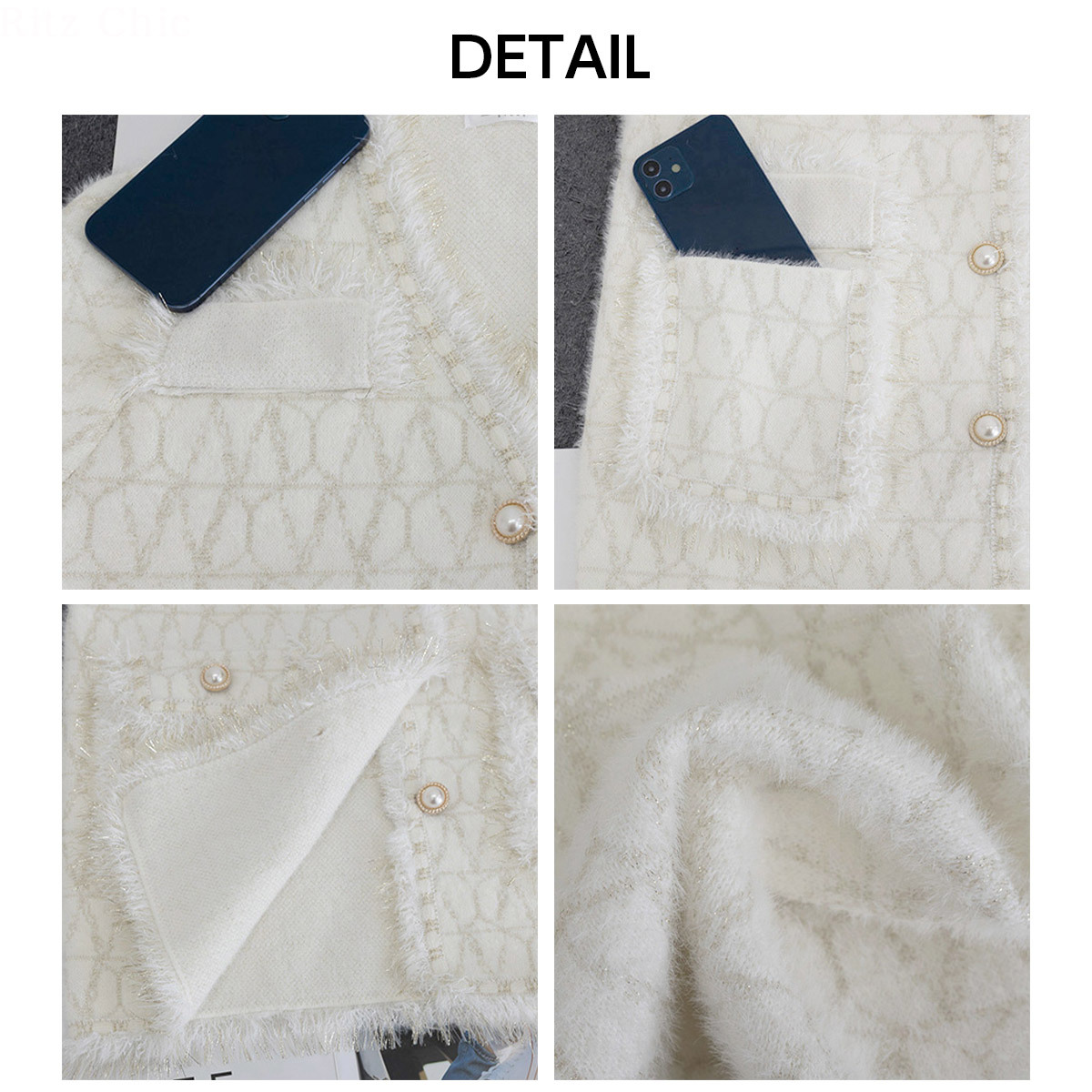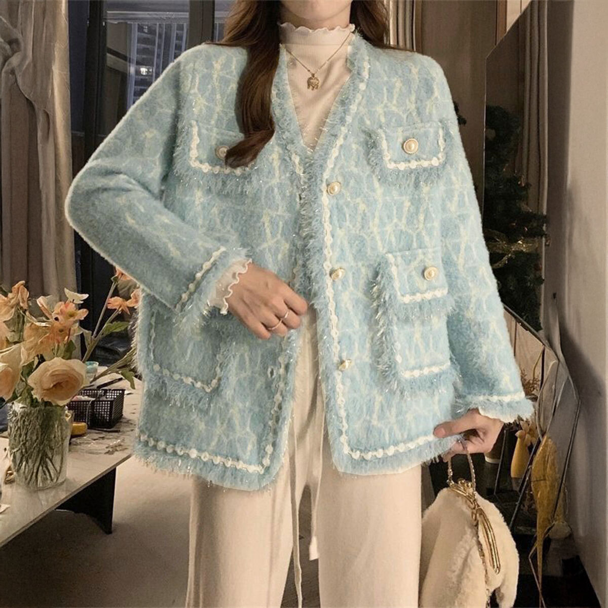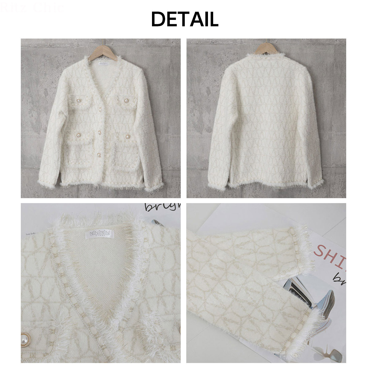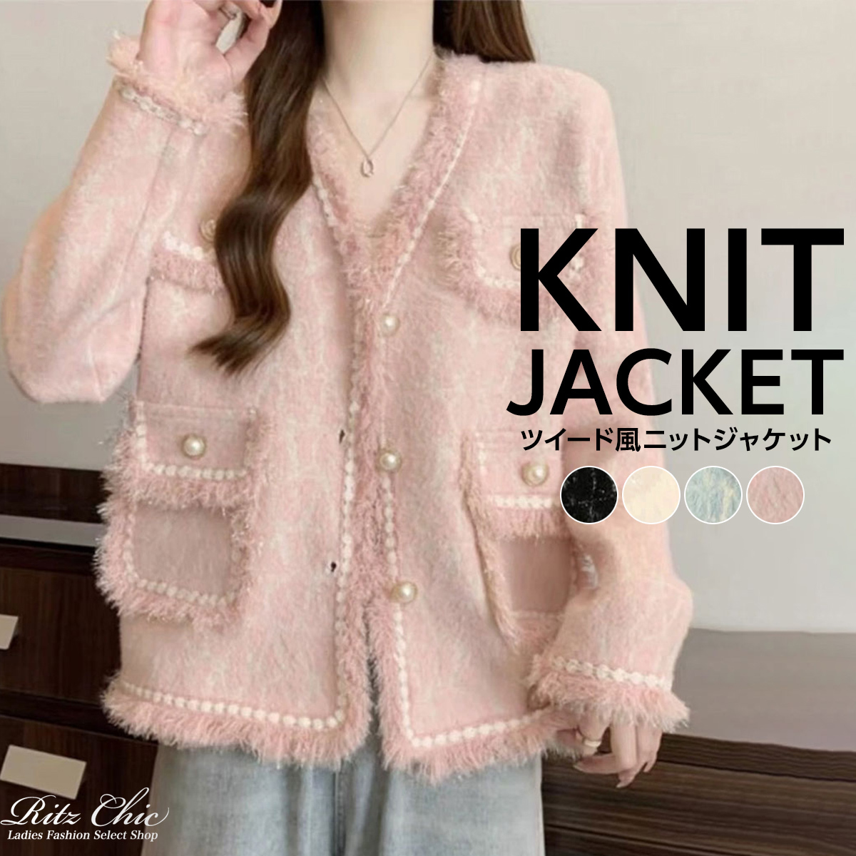 韓国風のツイード調デザインがお洒落に映えて、いつものコーデと合わせるだけで、上品な華やかさを演出してくれるニットジャケットです。