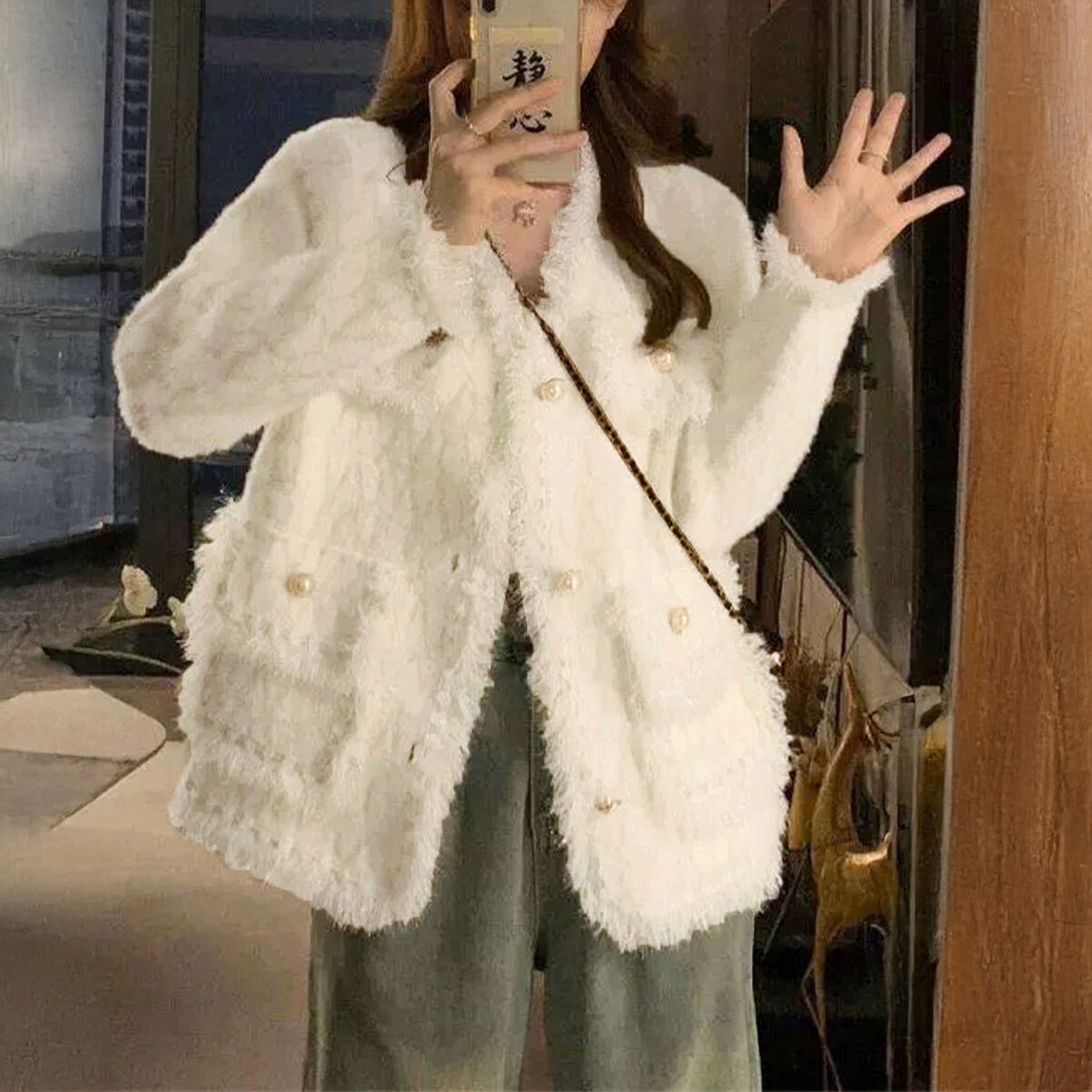 パールボタンやラメ糸の風合いがきれいめで高見え効果を発揮し、秋冬の季節感を楽しみながら大人の女性らしい印象を引き立ててくれます。