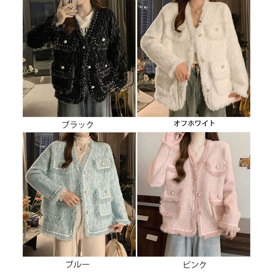 ニット ジャケット ツイード風 レディース 秋冬 韓国 アウター 大人 かわいい おしゃれ きれいめ 上品 モヘアニット パールボタン 羽織り ラメジャケット 大人可愛い 大人女子