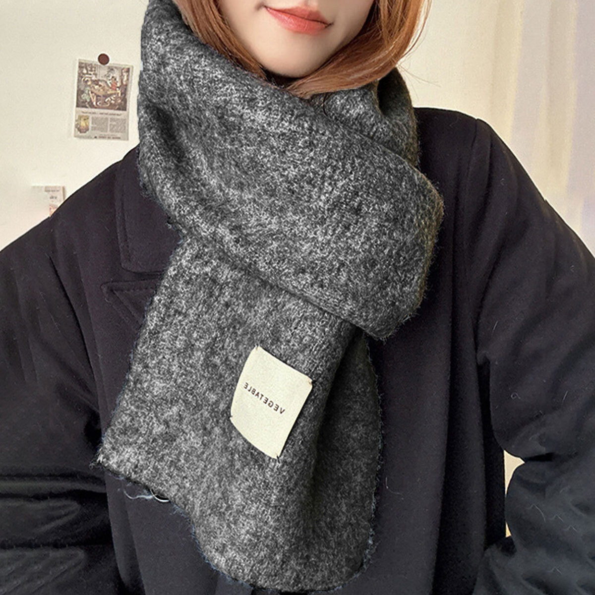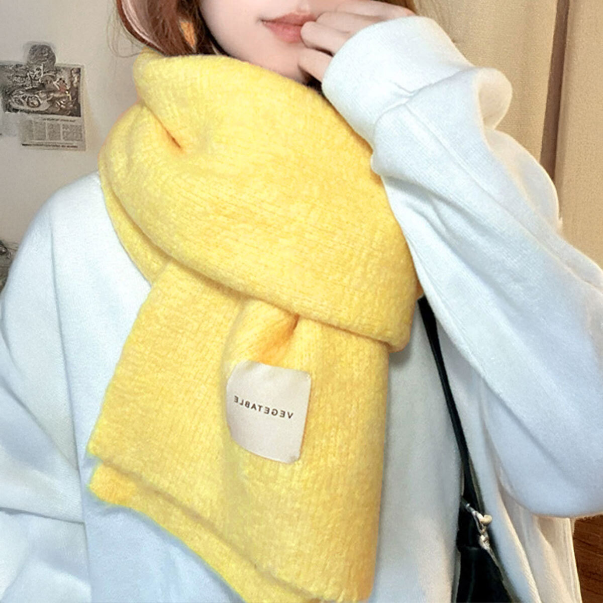 柔らかい素材で首元を優しく包み込み、ふわふわの暖かさが秋冬の寒さからしっかりと守ってくれる、大判のニットマフラーです。