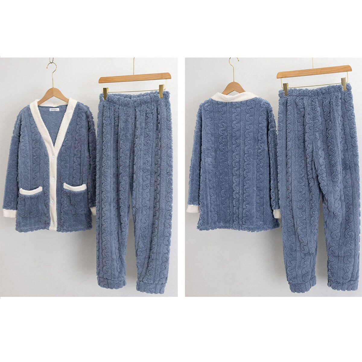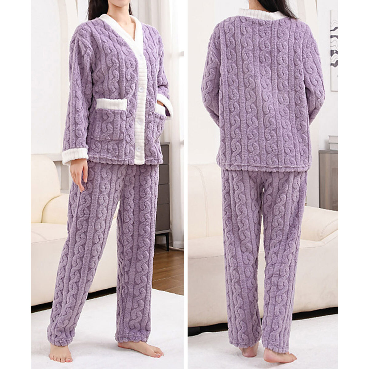 ケーブル柄のふわふわフリース素材が、肌触りが良くて暖かく、リラックスタイムを快適に過ごせるルームウェアパジャマの上下セットアップです。