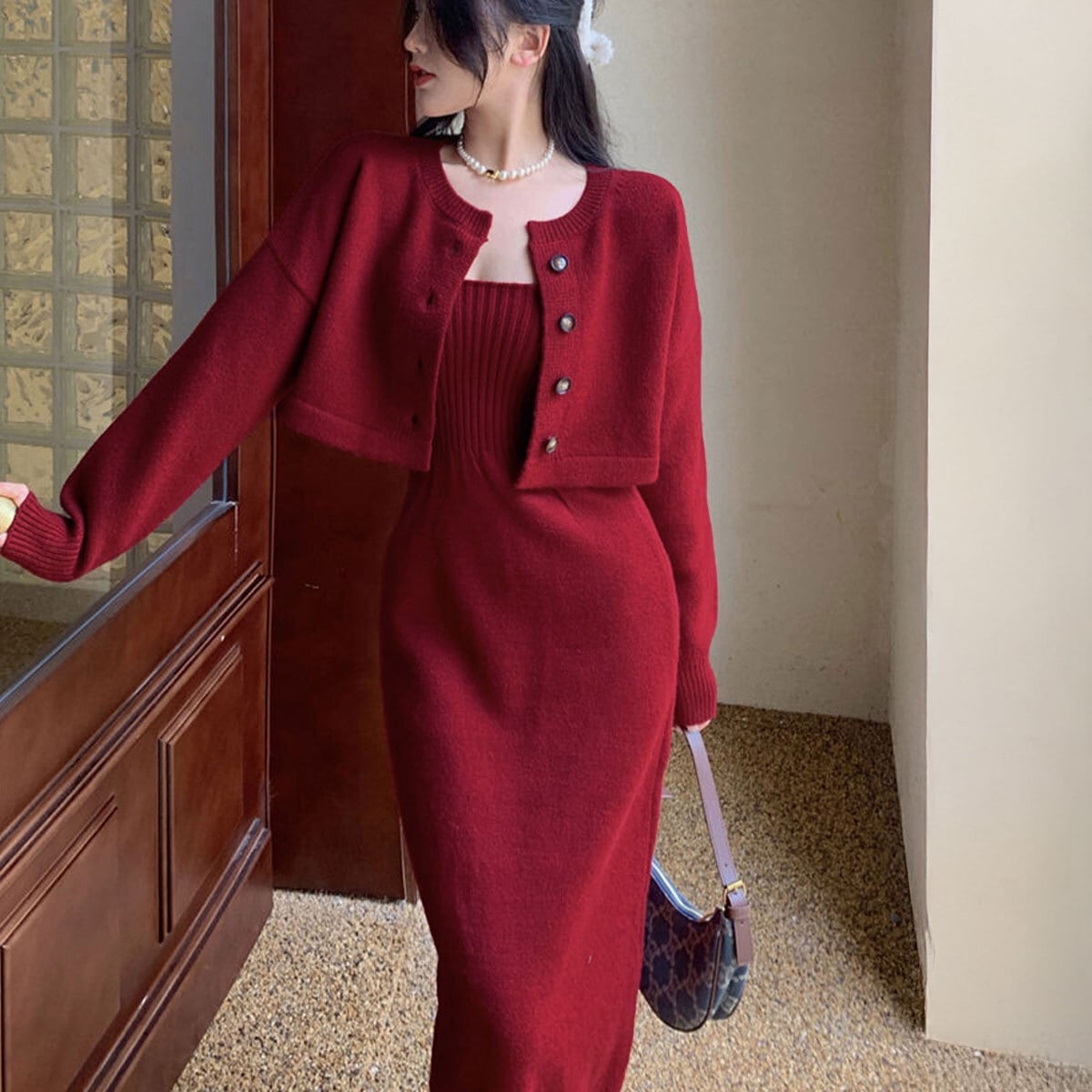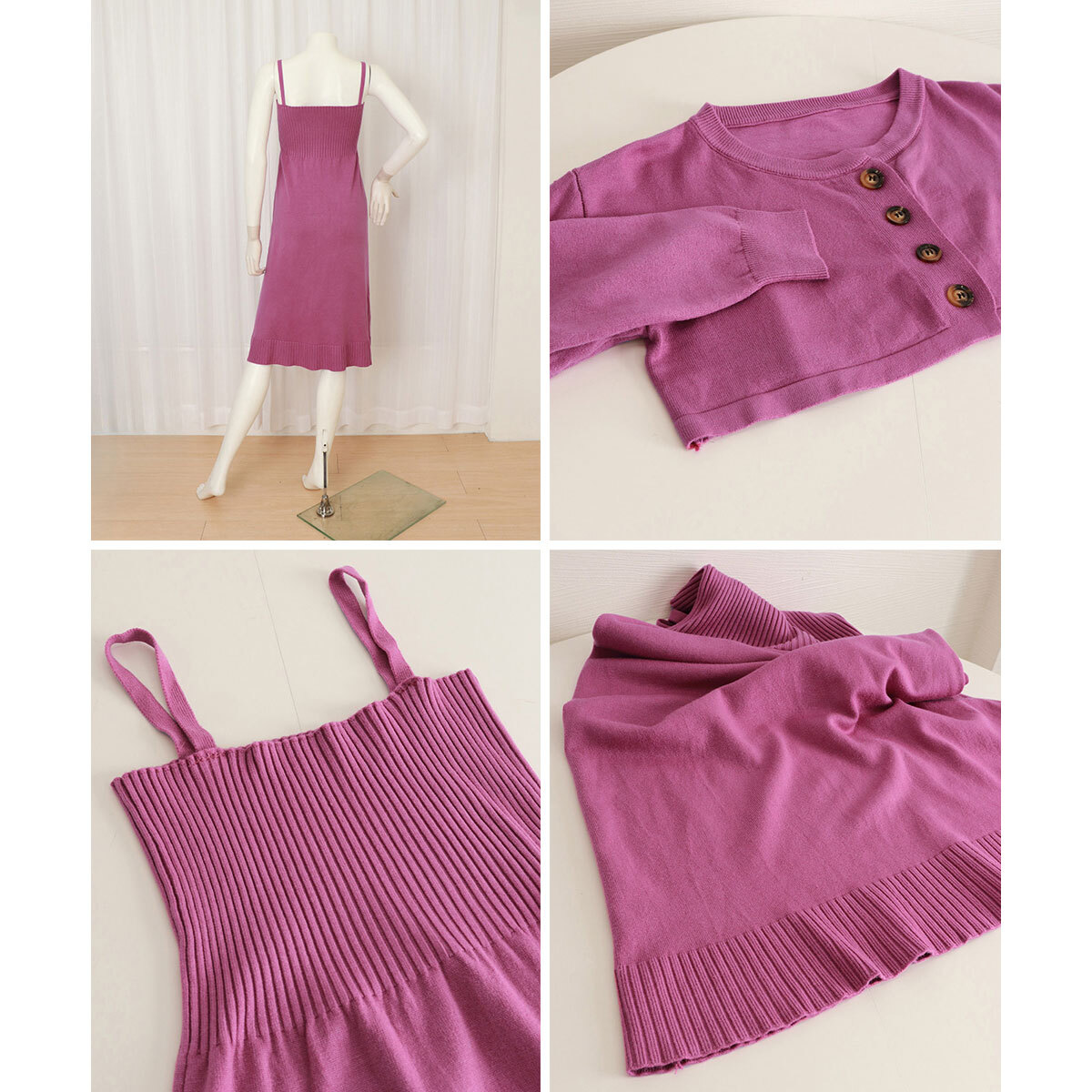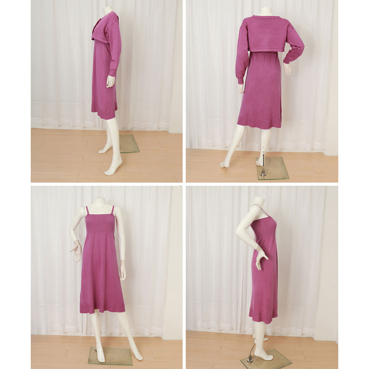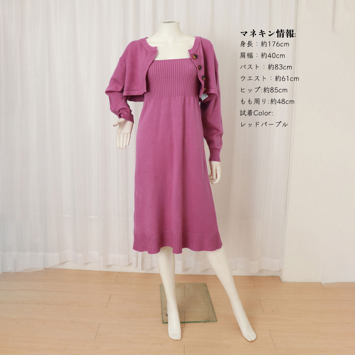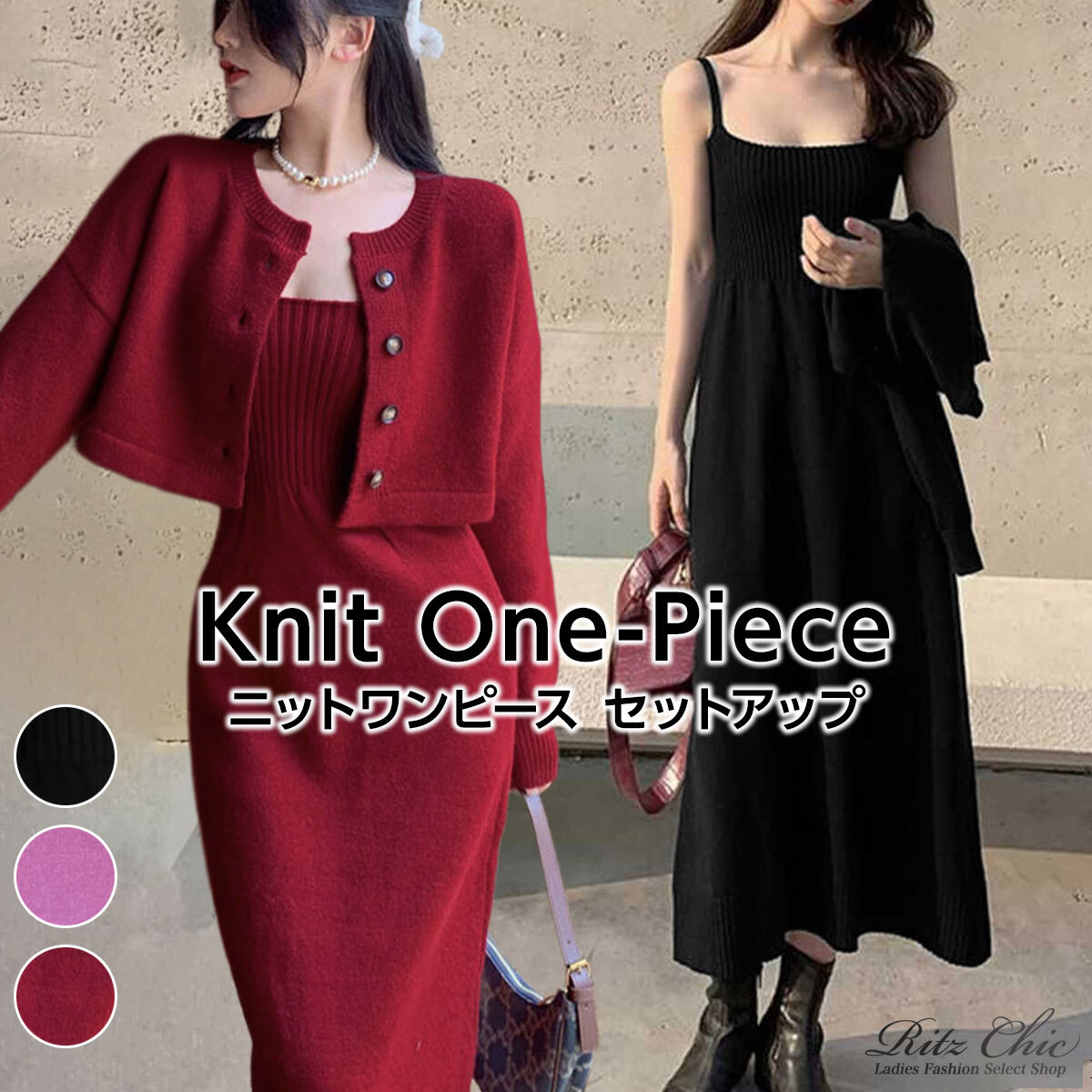 シンプルでありながら上品な印象を与える、ニットワンピースとショート丈カーディガンの2点セットです。
