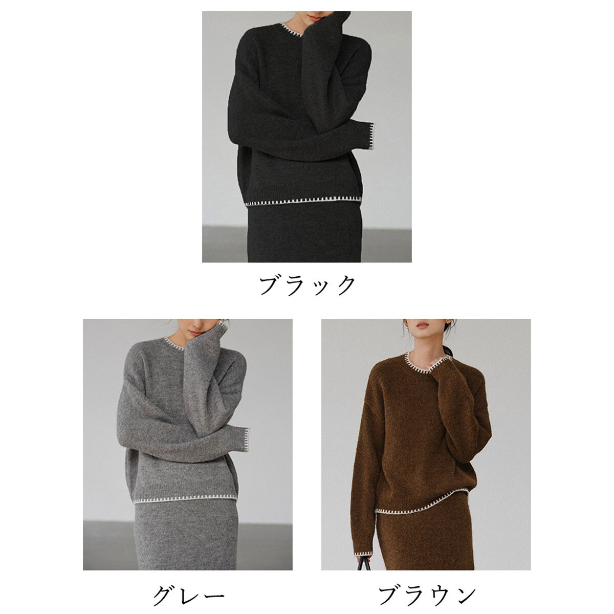 首元と裾部分、袖口のステッチ風デザインが、お洒落のアクセントになった編みニットが、秋冬らしいシーズンムードを引き立て、大人っぽさのあるこなれた印象を与えてくれます。