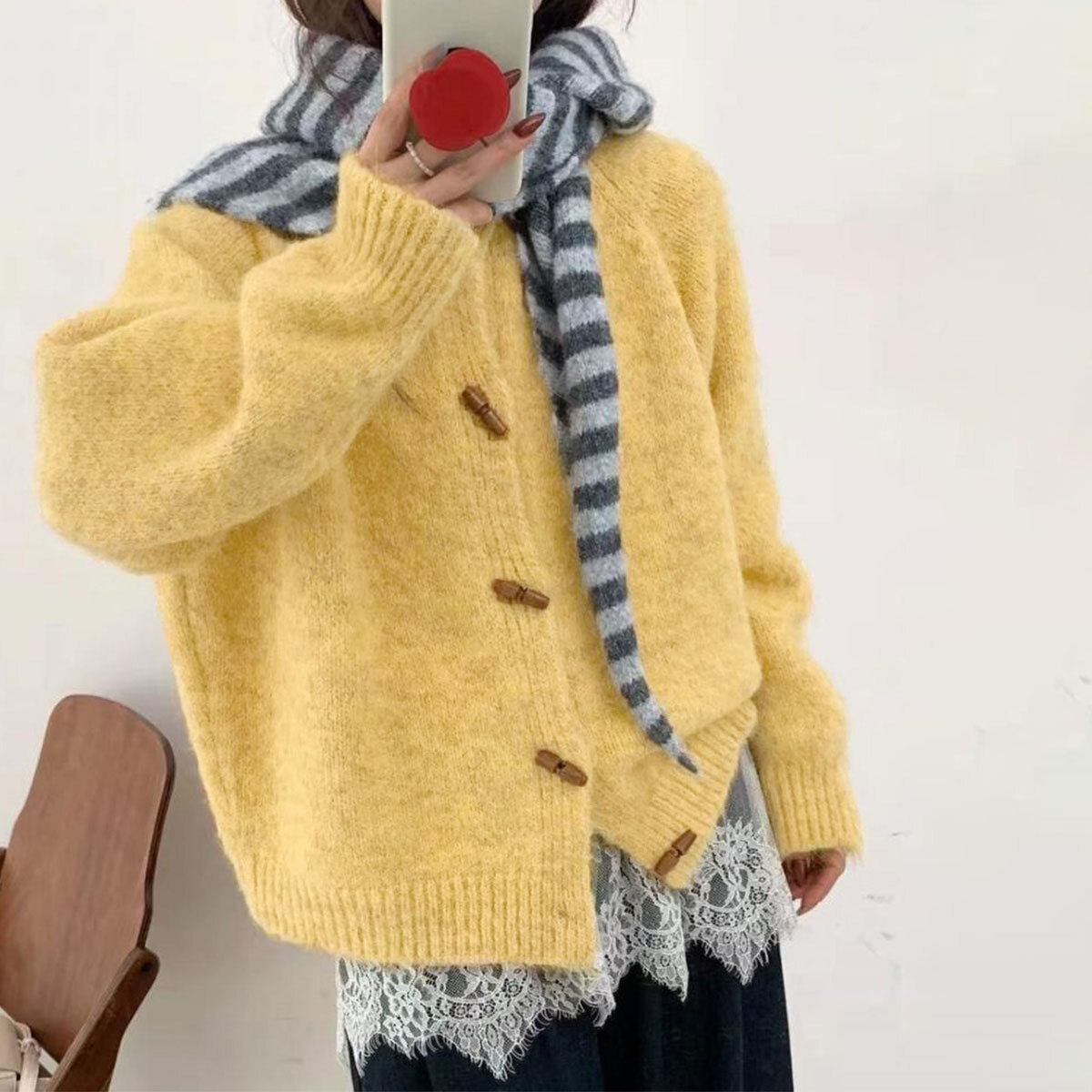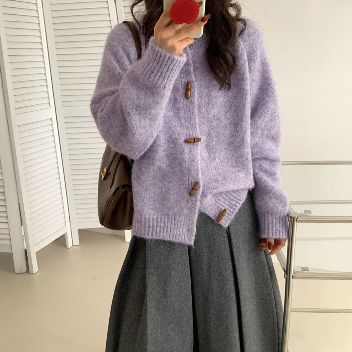 ◇トグルボタン付きのニットカーディガン。