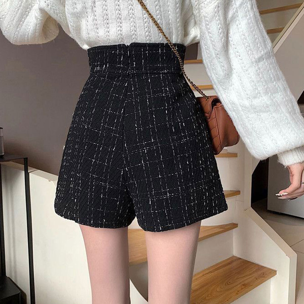 ツイード調の質感が秋冬らしさを引き立て、上品なチェック柄が大人の女性らしさを演出してくれるラップスカート風のショートパンツです。
