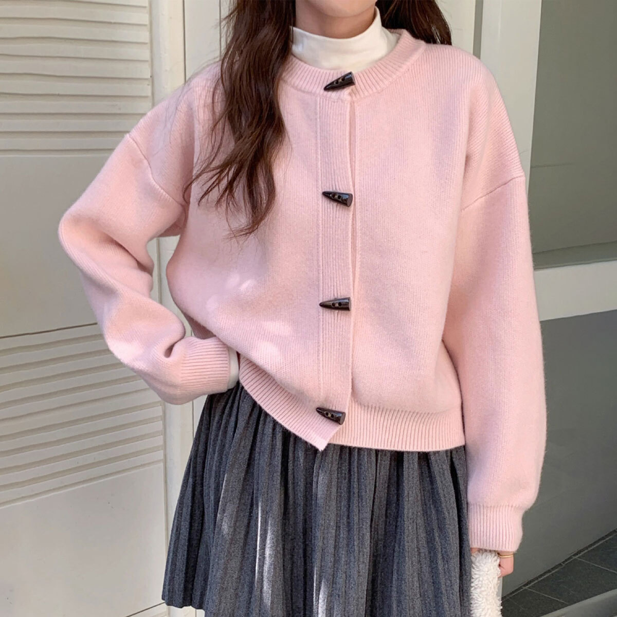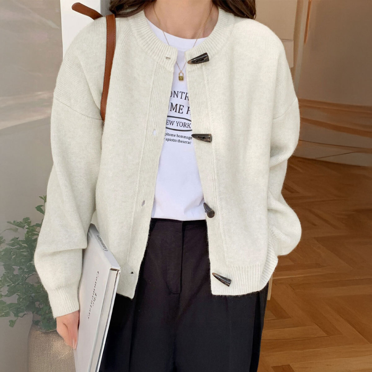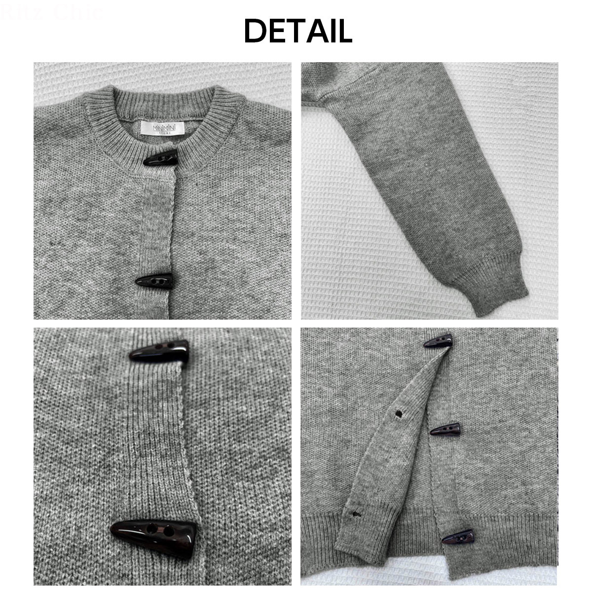 ヴィンテージライクな牛角型トグルボタンが、アクセントになるお洒落で可愛いニットカーディガンです。