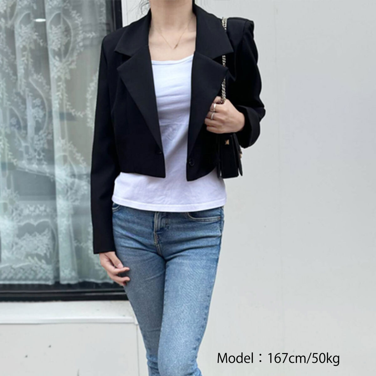◇スタイリッシュな印象を与えるショート丈のテーラードジャケット。
