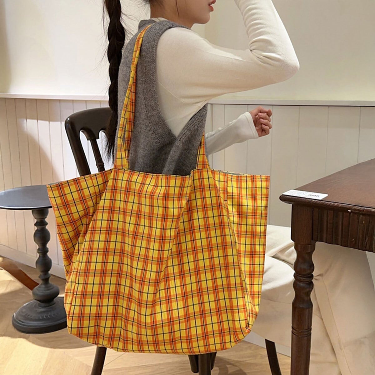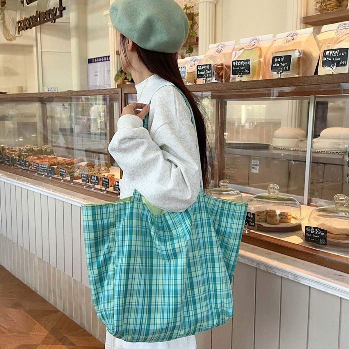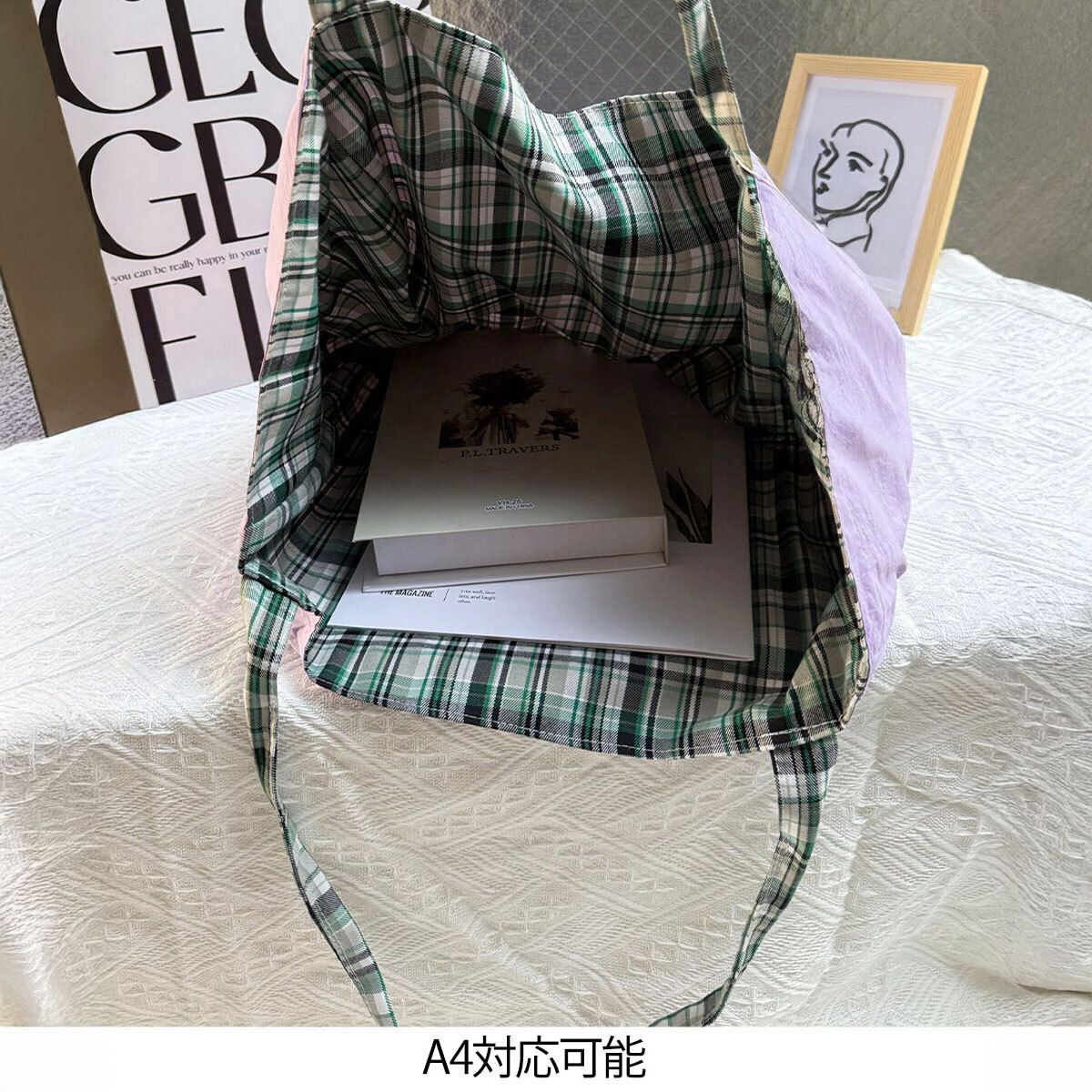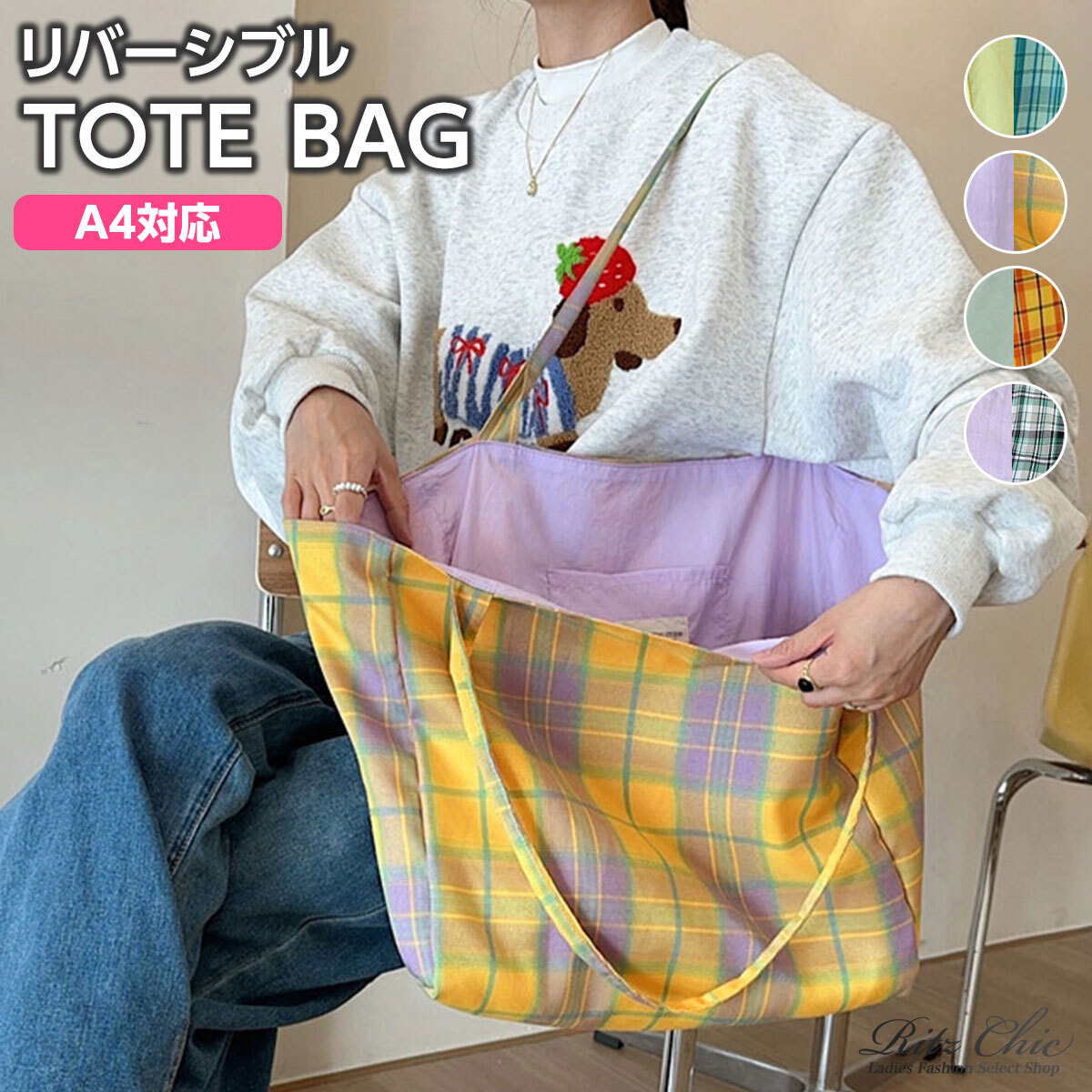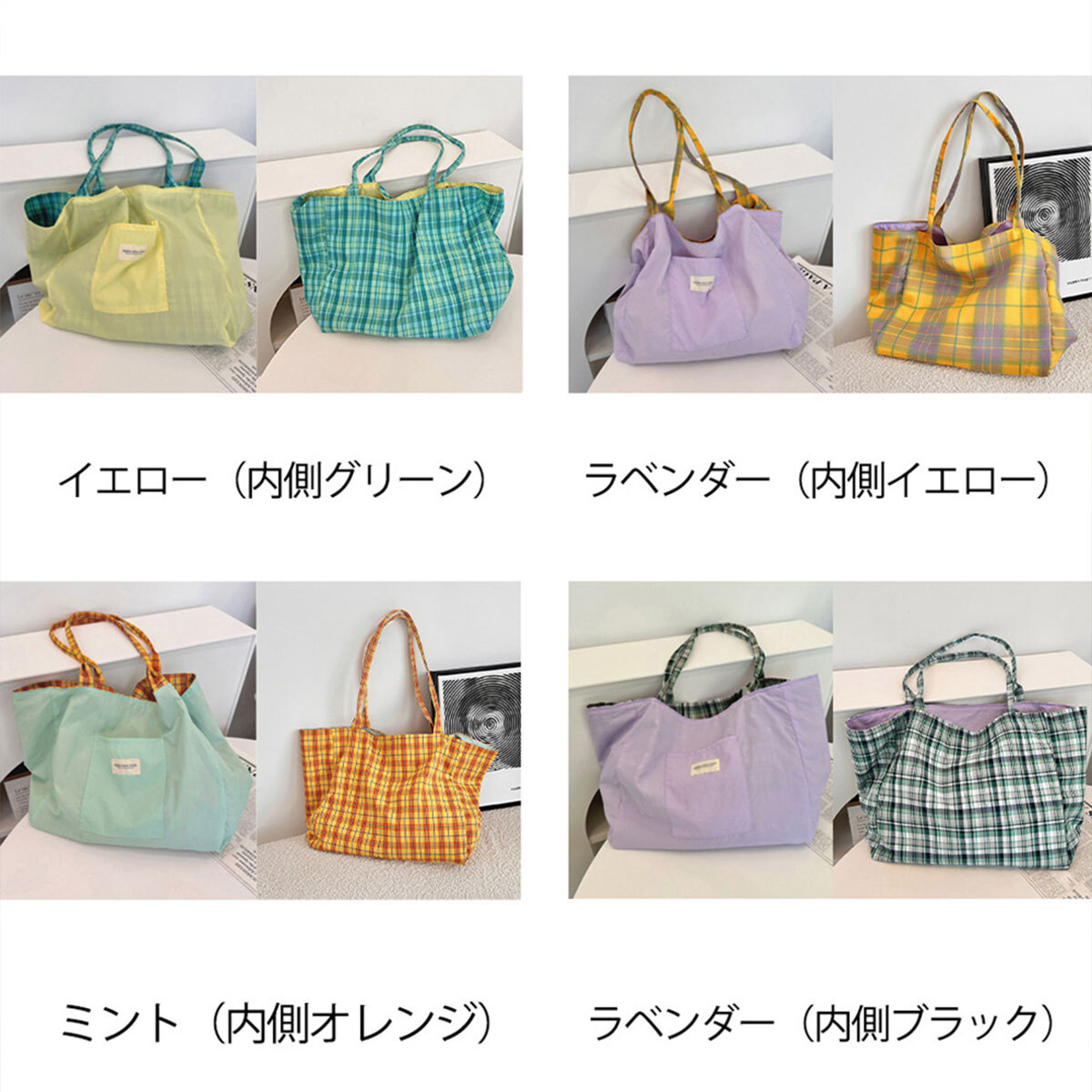 シンプルな無地デザインとトレンド感のあるチェック柄の、リバーシブルでお洒落を楽しめる大容量のトートバッグです。