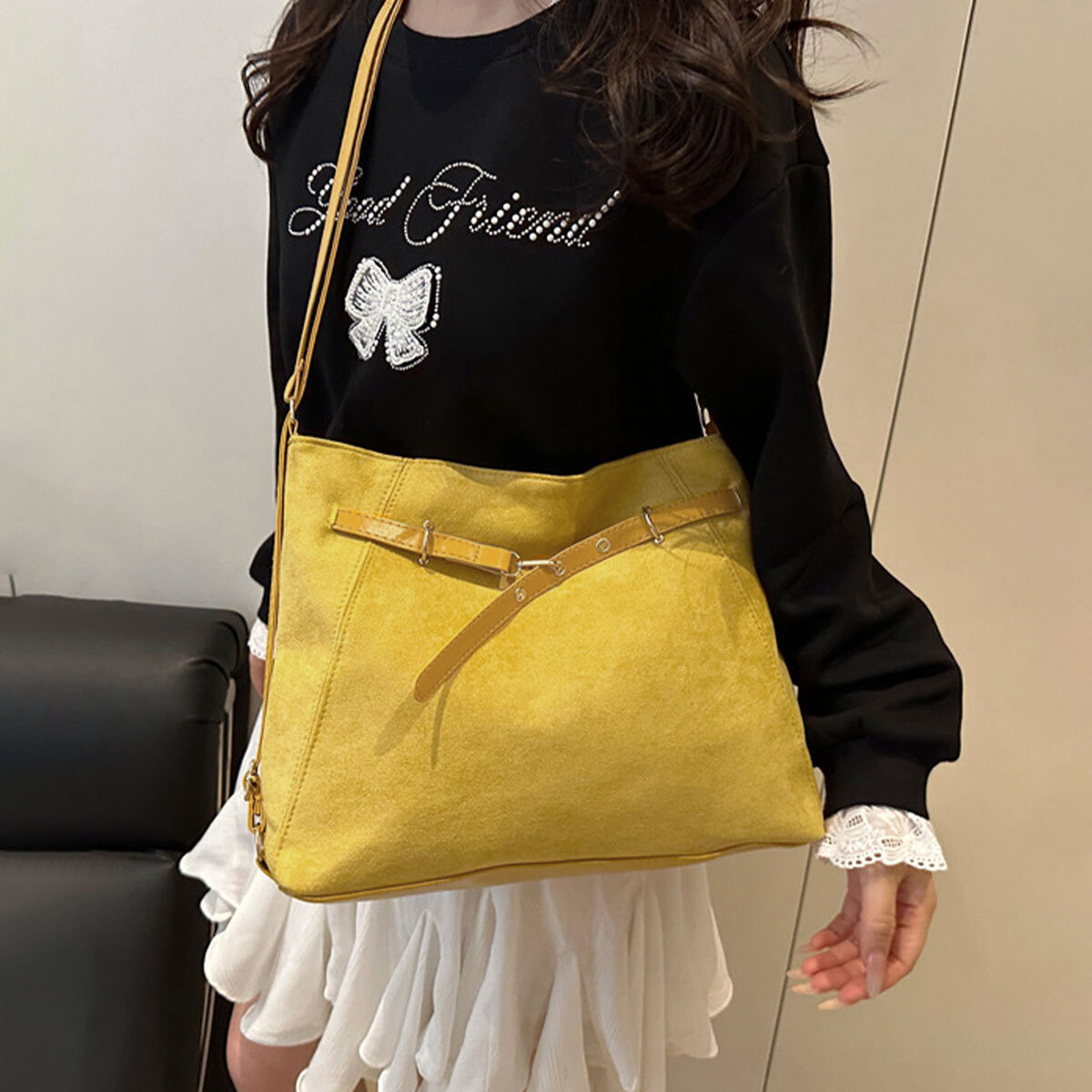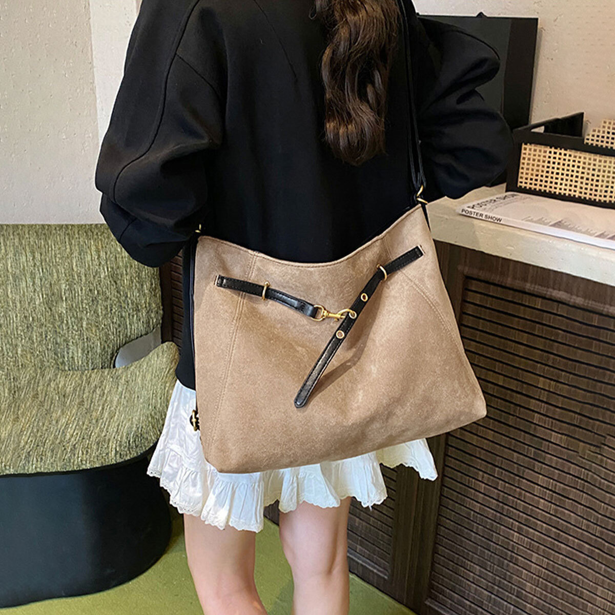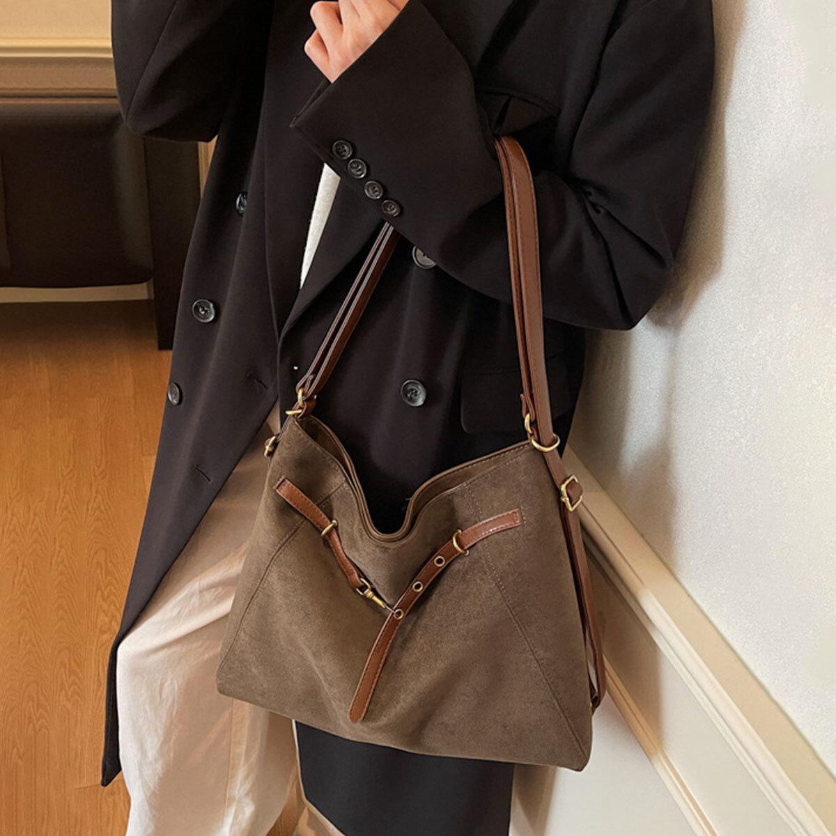 ヴィンテージ感のあるスエード調の生地素材に、お洒落なフロントベルトのデザインが、レトロなカジュアル感を演出してくれる大容量のトートバッグです。