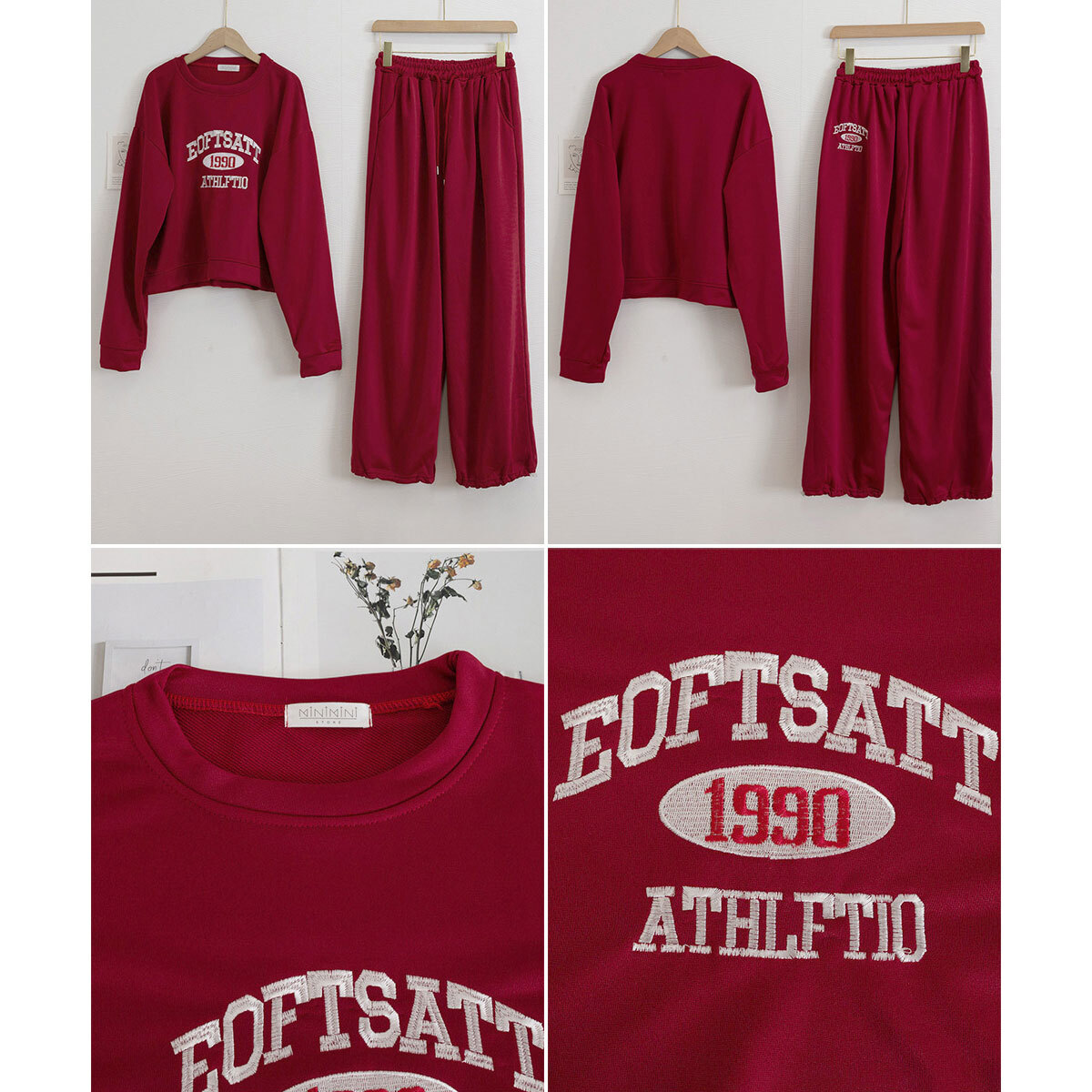 韓国風のカレッジロゴが目を惹く、トレーナーとイージーパンツの2点がセットになった、スウェットセットアップです。