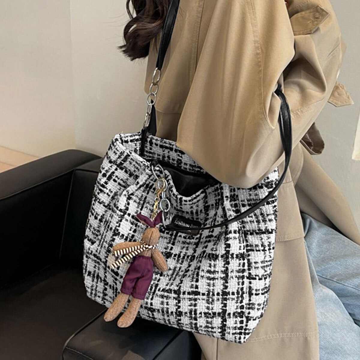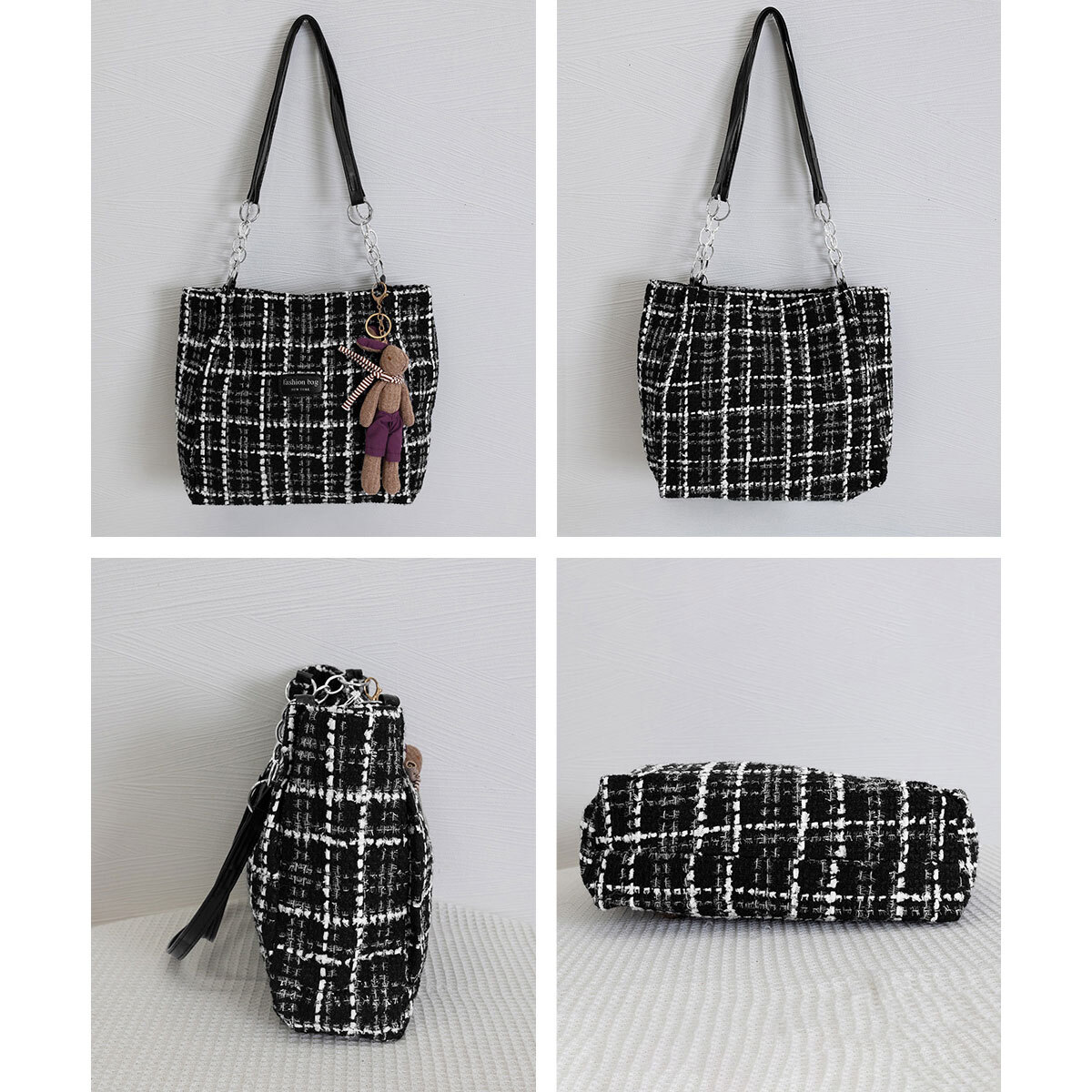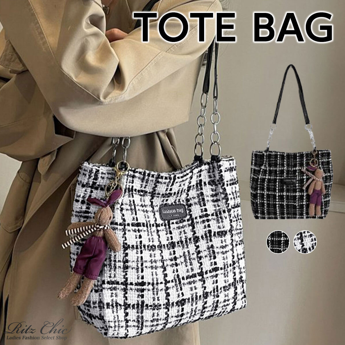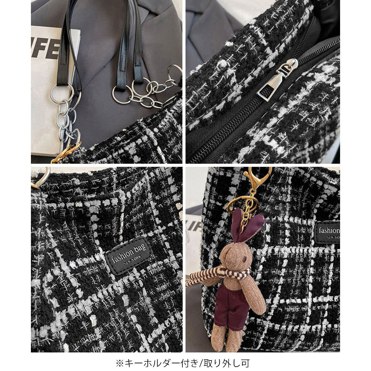 チェック柄 トートバッグ 大容量 軽量 レディース 韓国 通勤 通学 おしゃれ 大人 かわいい カジュアル 肩掛け チェーンショルダー オフィス ビジネス ぬいぐるみチャーム付き 大人可愛い 大人女子