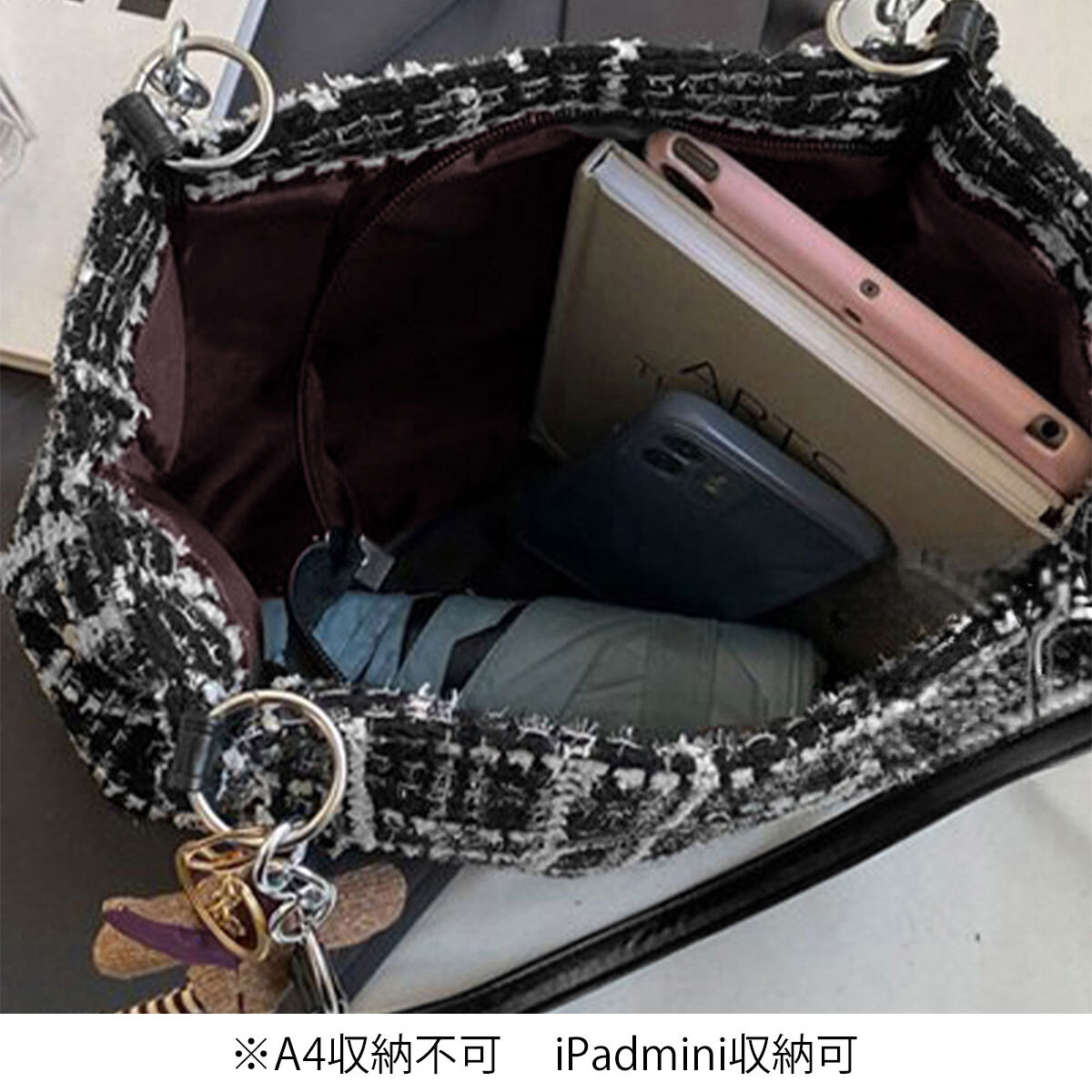 ◇ツイード風素材のチェック柄がお洒落なトートバッグ。