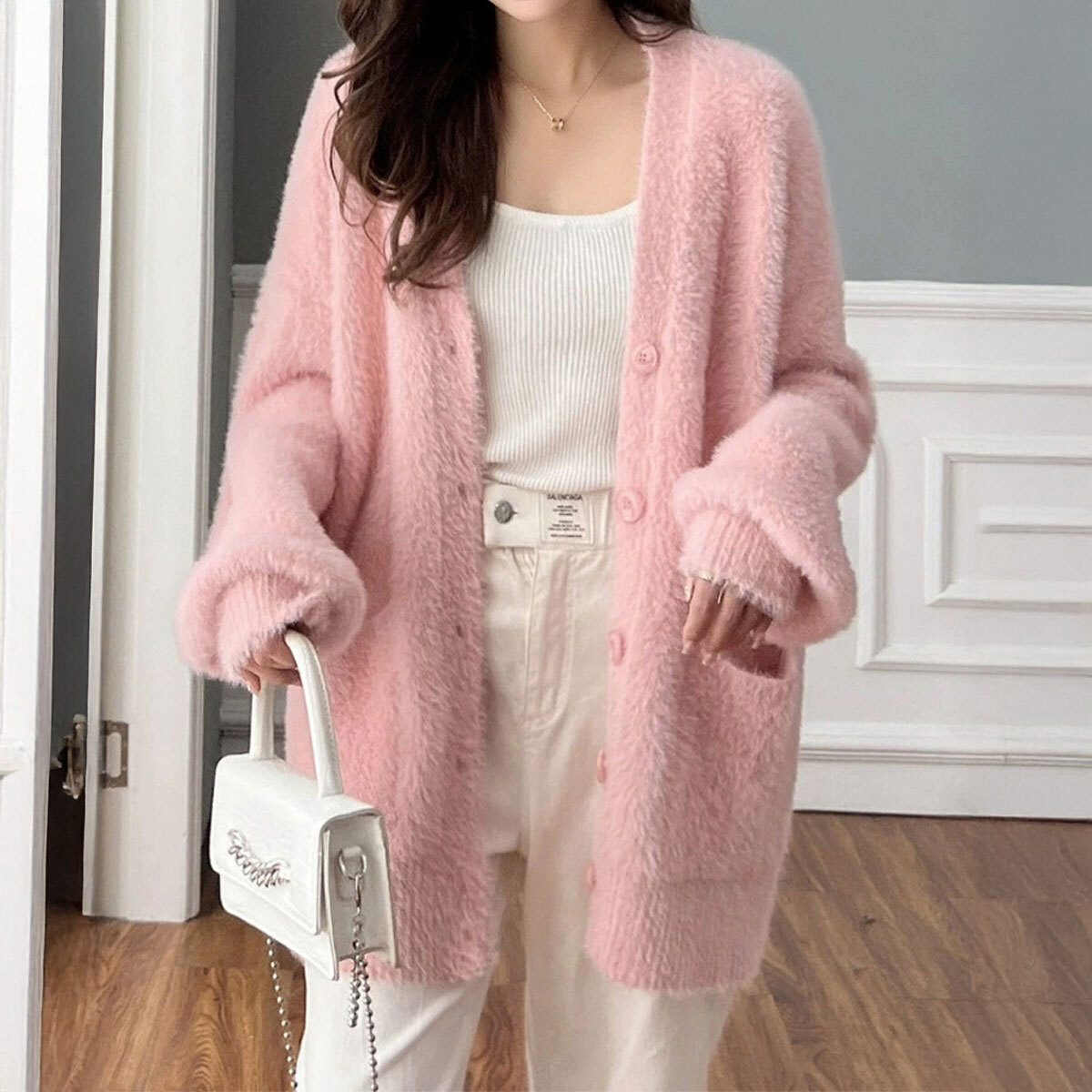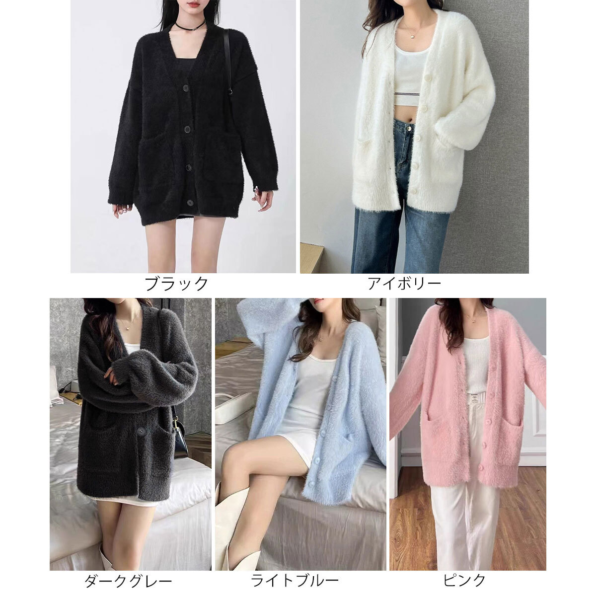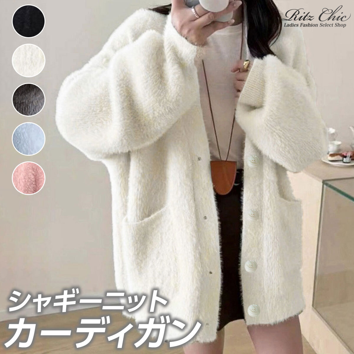 シャギーニット カーディガン Vネック レディース 秋冬 韓国 ニット ゆったり 体型カバー 大人 かわいい きれいめ カジュアル おしゃれ 重ね着 ロング丈 羽織り トップス 大人可愛い 大人女子