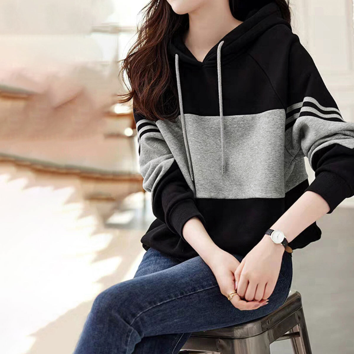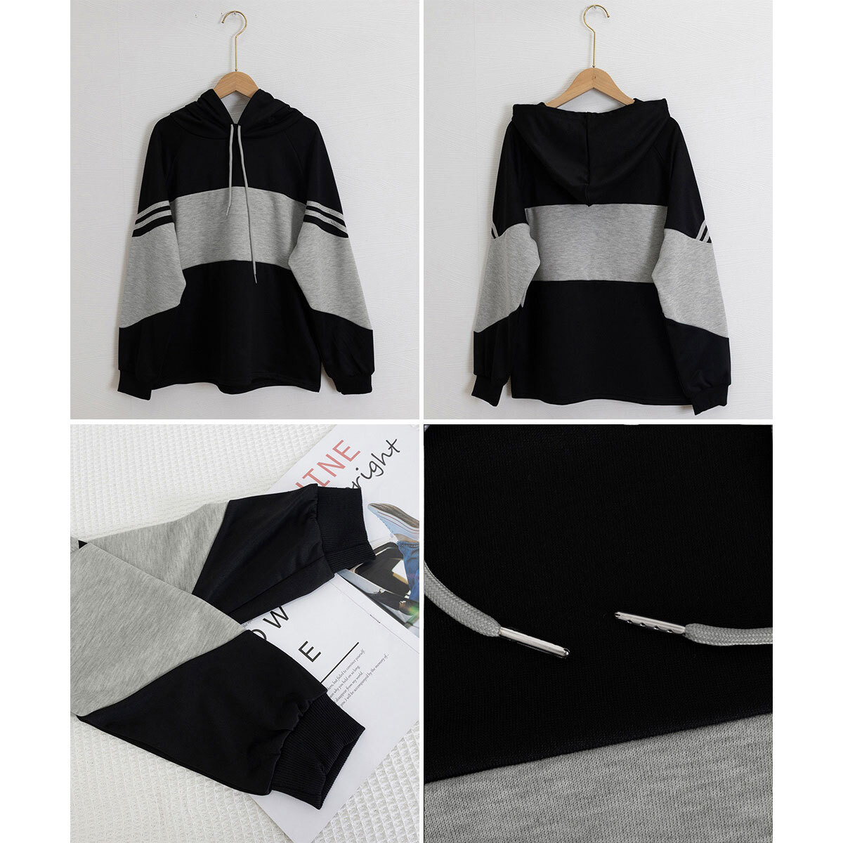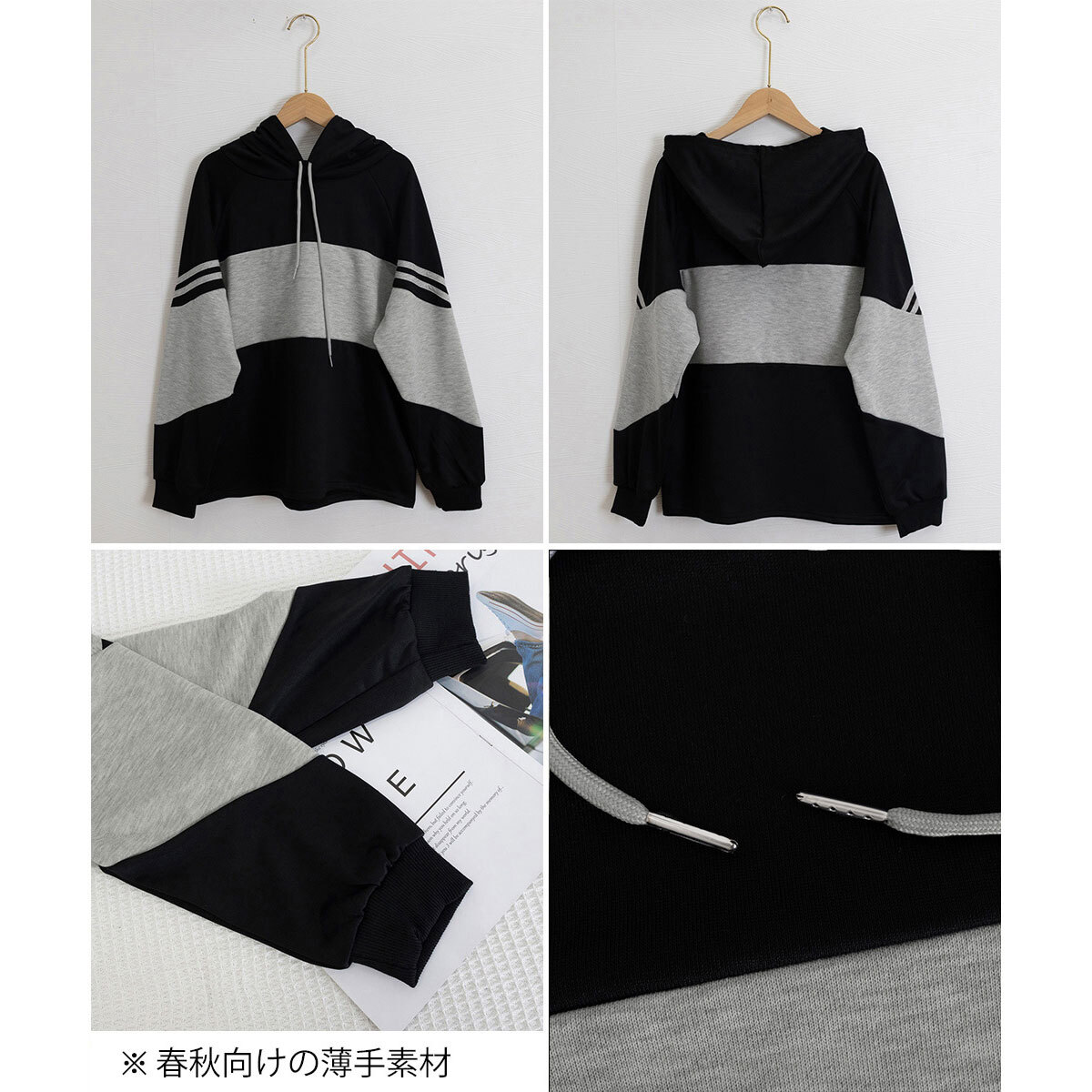 バイカラーの切り替えデザインと袖のラインが目を惹き、韓国風のストリートスタイルやアメカジスタイルにもマッチするスウェットパーカーです。