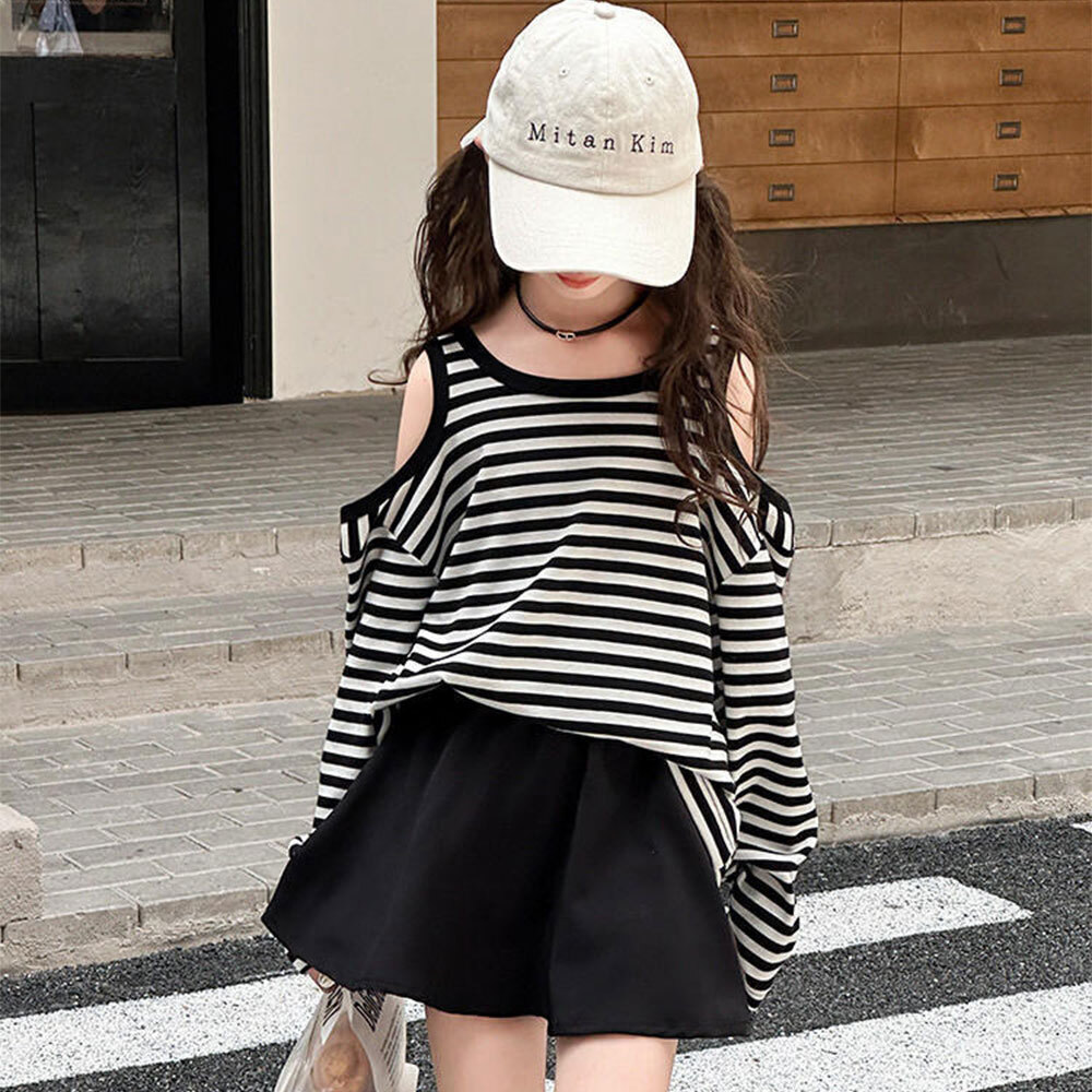 【送料無料】 子供服 女の子 肩開き スウェット シャツ 長袖 春秋 韓国 おしゃれ ボーダー柄 オフショルダー かわいい カジュアル 小学生 キッズ ゆったり 韓国ファッション 大人可愛い 大人女子