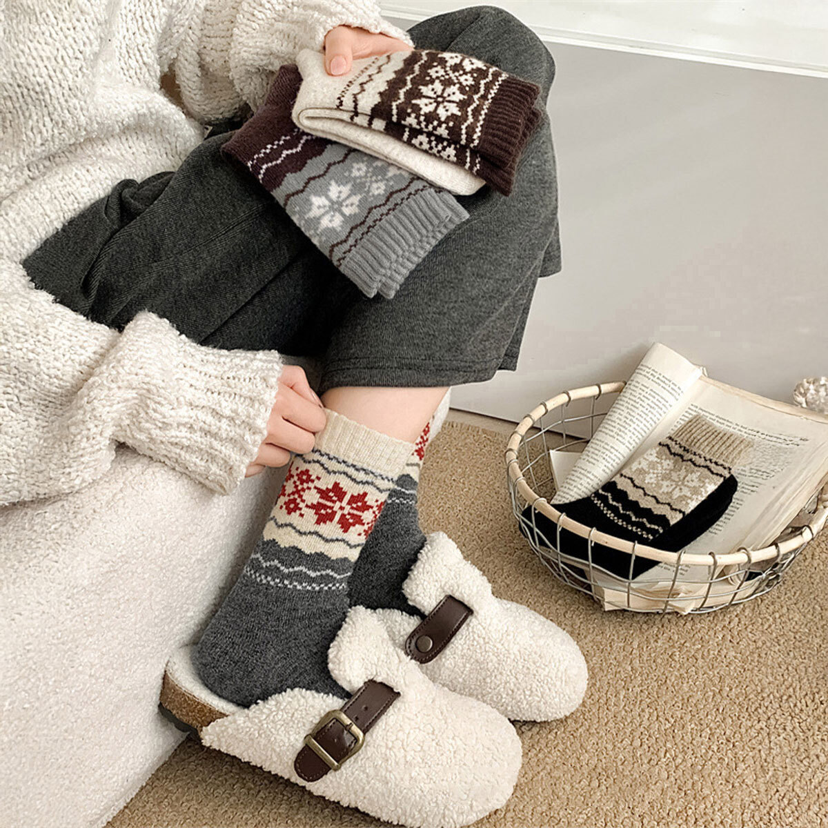 ソックス ノルディック柄 4足セット レディース 韓国 靴下 秋冬 暖かい 厚手 おしゃれ 大人 かわいい カジュアル レトロ ルームソックス 冷え対策 柔らかい 伸縮性 大人可愛い 大人女子