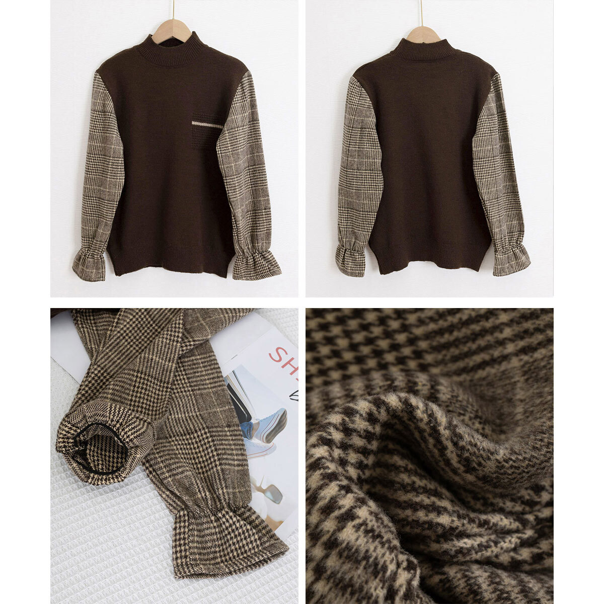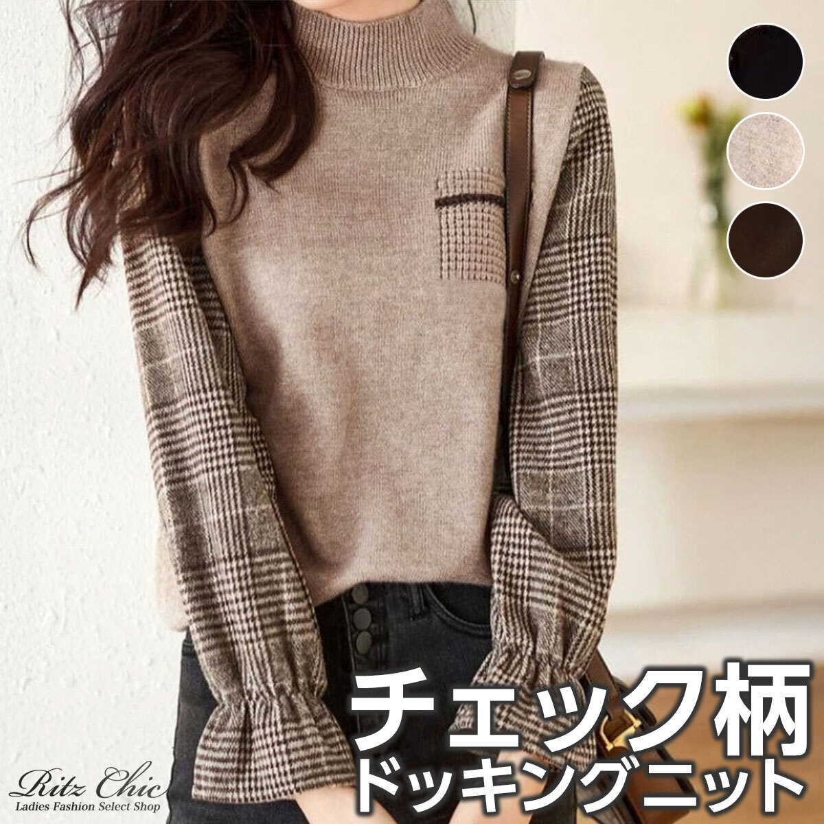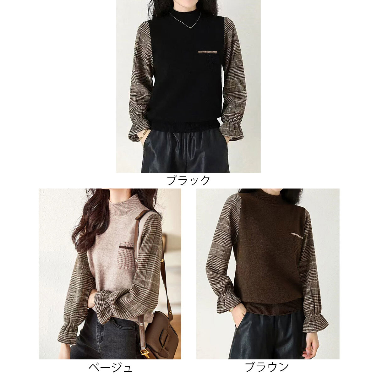 チェック柄 ドッキング ニット 重ね着風 レディース 秋冬 韓国 レイヤード おしゃれ 大人 カジュアル ハイネック 切り替えニット キャンディースリーブ きれいめ 大人可愛い 大人女子