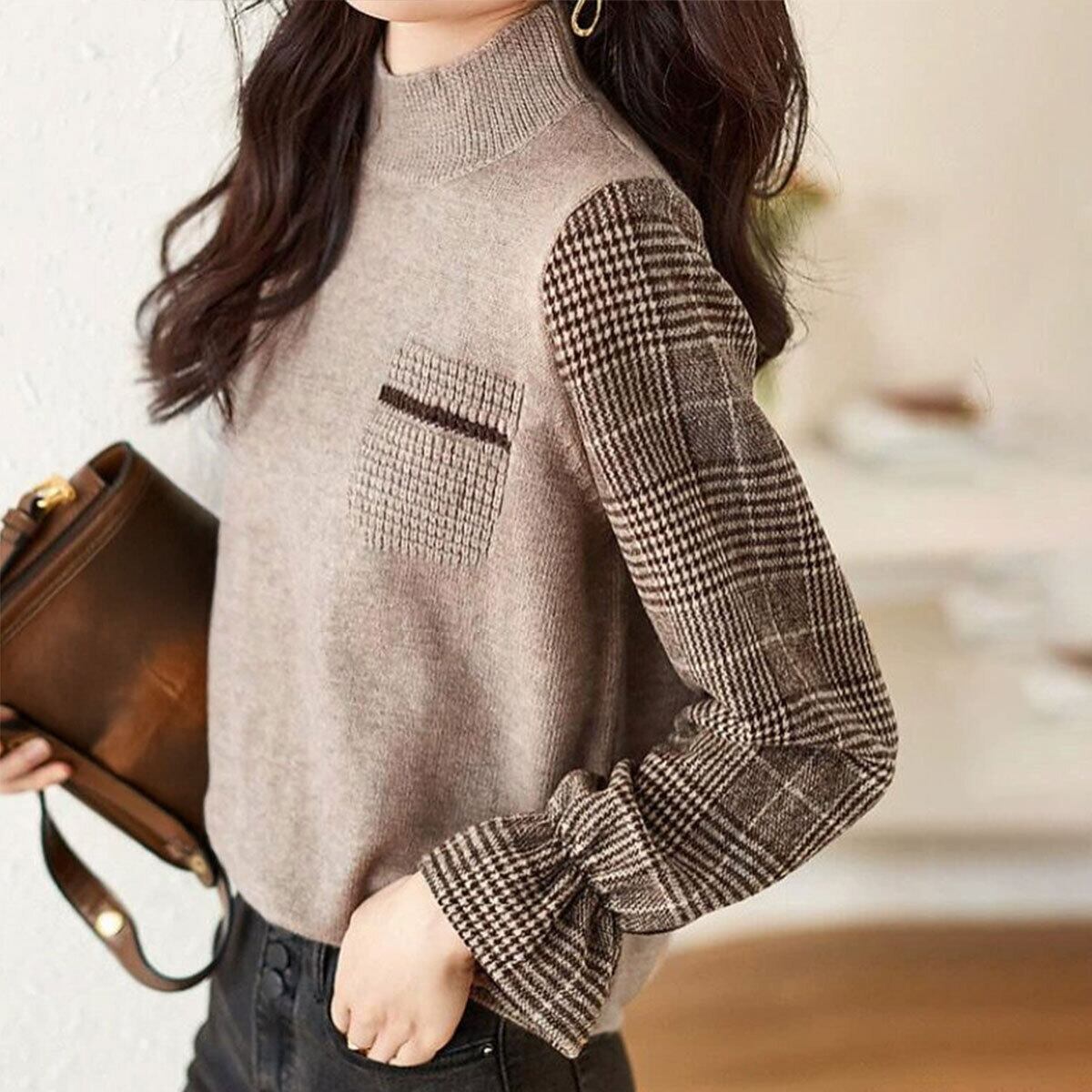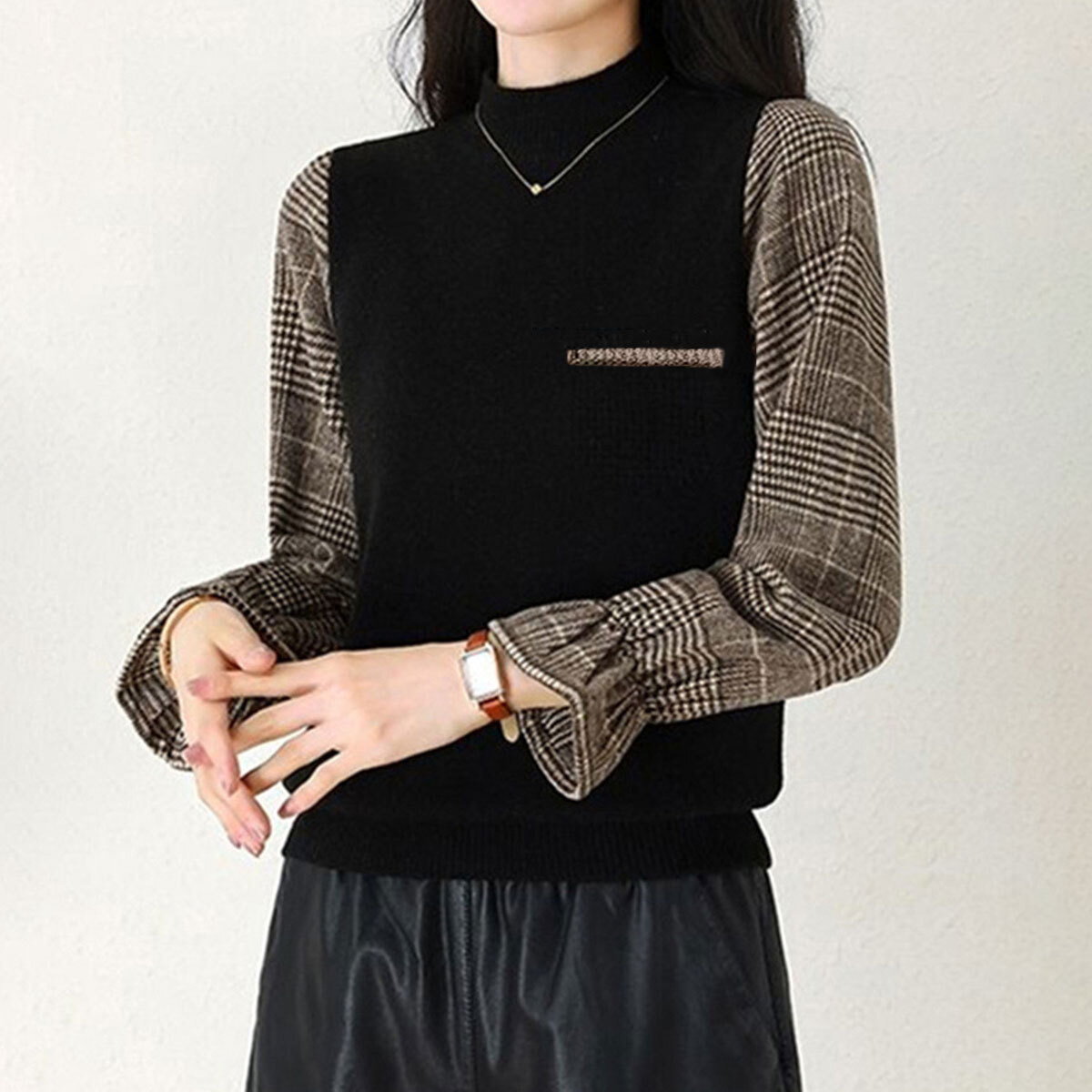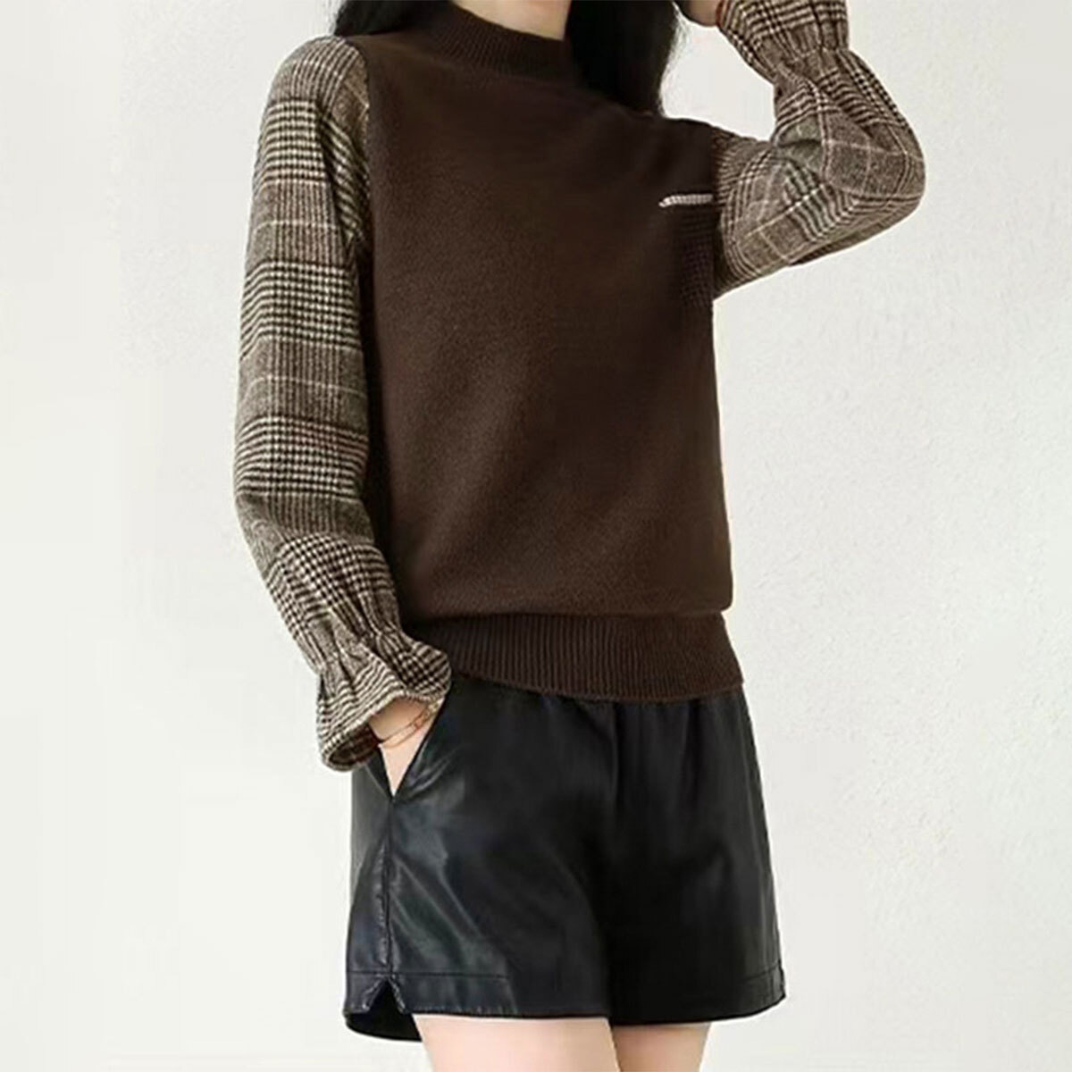 チェック柄 ドッキング ニット 重ね着風 レディース 秋冬 韓国 レイヤード おしゃれ 大人 カジュアル ハイネック 切り替えニット キャンディースリーブ きれいめ 大人可愛い 大人女子