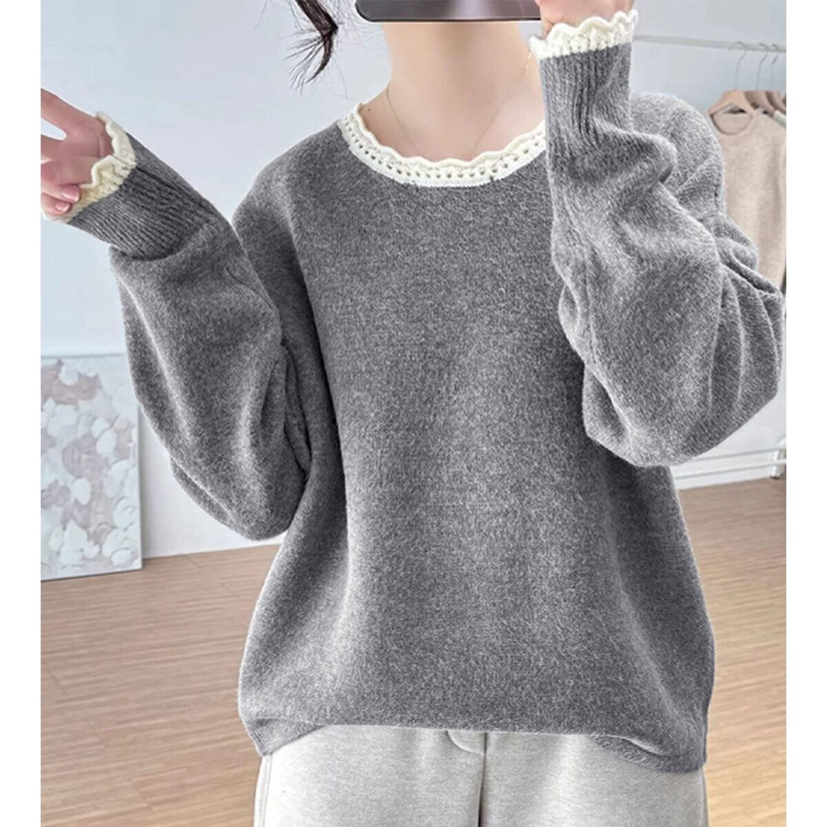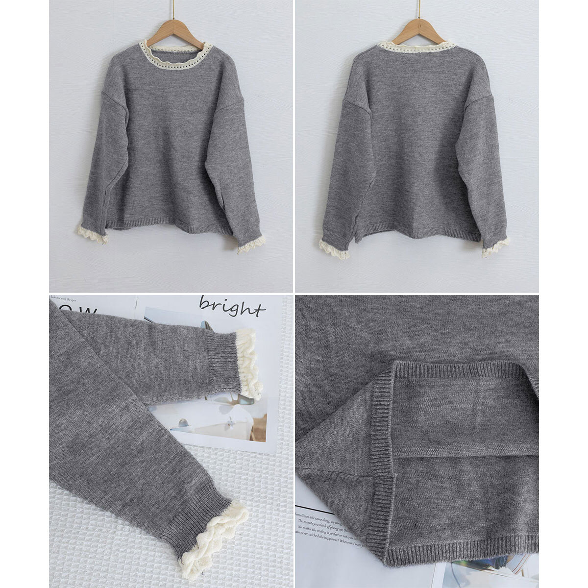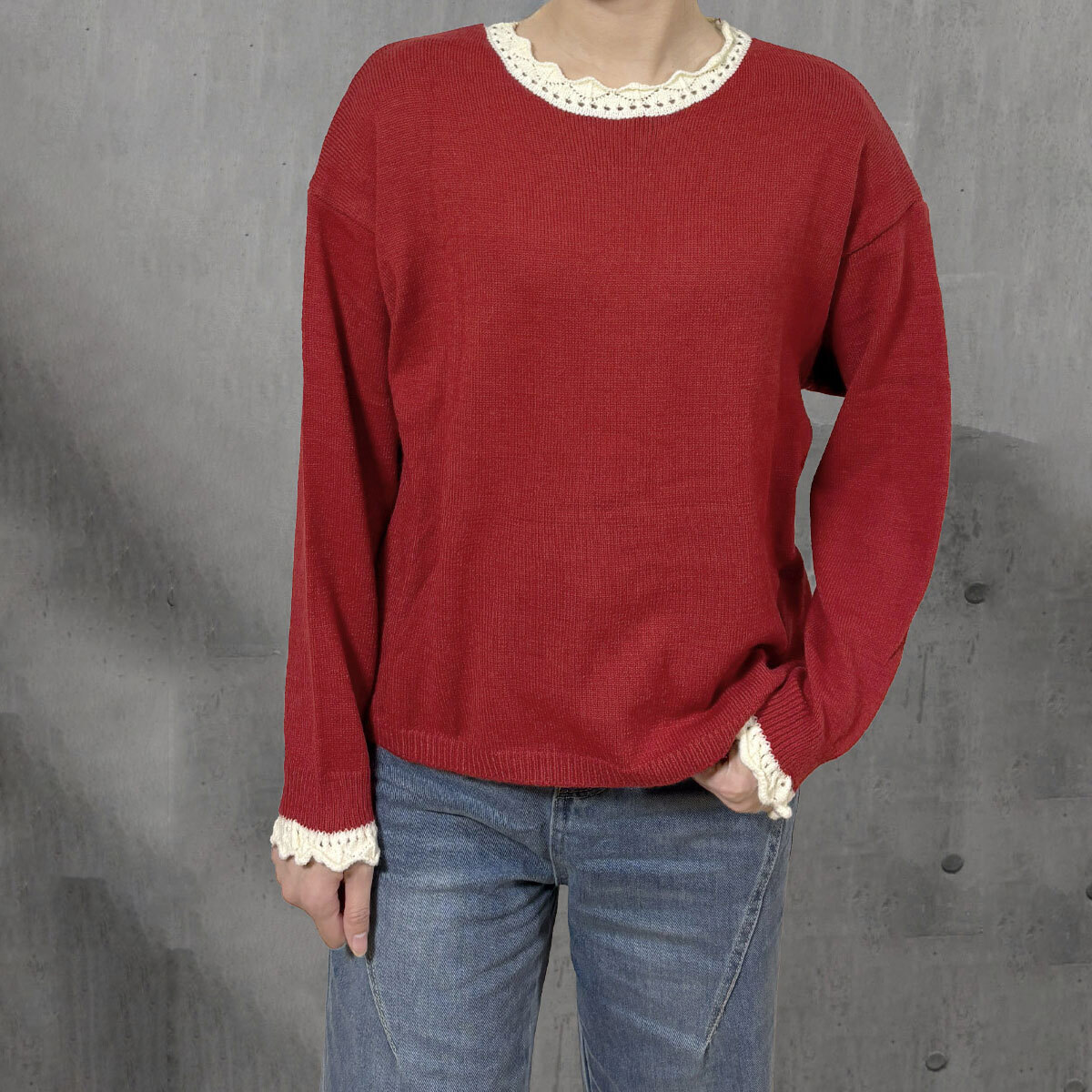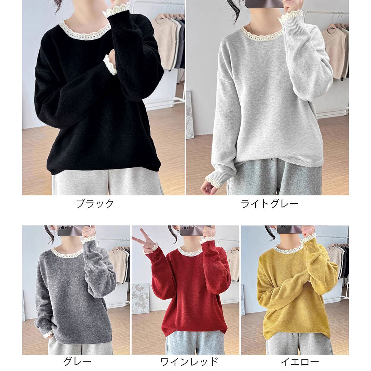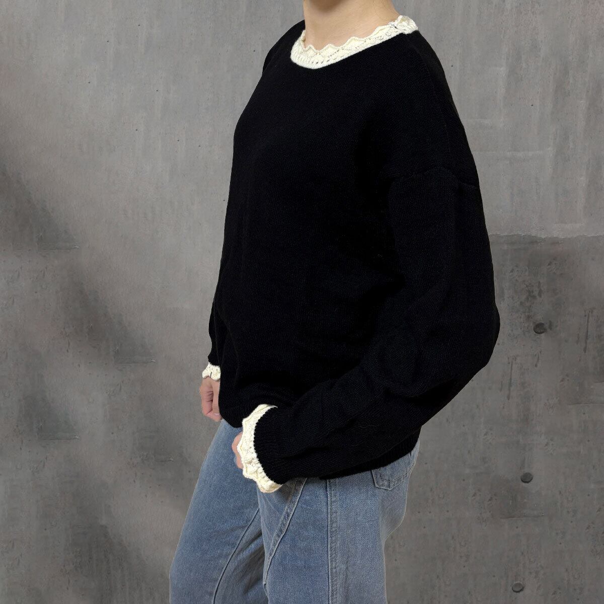襟元と袖口に配色の切り替えデザインを施し、シンプルながらもお洒落感と女性らしさをプラスした長袖のニットセーターです。