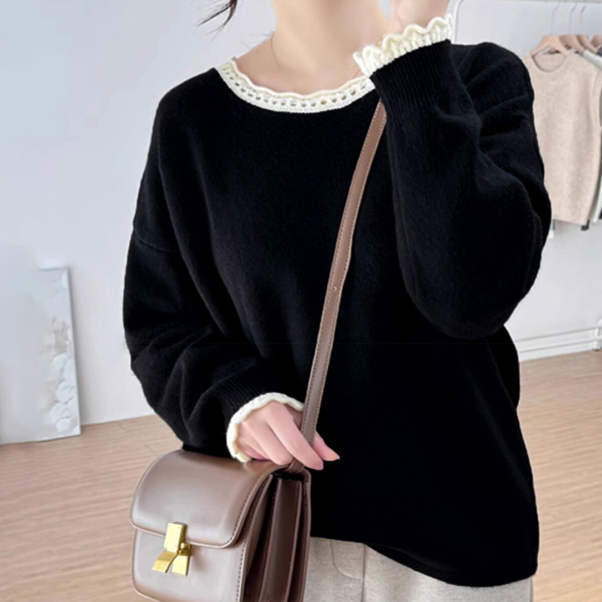 ◇衿と袖口に配色切り替えデザインを施したニットセーター。