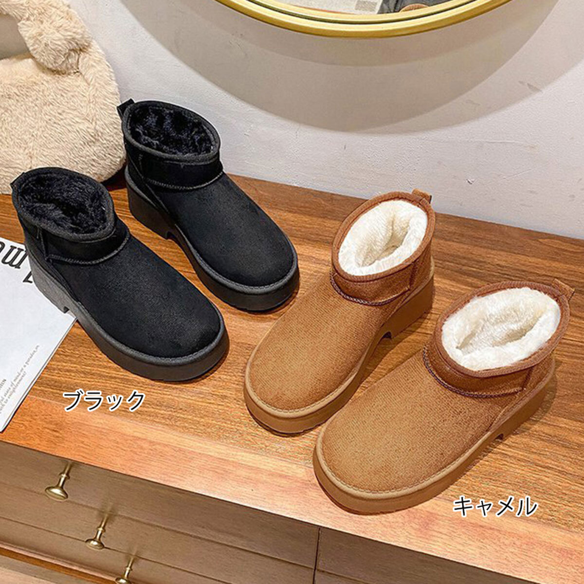 ◇ふわふわの裏ボア素材を使用した厚底ムートンブーツ。