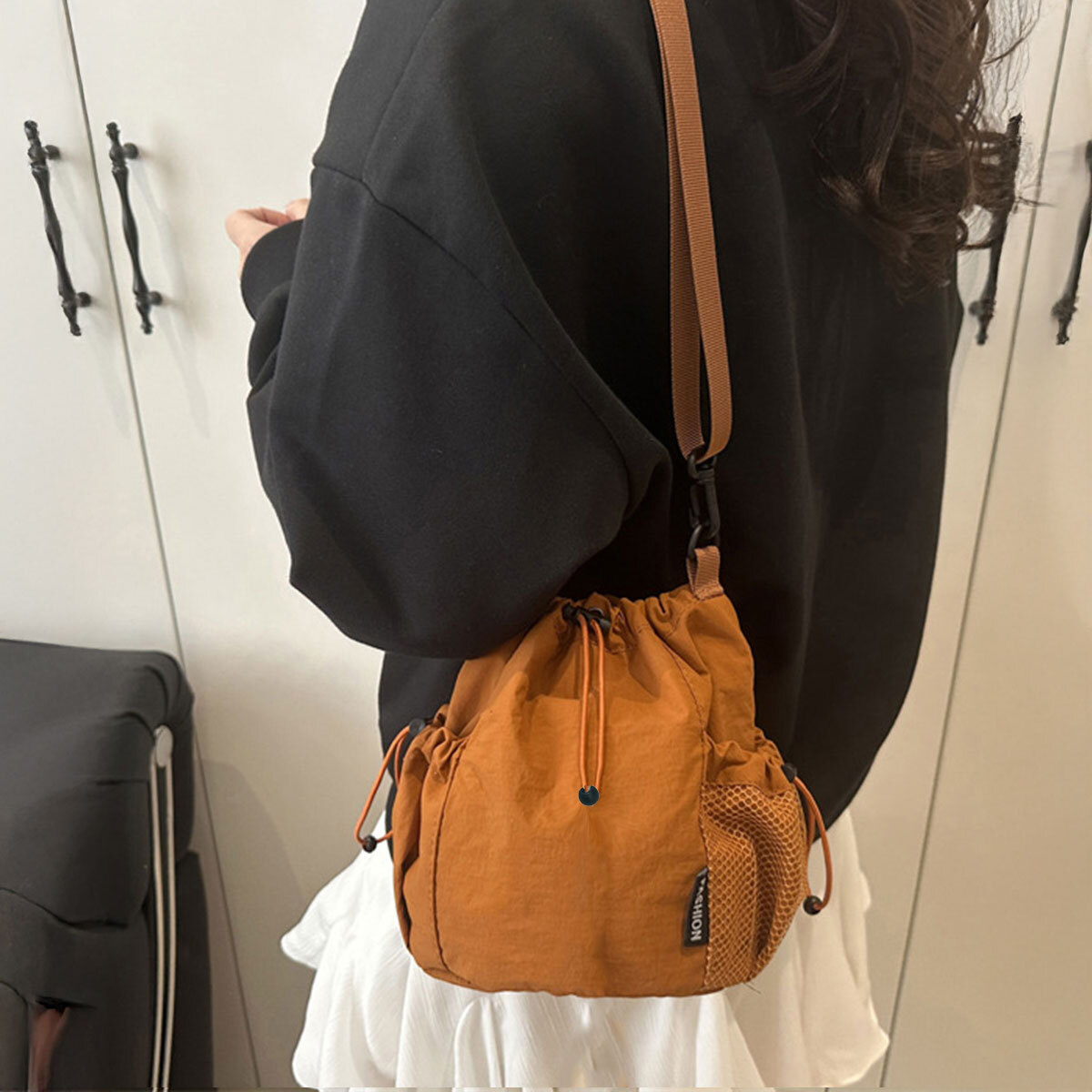 トレンド感のあるドローストリングデザインと、軽量でコンパクトなサイズ感が魅力的なショルダーバケットバッグです。