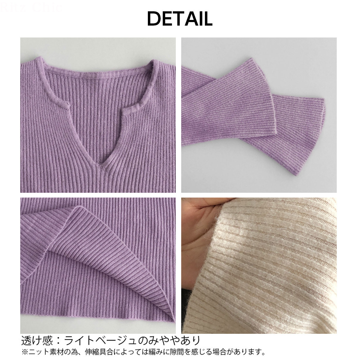 キーネックデザインが首周りをすっきりと見せ、縦のリブ編みが美しいシルエットを演出してくれる大人女子にぴったりの1着です。