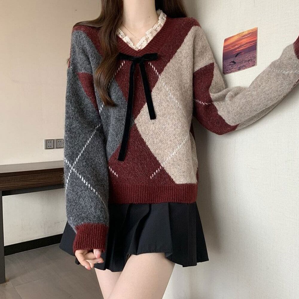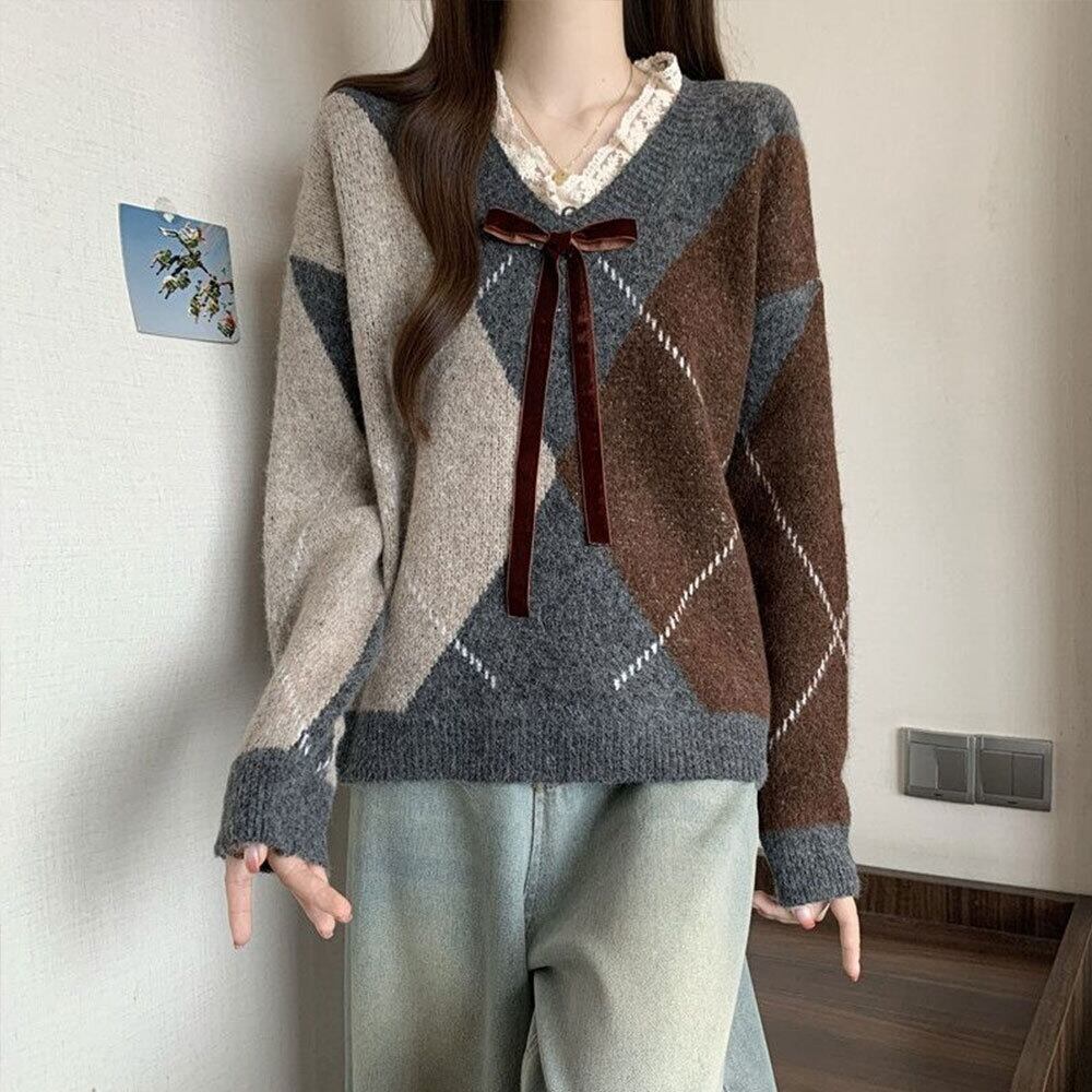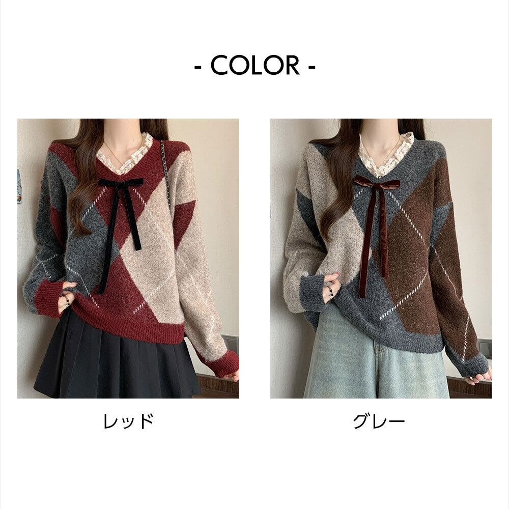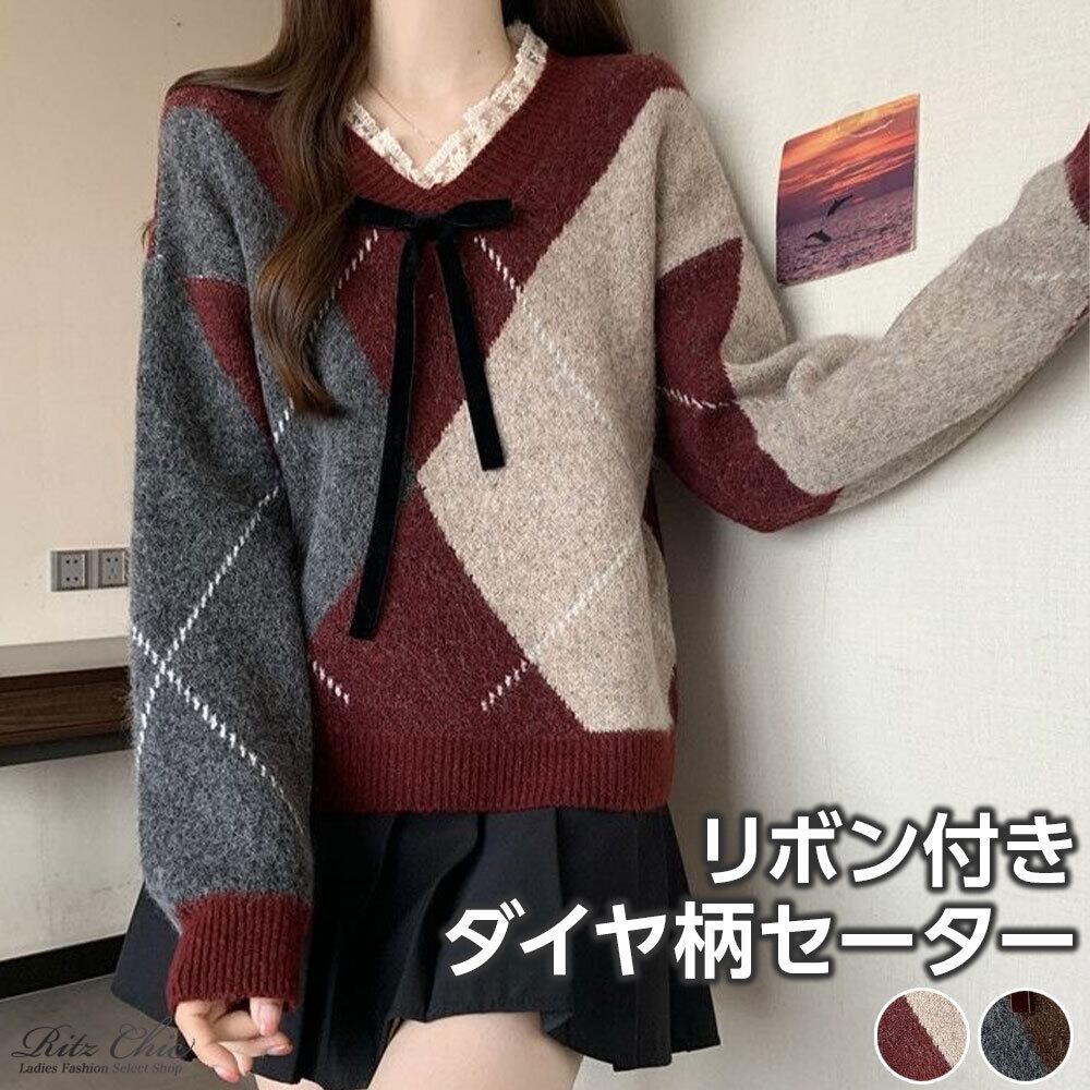 【送料無料】 ダイヤ柄 ニット セーター 長袖 Vネック レディース 春秋冬 韓国 大人 かわいい リボン付き レースネック おしゃれ きれいめ レトロ ゆったり リラックス 大人可愛い 大人女子